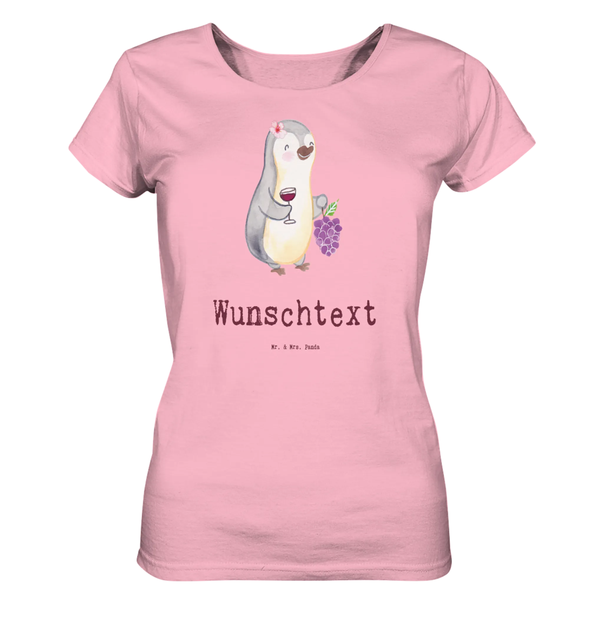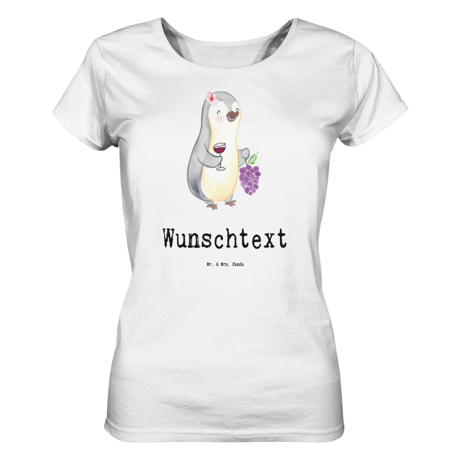 Das personalisierte Shirt für Damen mit dem liebevollen Motiv 'Weinhändlerin mit Herz' ist das perfekte Geschenk für alle Weinliebhaberinnen in deinem Leben. Egal, ob als Überraschung zum Geburtstag, zum Jubiläum oder als lustiges Mitbringsel zur Feier eines Junggesellenabschieds – dieses Shirt sorgt für ein Lächeln! Die hübsche Gestaltung zeigt einen fröhlichen Pinguin, der mit Weintrauben in der einen Hand und einem gefüllten Glas Wein in der anderen Hand präsent ist.