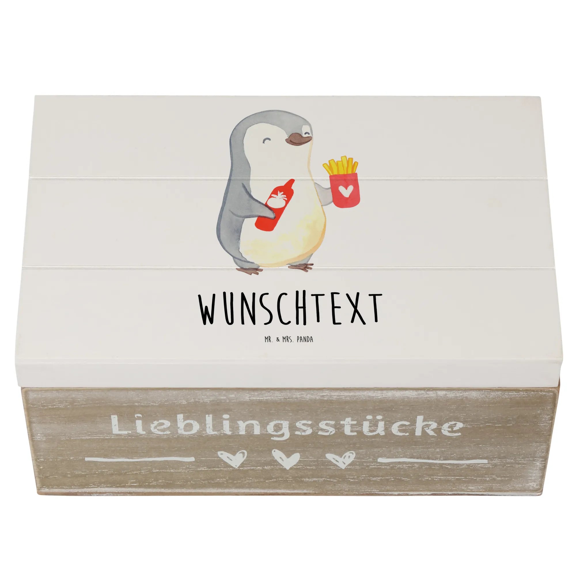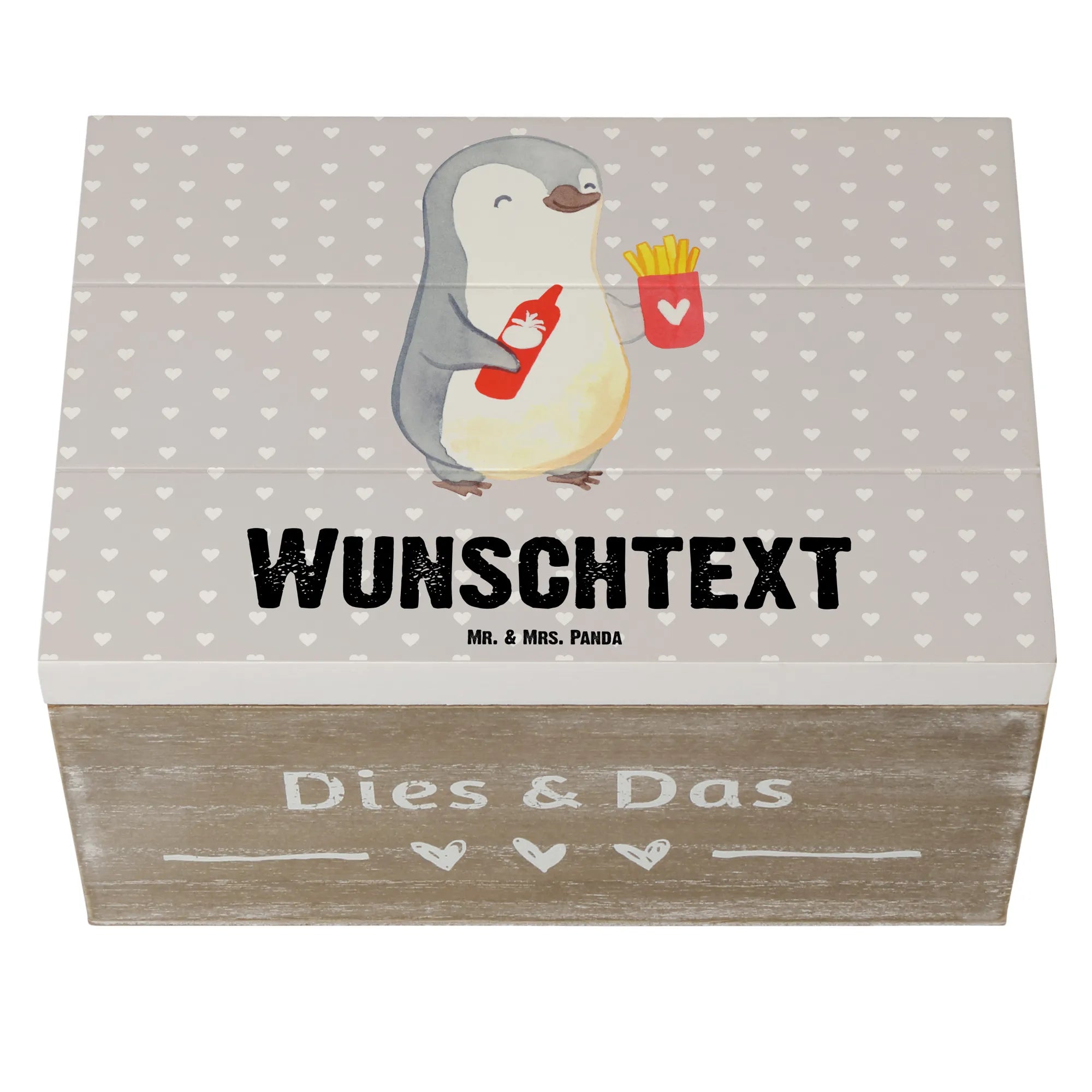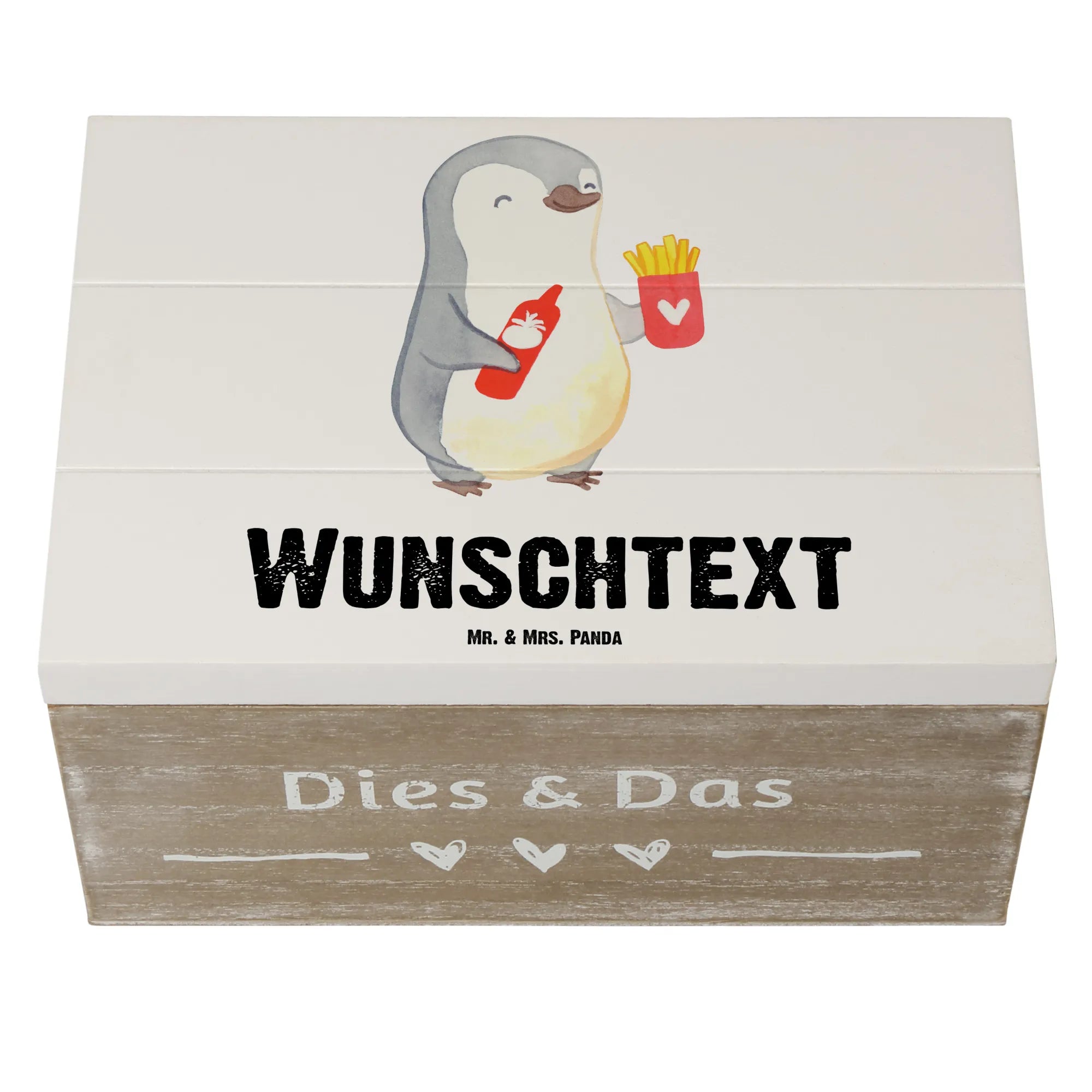 Entdecke die wunderbare personalisierte Holzkiste von Mr. & Mrs. Panda – ein einzigartiges Geschenk für alle Verliebten und ein echter Schatz für besondere Erinnerungen. Diese wunderschöne Kiste ist mit dem liebevollen Motiv eines Pinguins, der Pommes Frites mit Ketchup in den Flügeln hält, gestaltet. Der Pinguin strahlt Freude und Liebe aus und begleitet den Slogan "Mit dir würde ich sogar meine Pommes teilen.".
