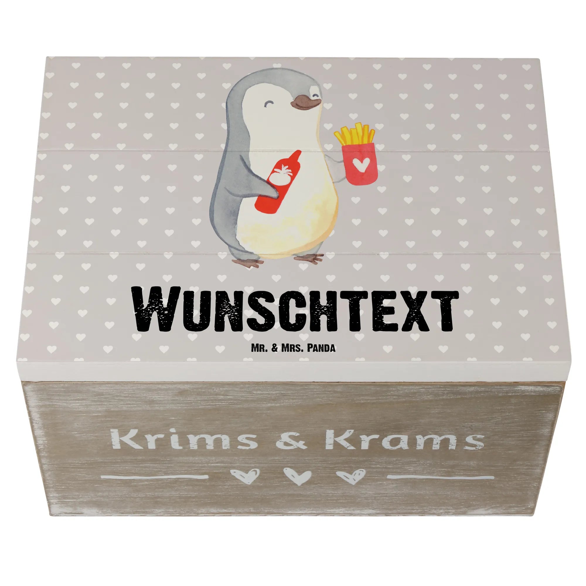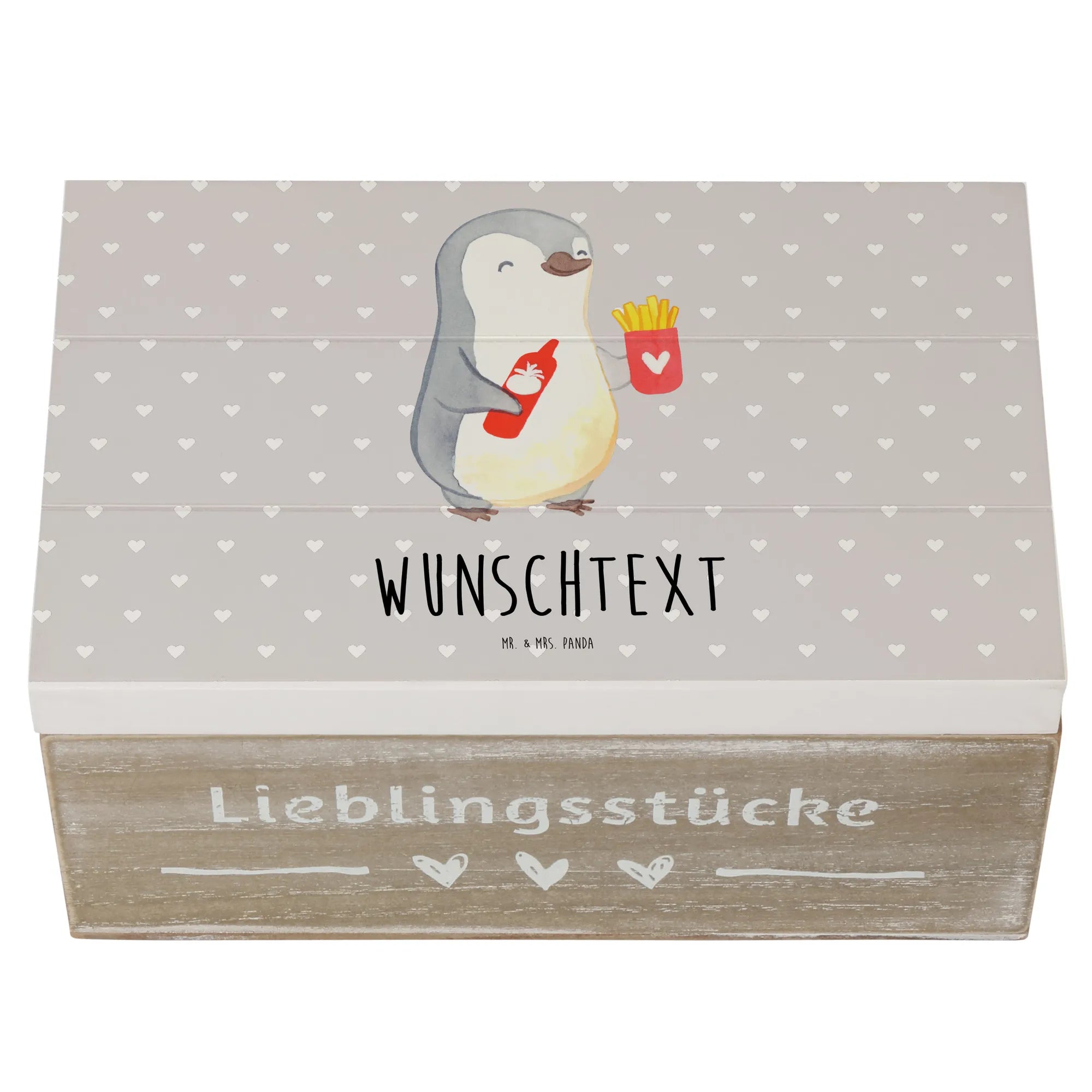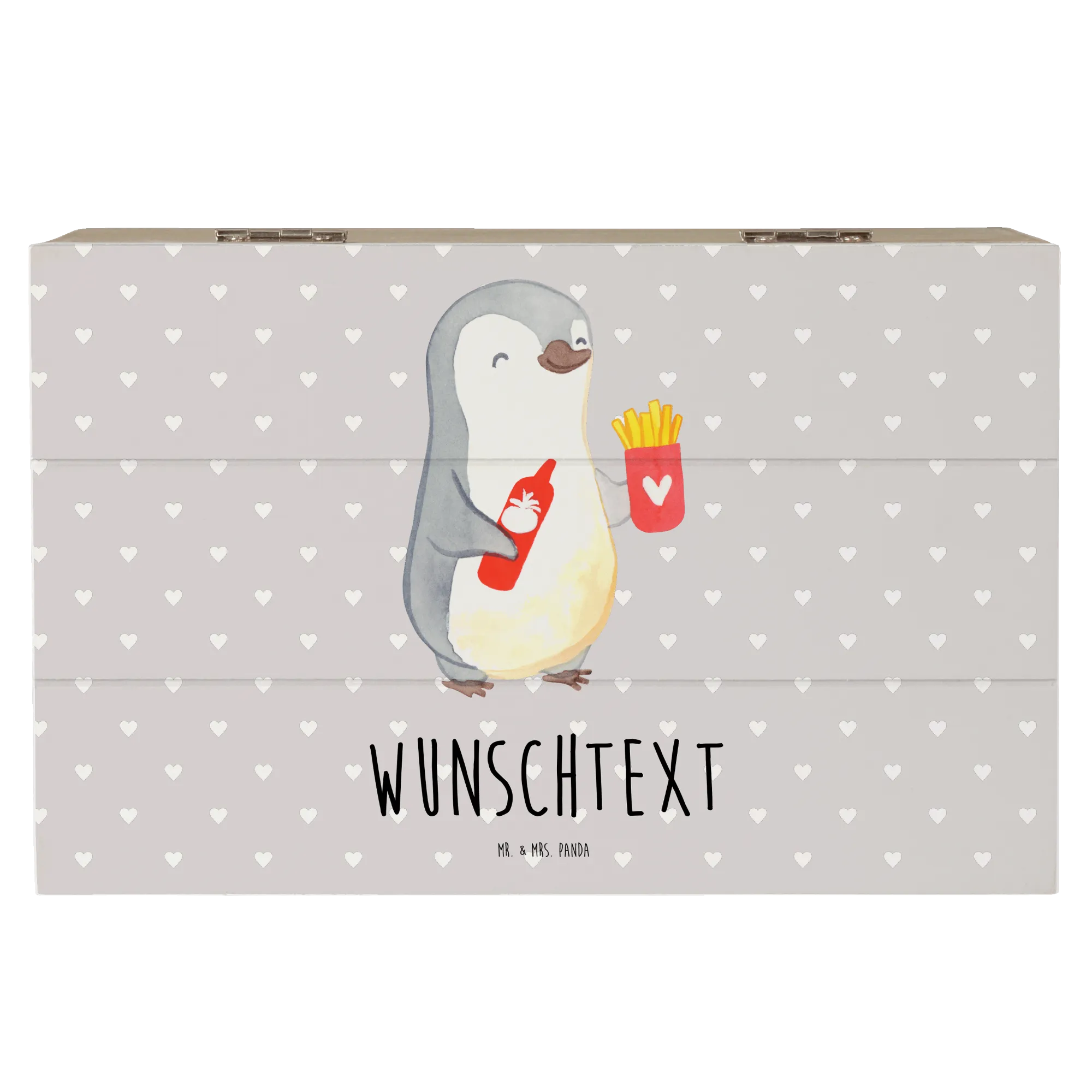 Entdecke die wunderbare personalisierte Holzkiste von Mr. & Mrs. Panda – ein einzigartiges Geschenk für alle Verliebten und ein echter Schatz für besondere Erinnerungen. Diese wunderschöne Kiste ist mit dem liebevollen Motiv eines Pinguins, der Pommes Frites mit Ketchup in den Flügeln hält, gestaltet. Der Pinguin strahlt Freude und Liebe aus und begleitet den Slogan "Mit dir würde ich sogar meine Pommes teilen.".