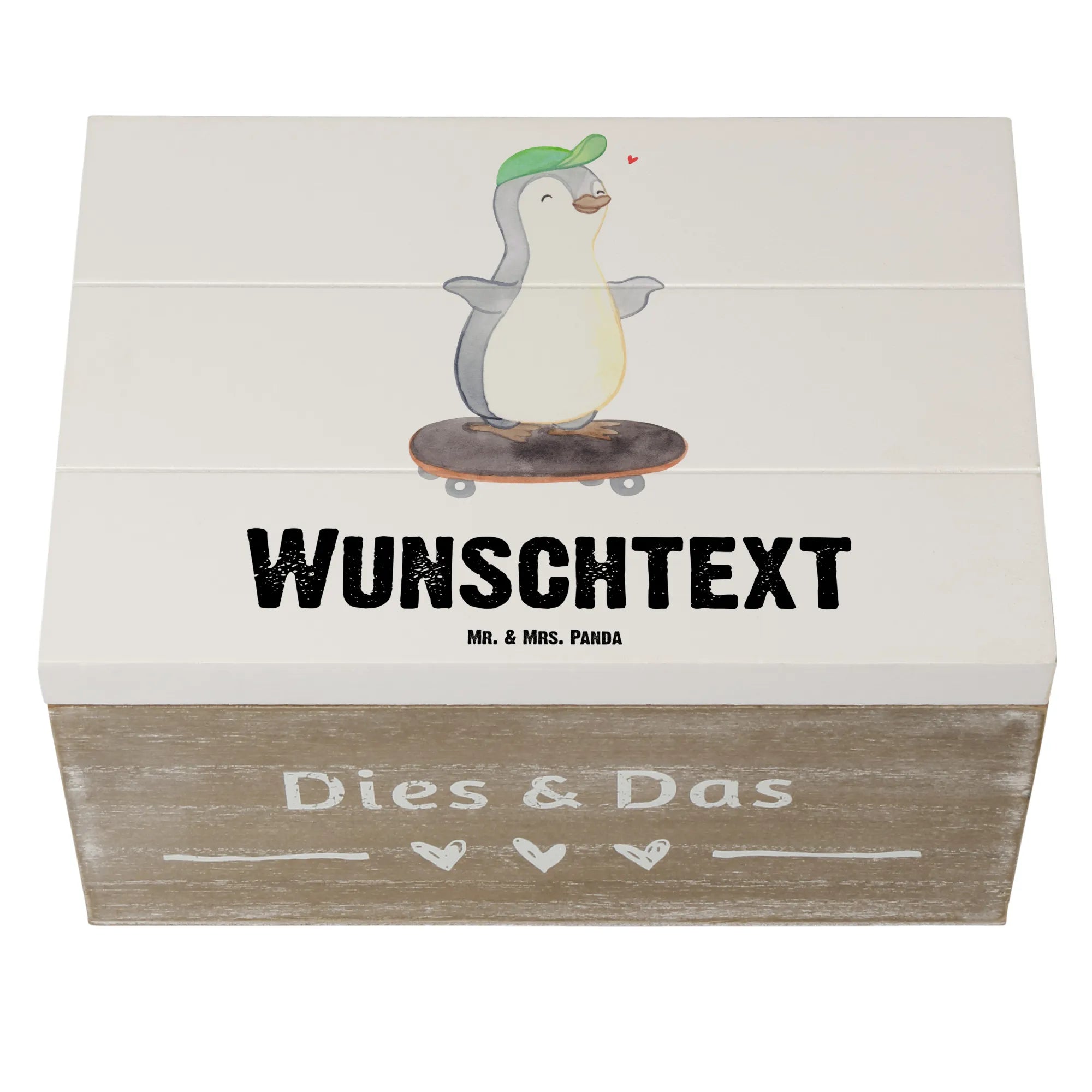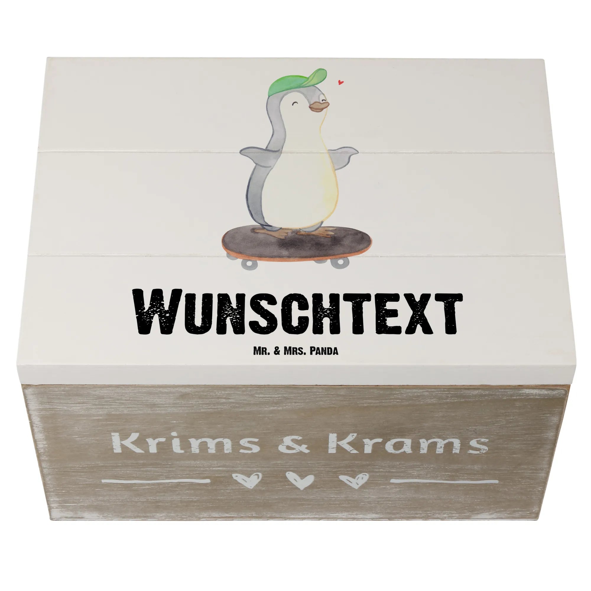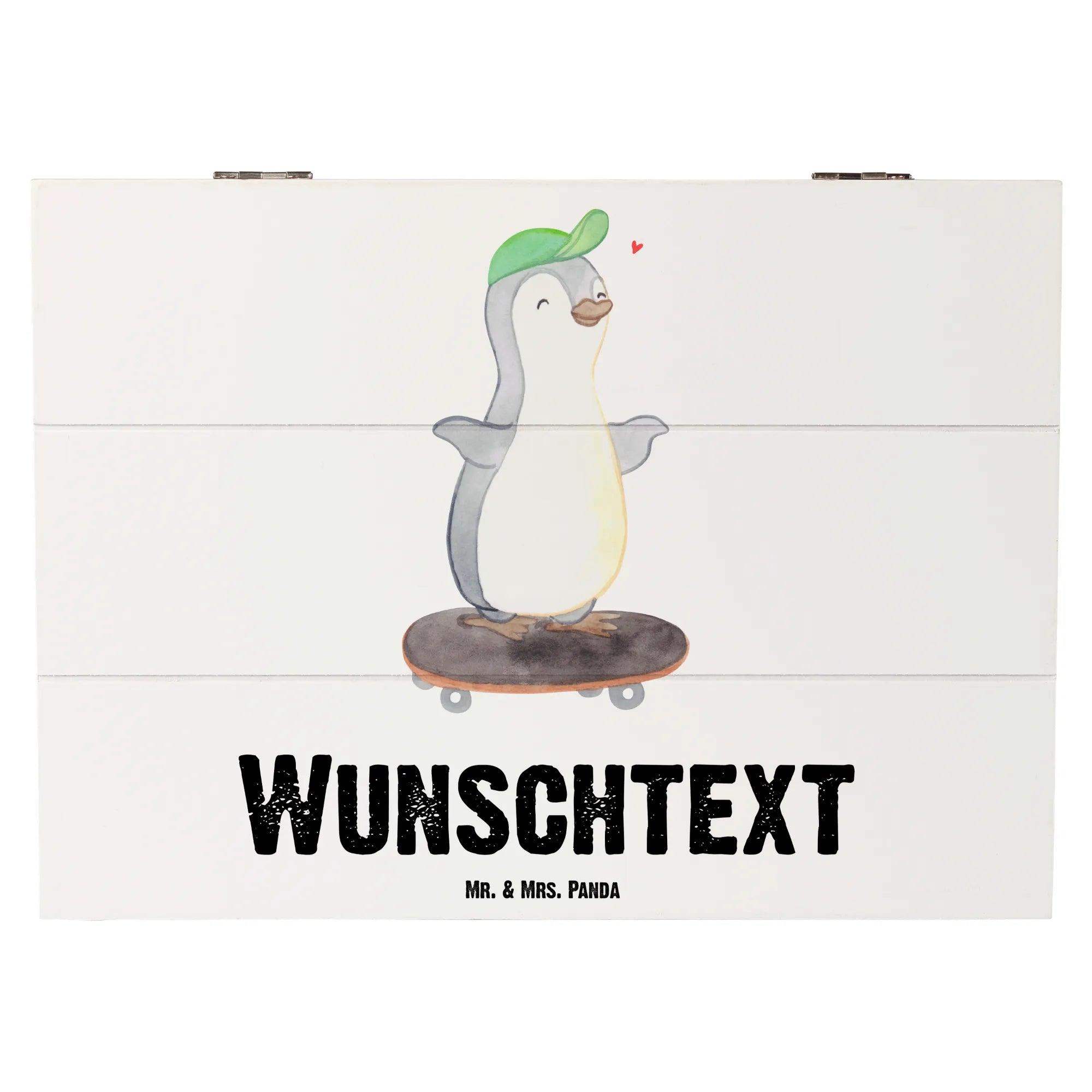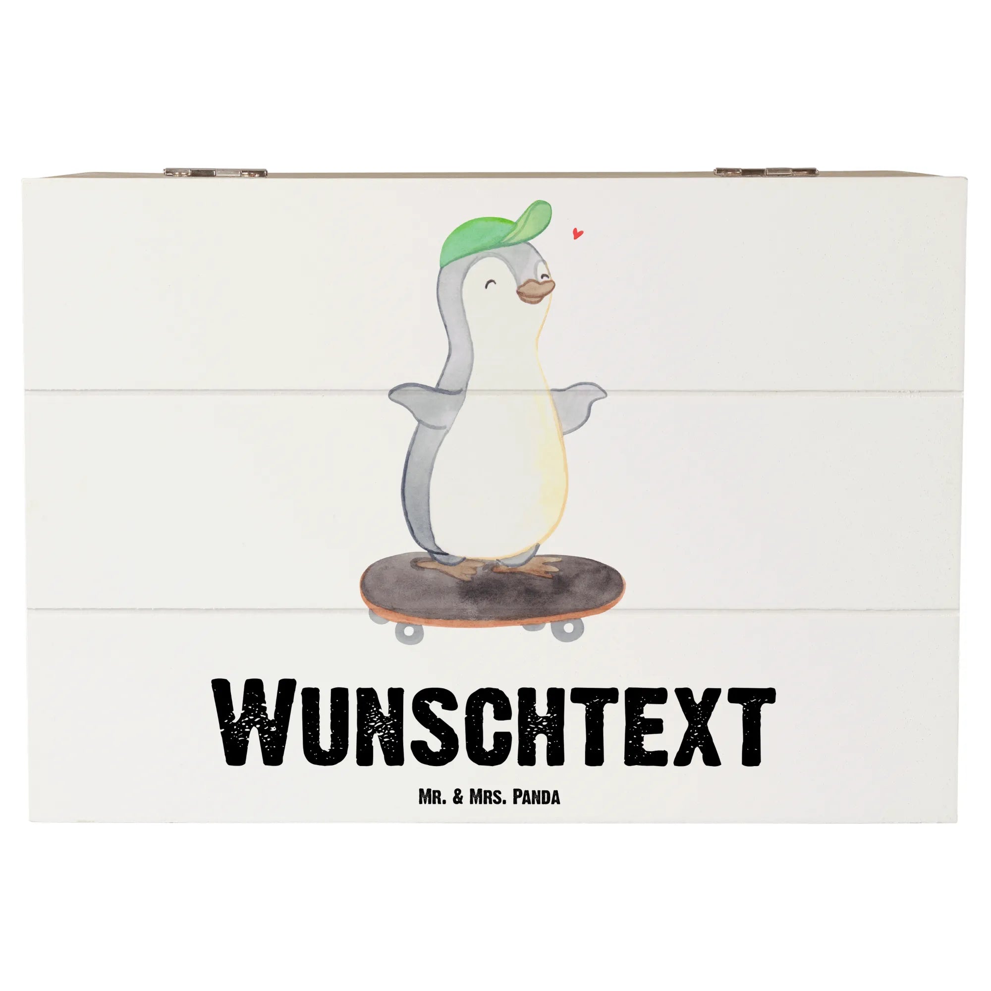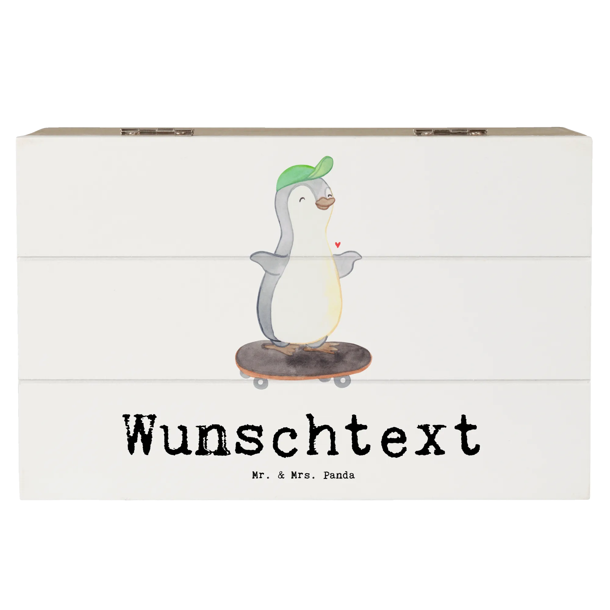 Personalizowane drewniane pudełko Pingwin jazda na deskorolce - 22 x 15 cm - biały