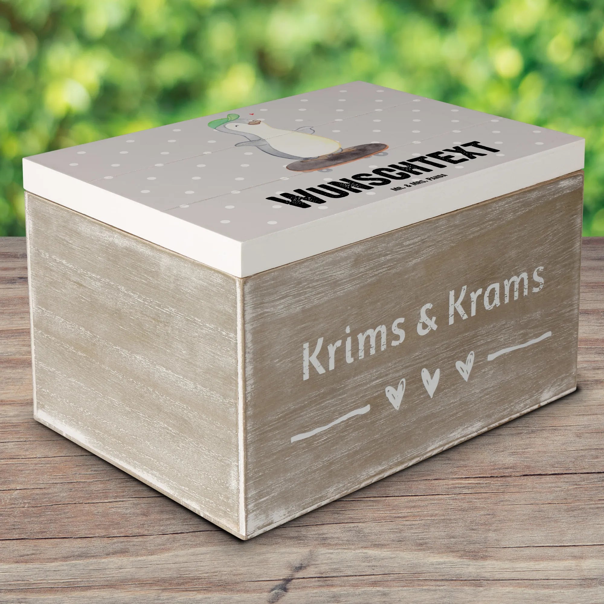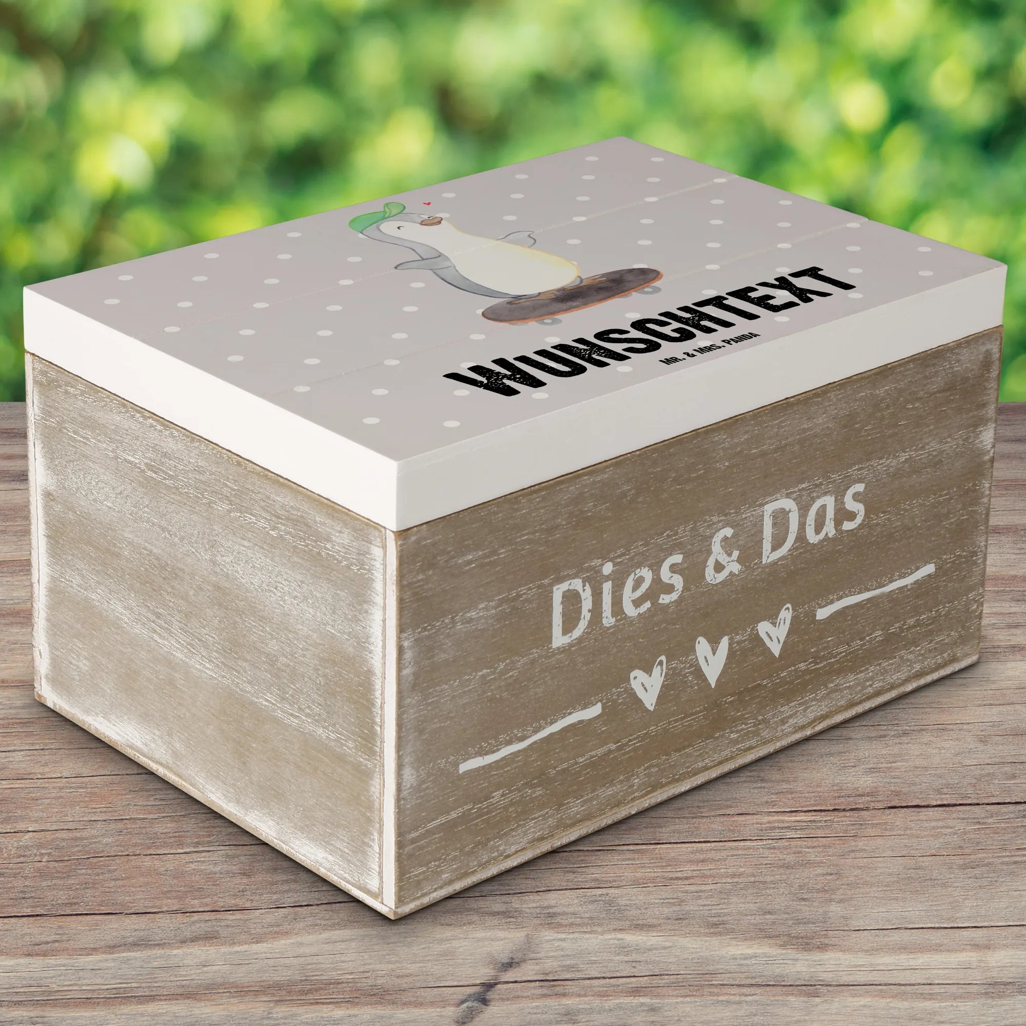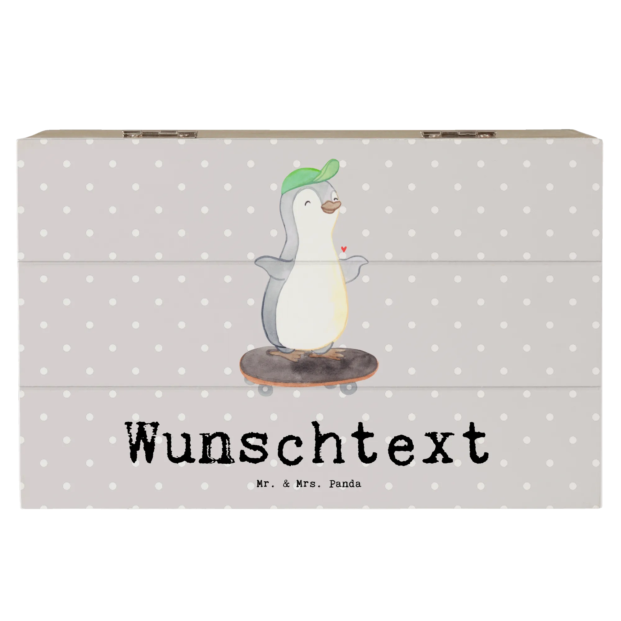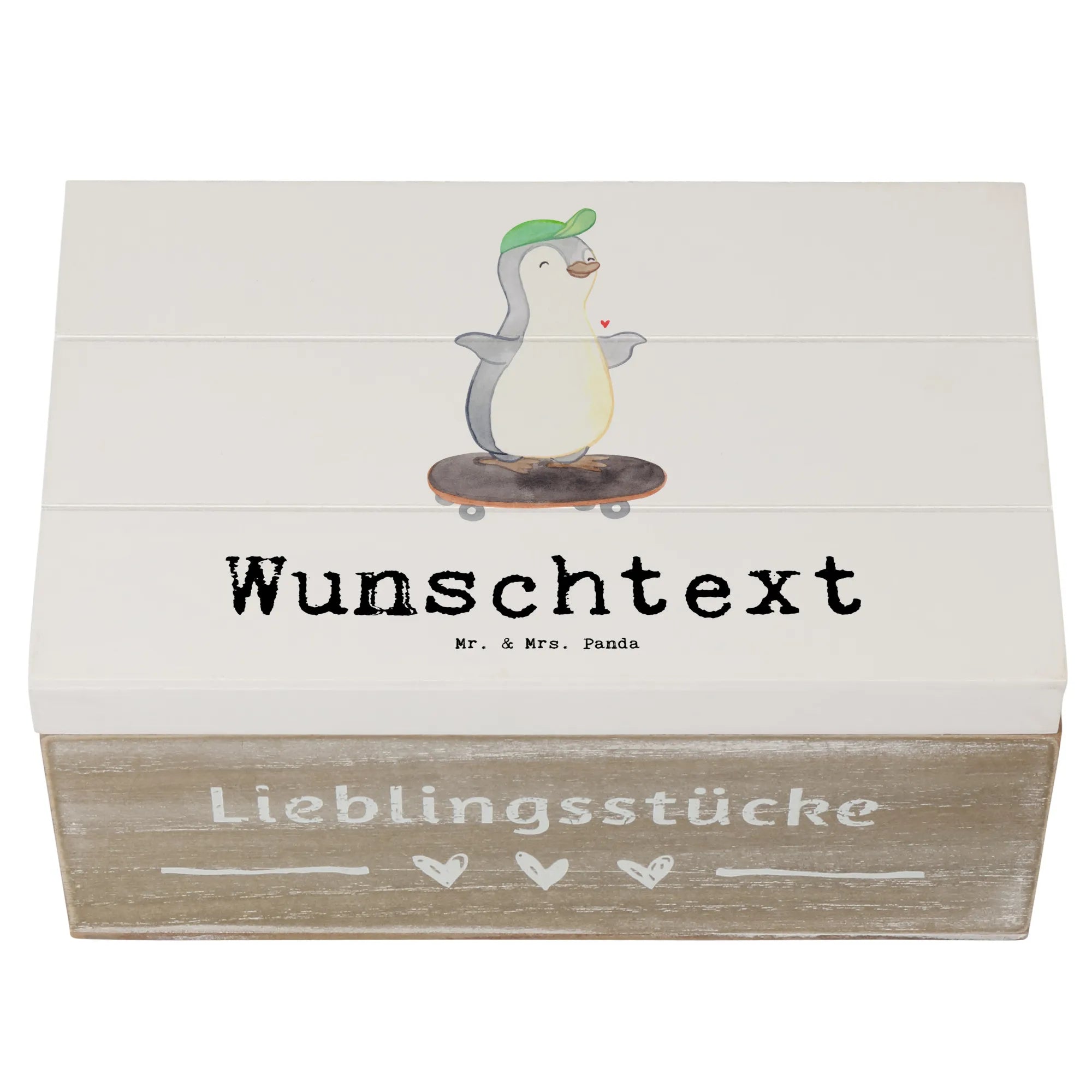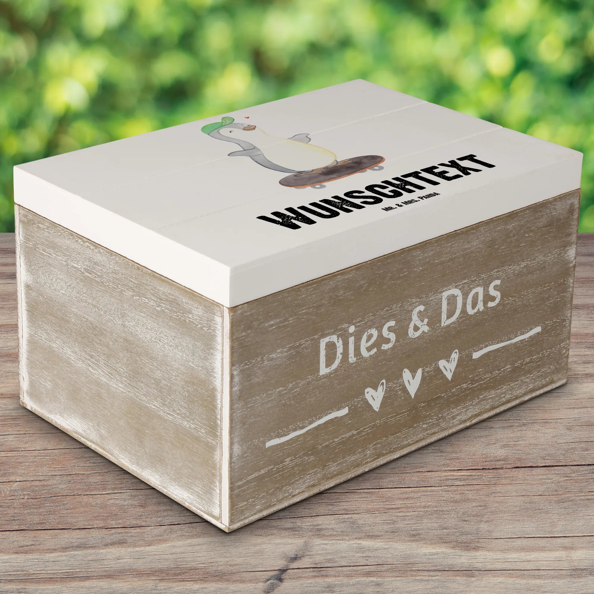 Personalizowane drewniane pudełko Pingwin jazda na deskorolce - 22 x 15 cm - biały