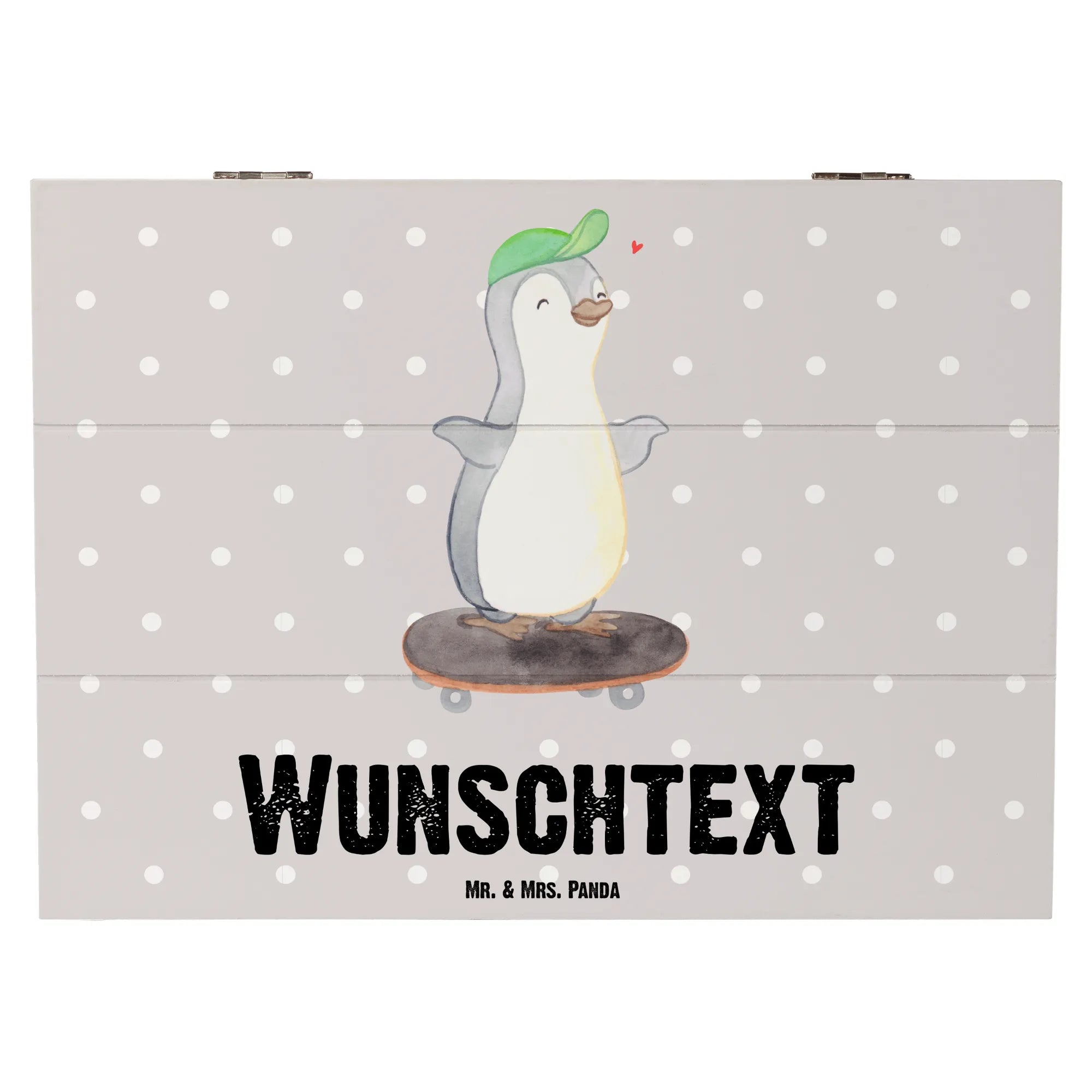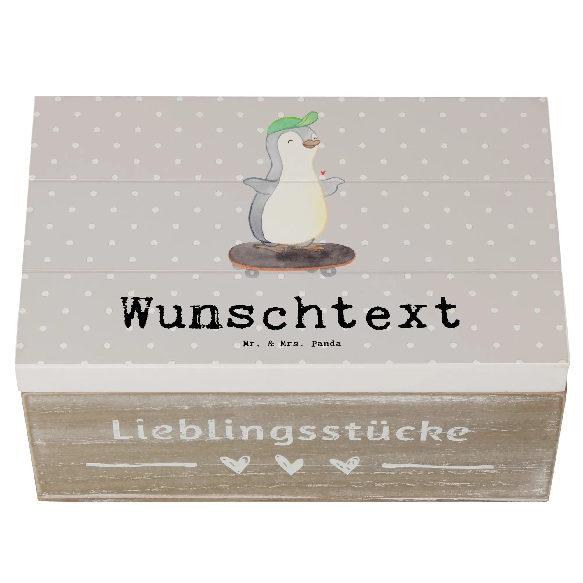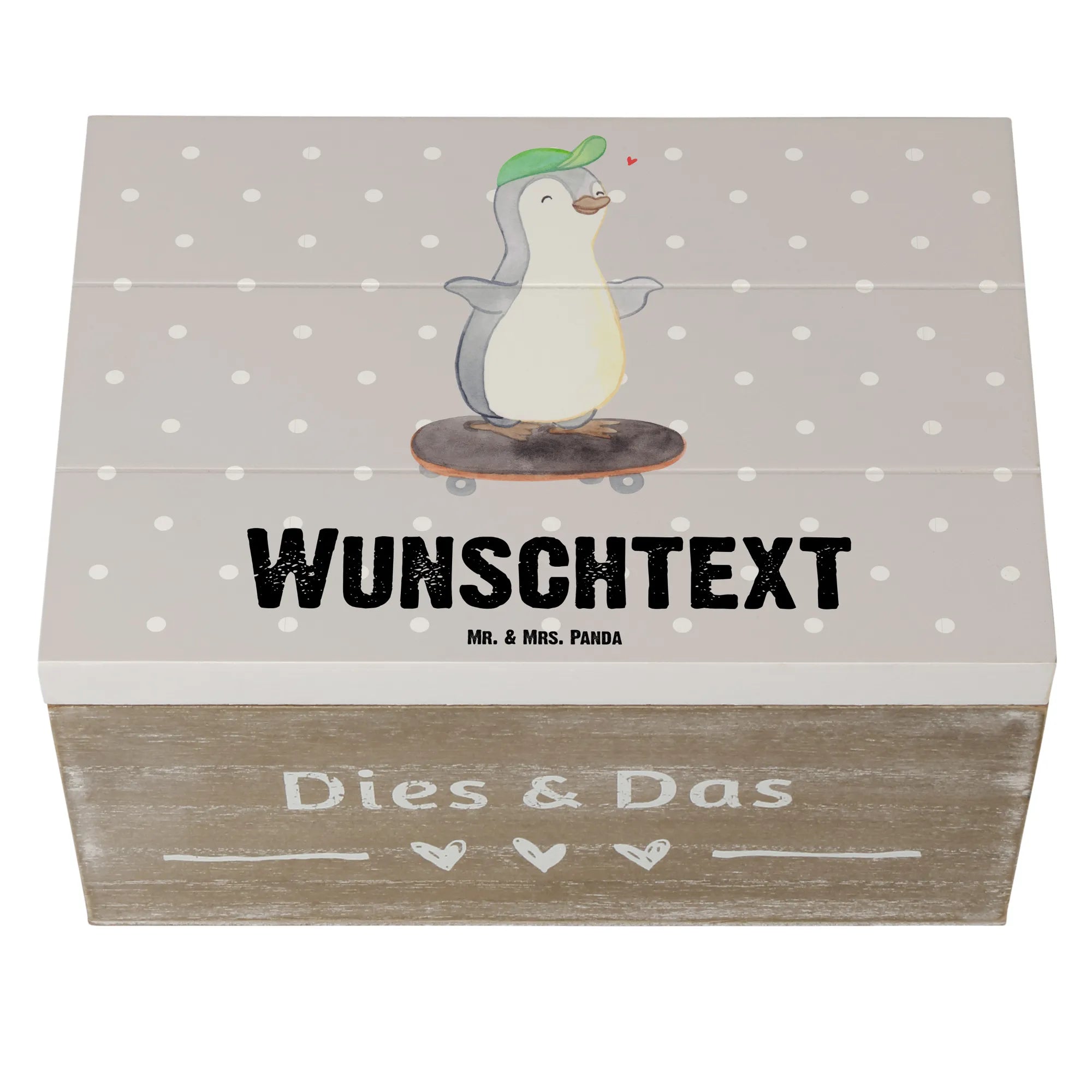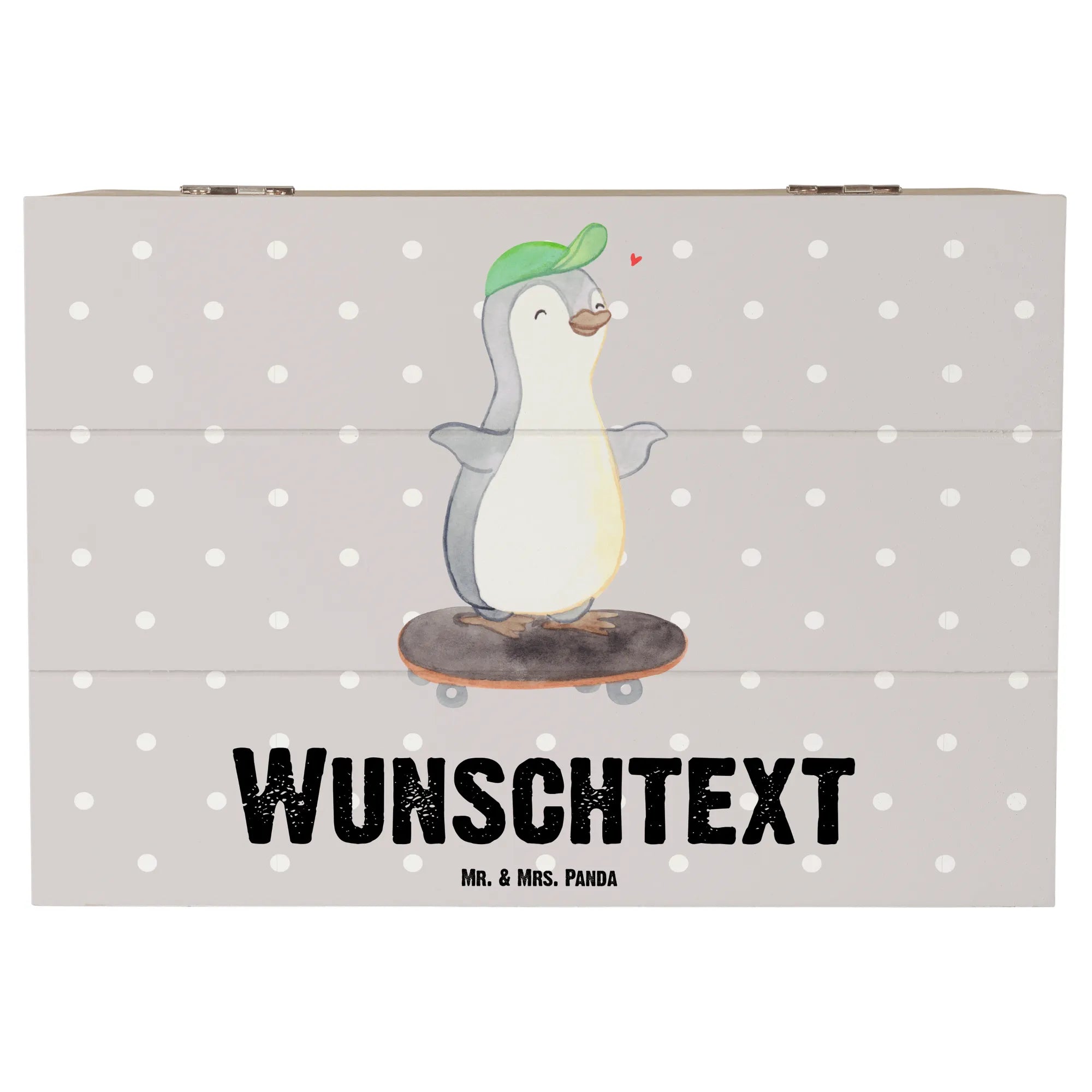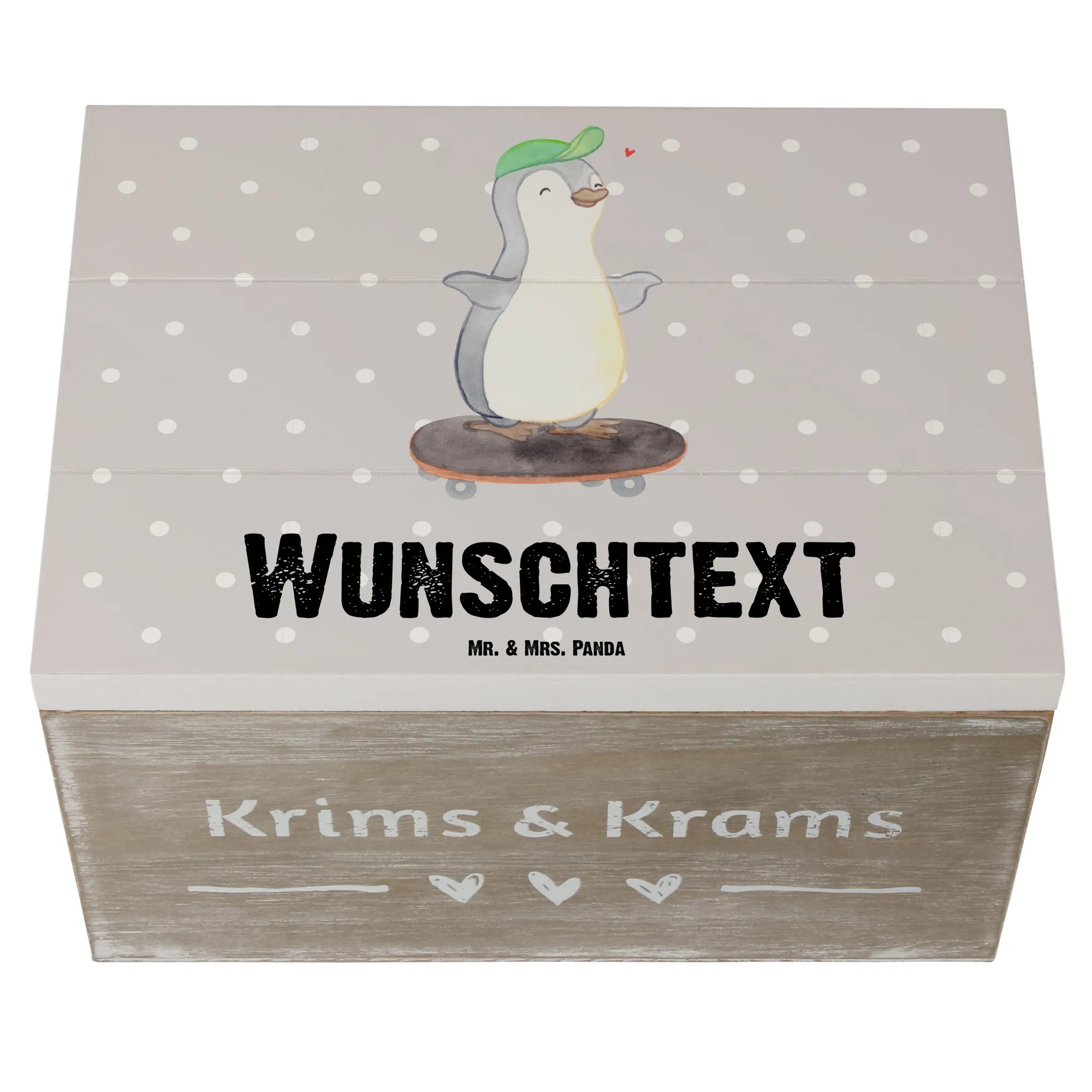 Personalizowane drewniane pudełko Pingwin jazda na deskorolce - 22 x 15 cm - biały