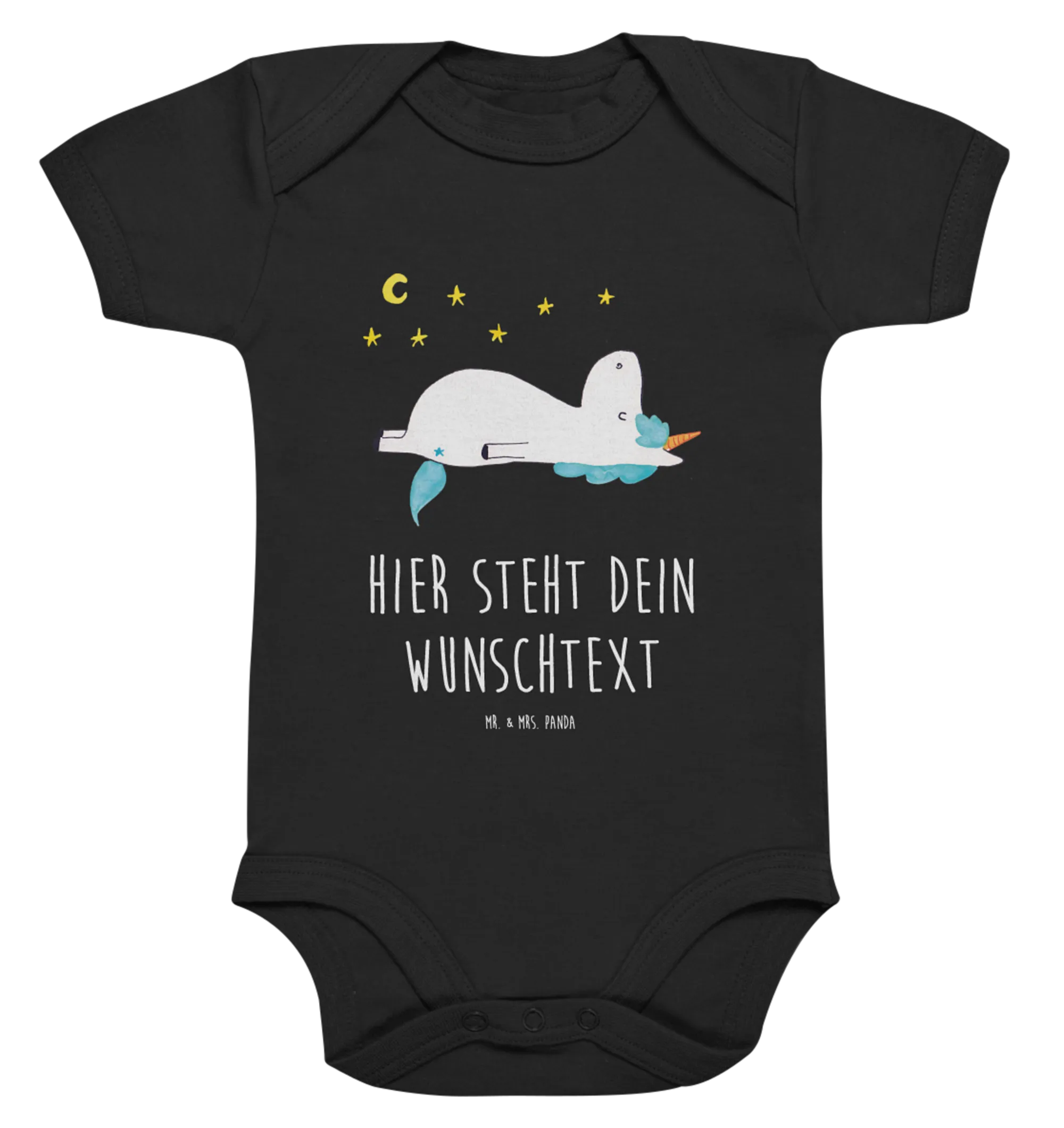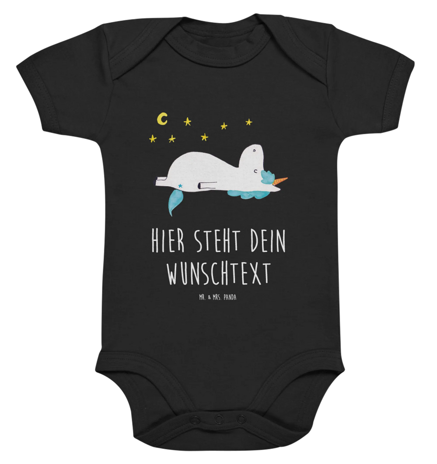Das niedliche Einhorn, das den Sternenhimmel betrachtet, steht für die unendlichen Möglichkeiten, die das Leben für dein Baby bereithält. Qualität, die man fühlt, und Design, das begeistert – das ist der personalisierte Baby Body von Mr. & Mrs. Panda.