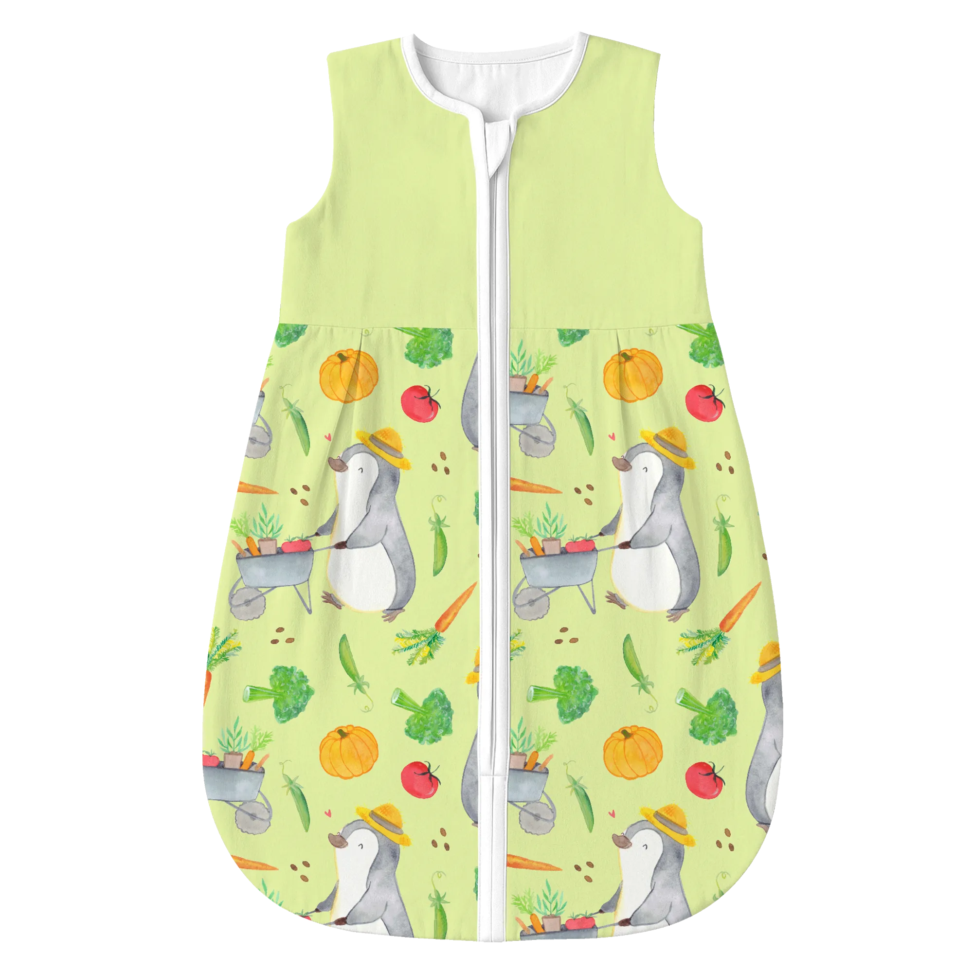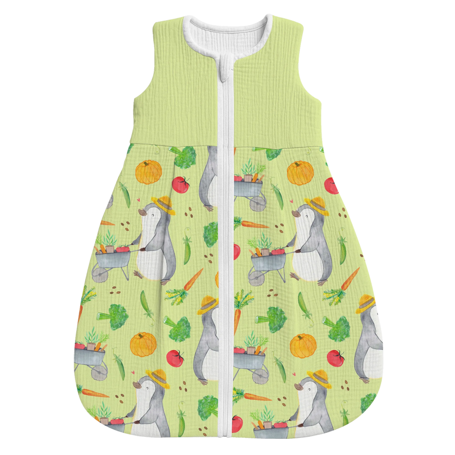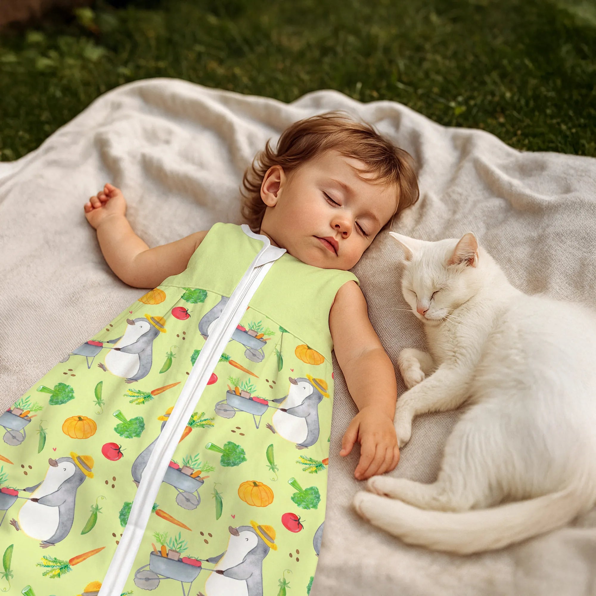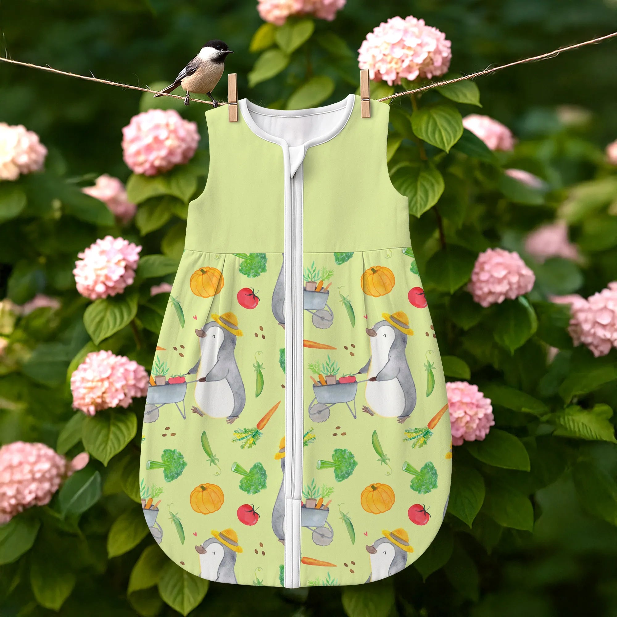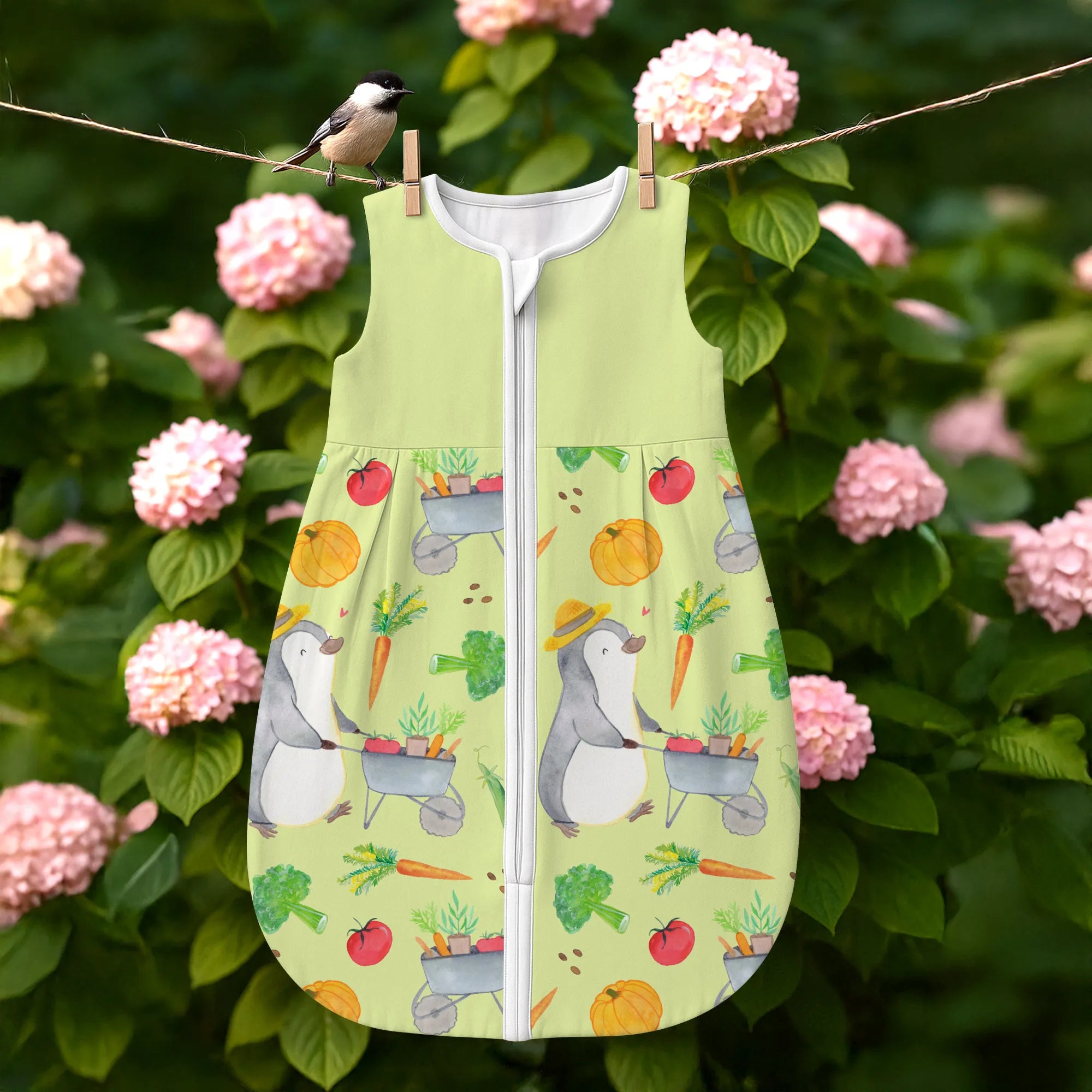 Unser Schlafsack Baby mit dem entzückenden Pinguin-Motiv aus der Hobby & Sport Kollektion ist mehr als nur eine Schlafbekleidung; es ist ein liebevolles Versprechen für Geborgenheit und Wärme. Das Motiv zeigt einen kleinen, süßen Pinguin mit einem gelben Sonnenhut auf dem Kopf, der stolz eine Schubkarre voller frischem Gemüse schiebt. 🐧🥕 Es ist eine Hommage an die Gartenarbeit und das Gärtnern – Tätigkeiten, die so viel Ruhe und Freude schenken.