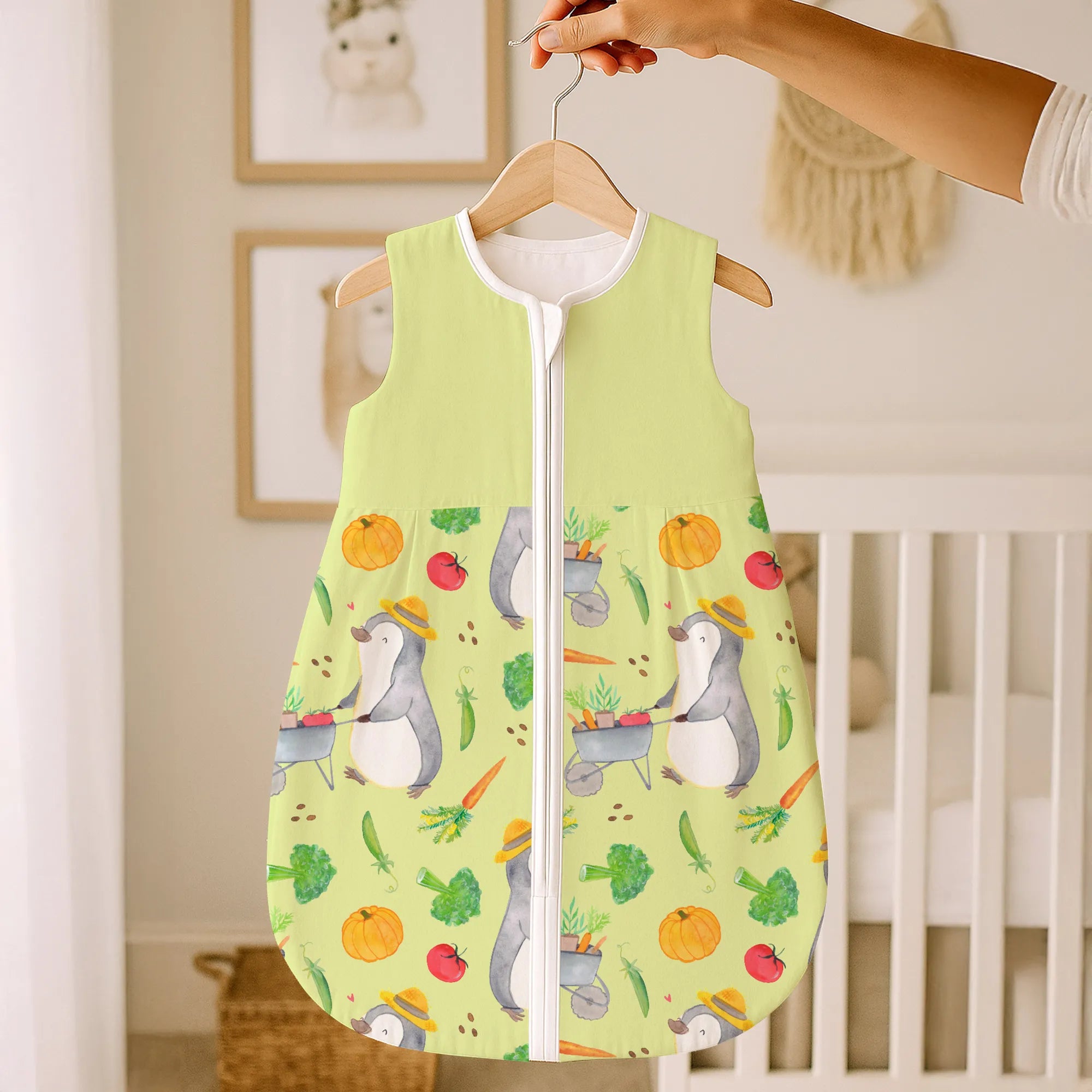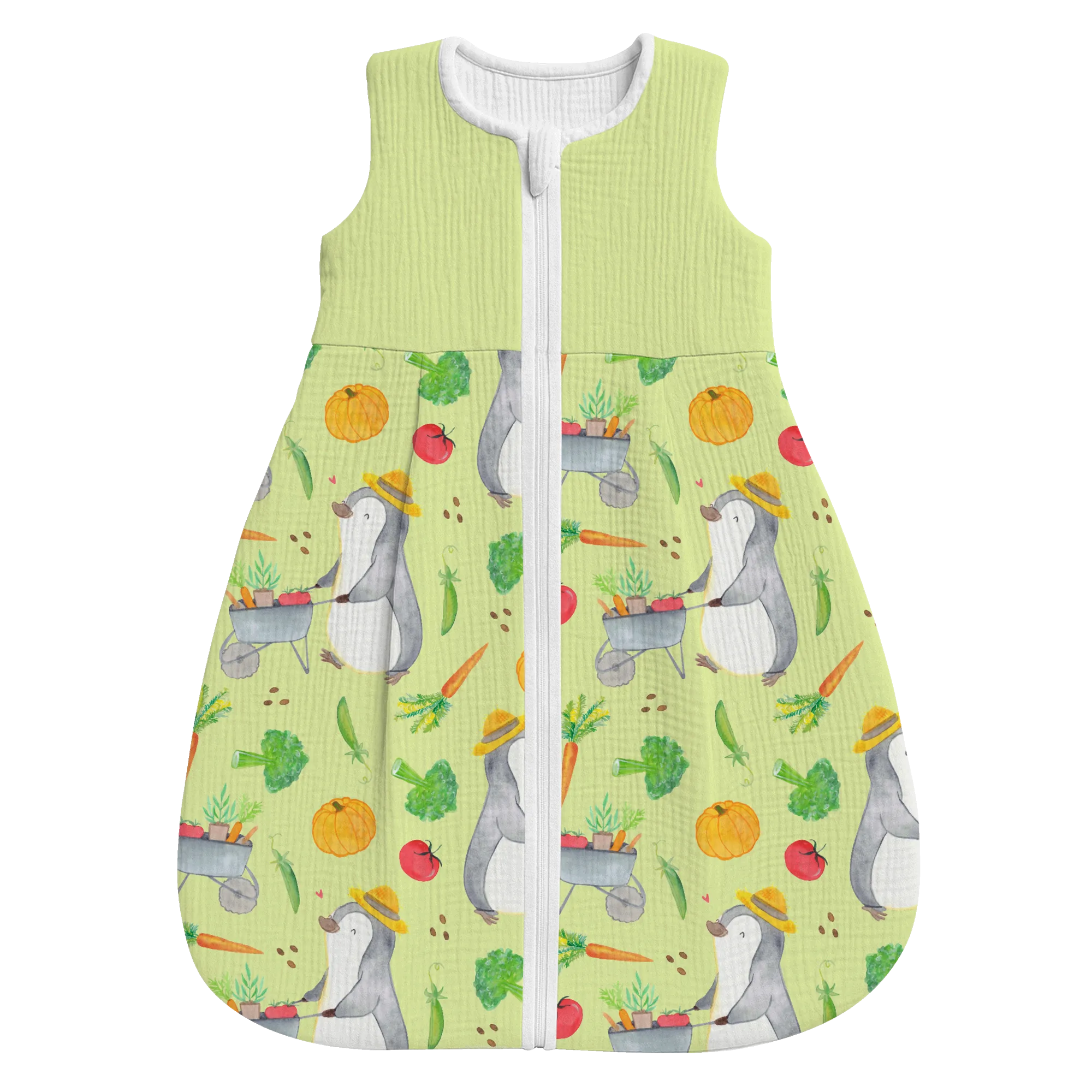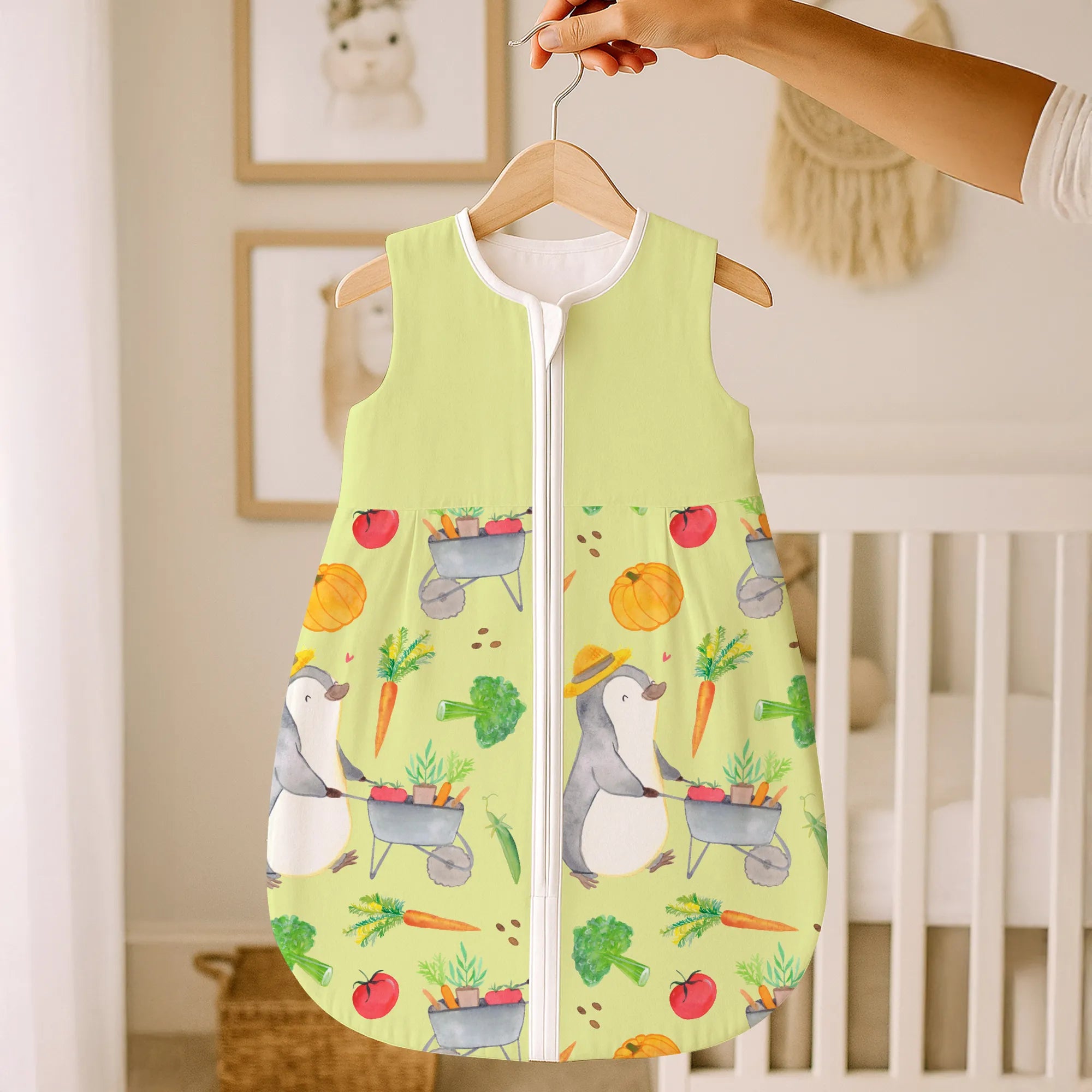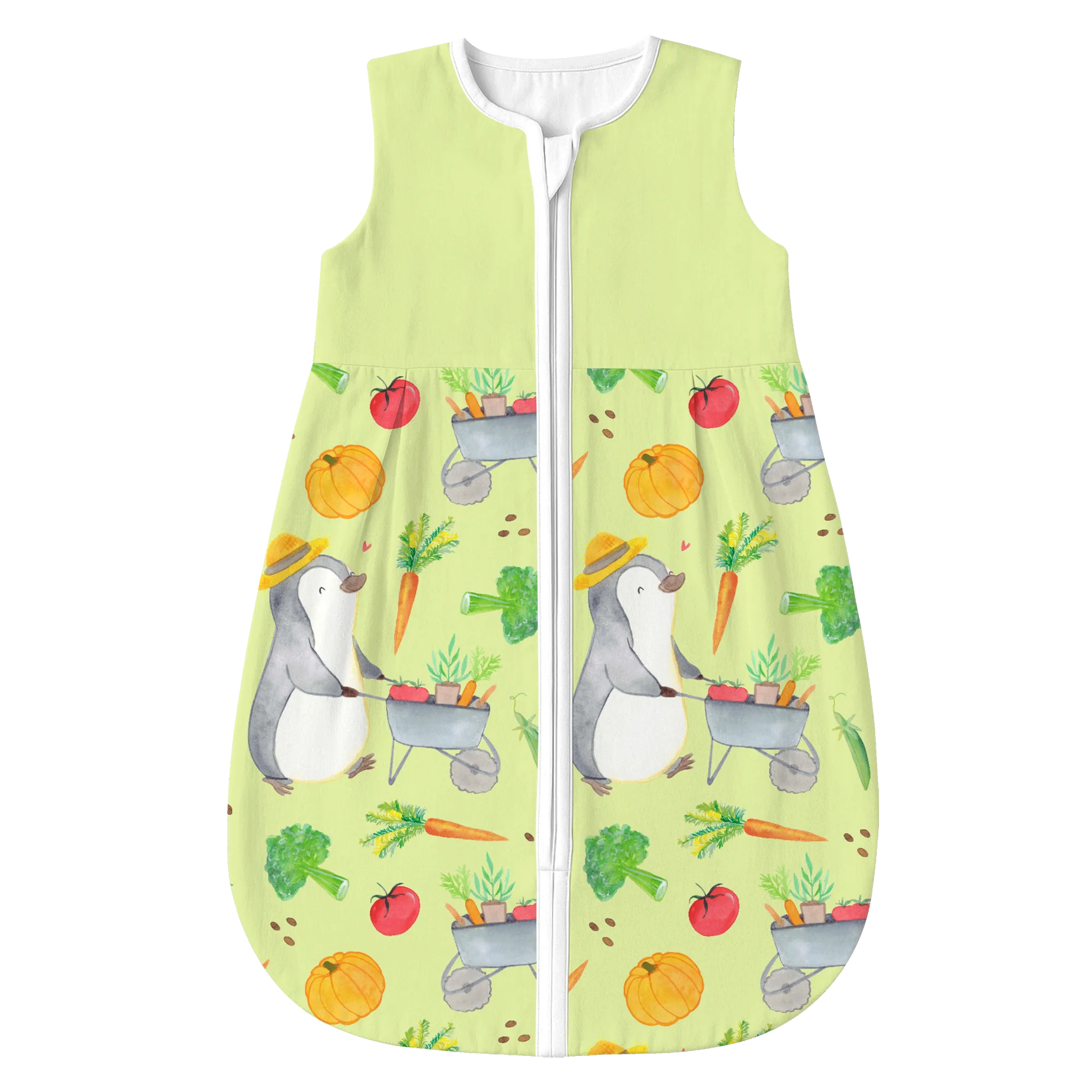 Unser Schlafsack Baby mit dem entzückenden Pinguin-Motiv aus der Hobby & Sport Kollektion ist mehr als nur eine Schlafbekleidung; es ist ein liebevolles Versprechen für Geborgenheit und Wärme. Das Motiv zeigt einen kleinen, süßen Pinguin mit einem gelben Sonnenhut auf dem Kopf, der stolz eine Schubkarre voller frischem Gemüse schiebt. 🐧🥕 Es ist eine Hommage an die Gartenarbeit und das Gärtnern – Tätigkeiten, die so viel Ruhe und Freude schenken.
