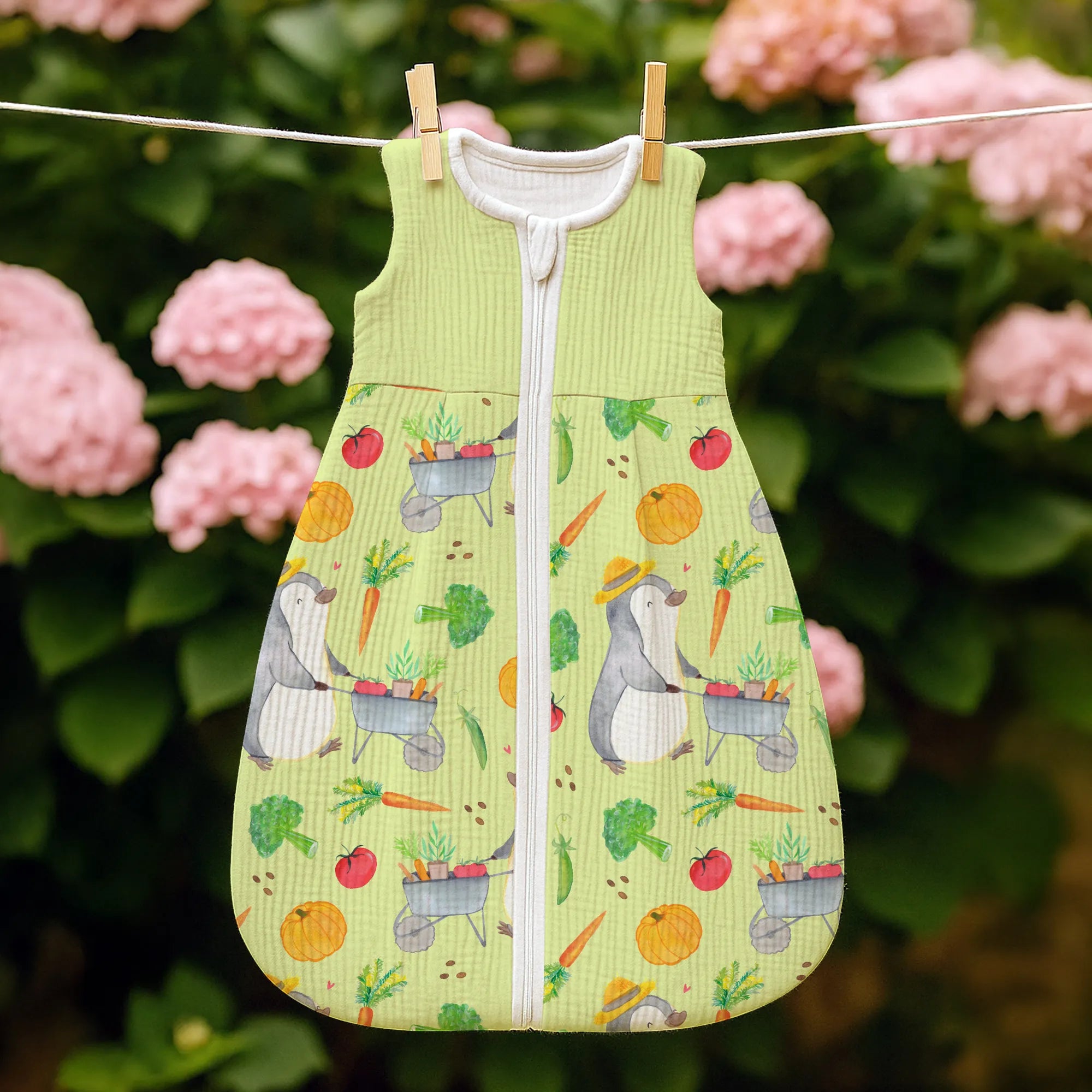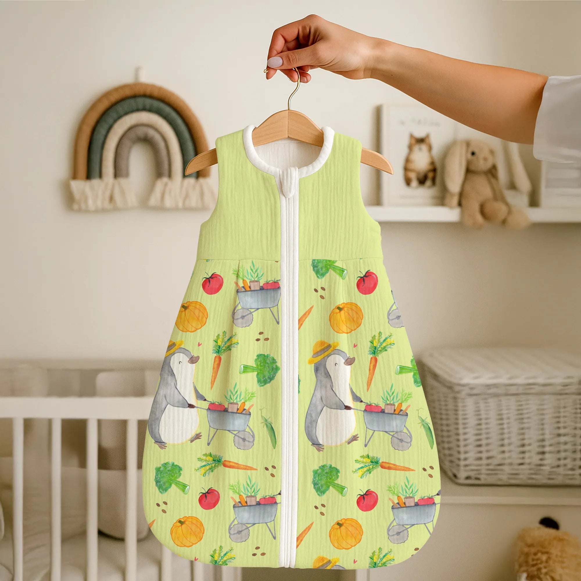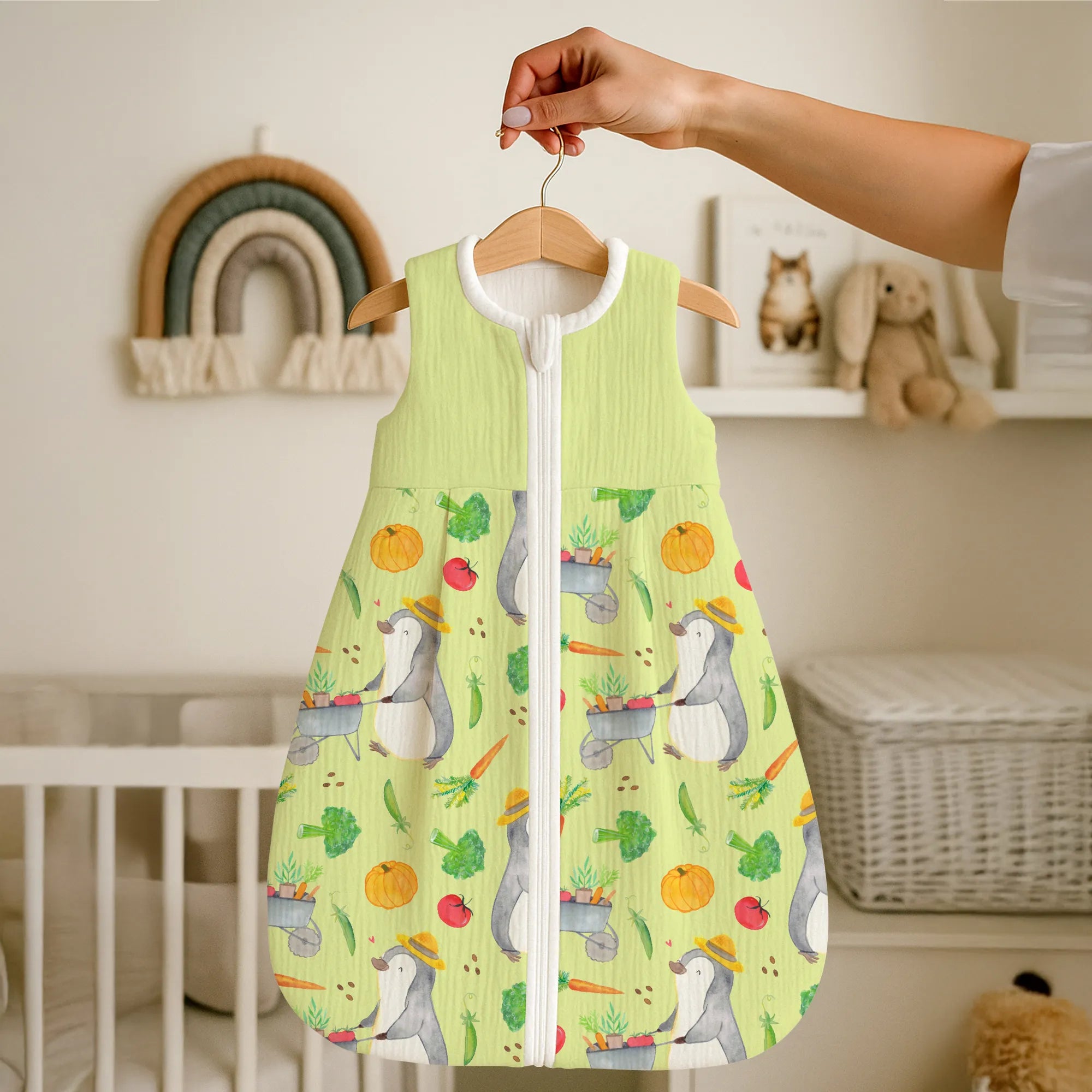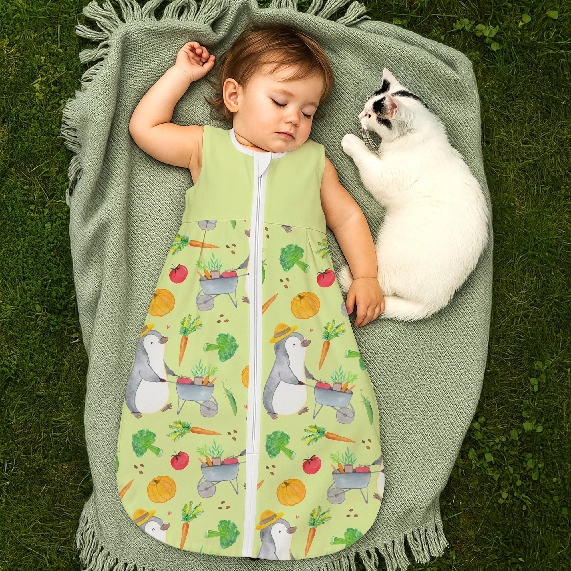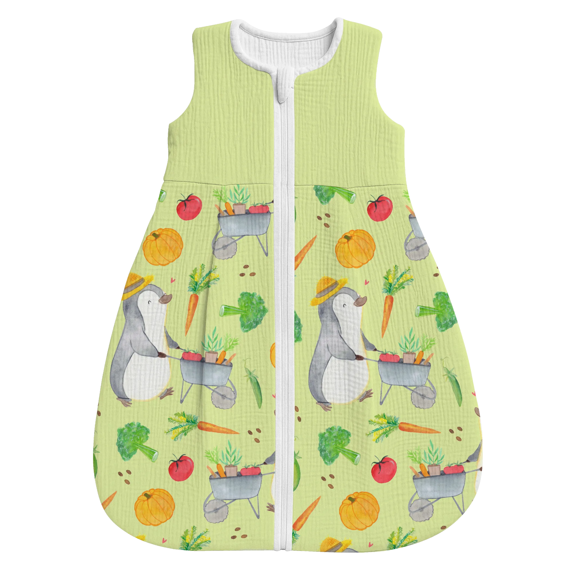 Unser Schlafsack Baby mit dem entzückenden Pinguin-Motiv aus der Hobby & Sport Kollektion ist mehr als nur eine Schlafbekleidung; es ist ein liebevolles Versprechen für Geborgenheit und Wärme. Das Motiv zeigt einen kleinen, süßen Pinguin mit einem gelben Sonnenhut auf dem Kopf, der stolz eine Schubkarre voller frischem Gemüse schiebt. 🐧🥕 Es ist eine Hommage an die Gartenarbeit und das Gärtnern – Tätigkeiten, die so viel Ruhe und Freude schenken.