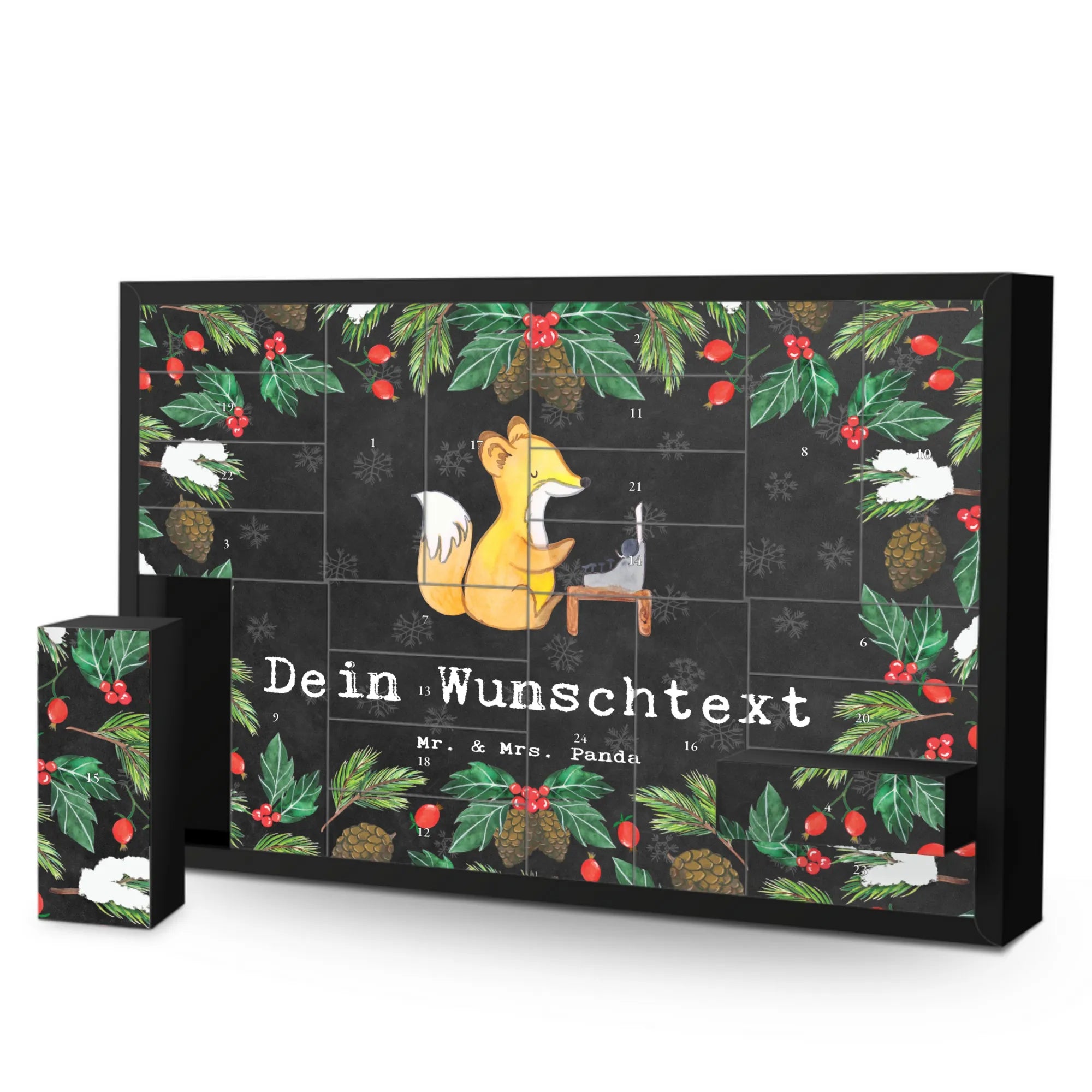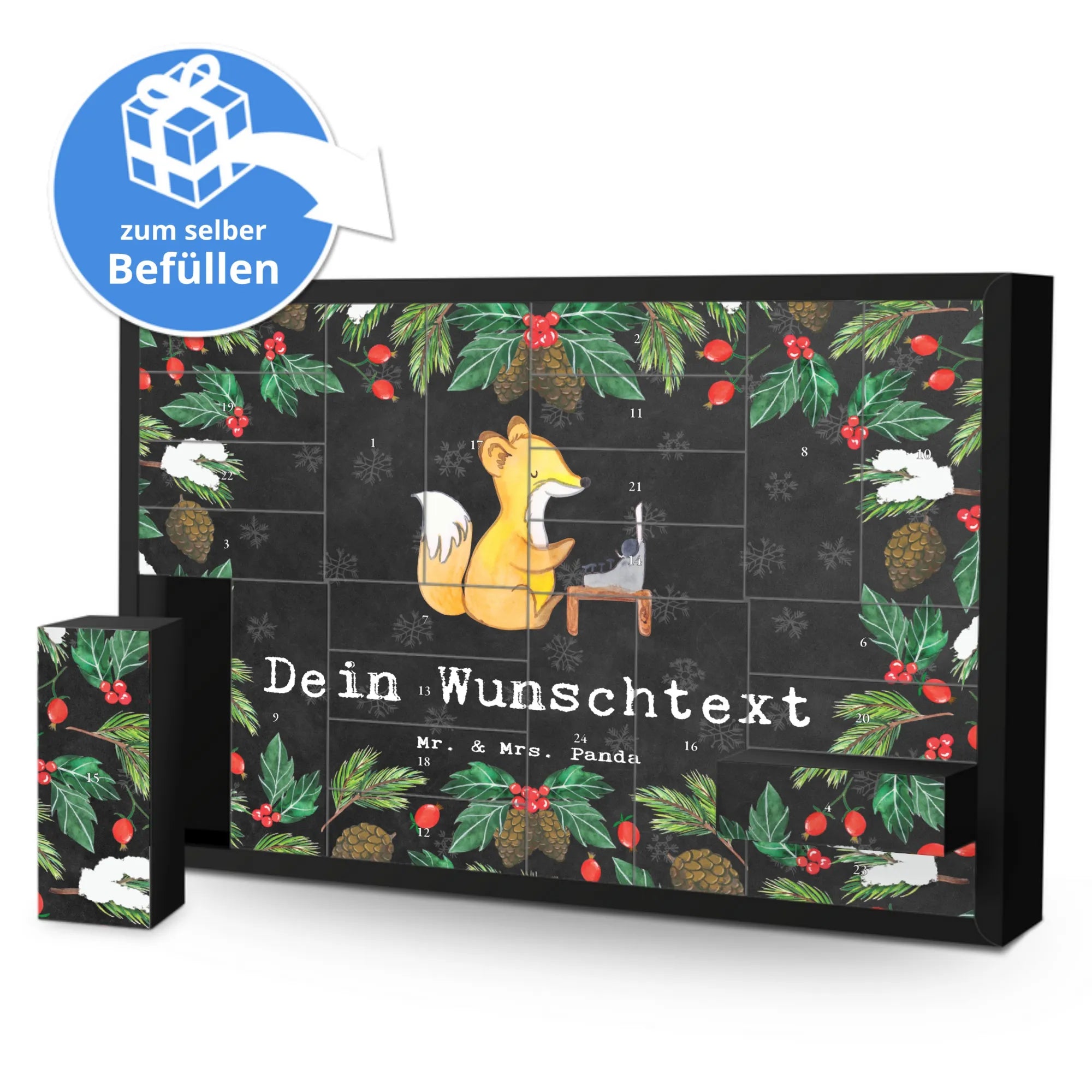 Der personalisierte befüllbare Adventskalender "Schriftsteller aus Leidenschaft" von Mr. & Mrs. Panda ist das perfekte Geschenk für jeden passionierten Schriftsteller oder Hobbyautor. In der hektischen Vorweihnachtszeit bringt dieser Adventskalender nicht nur ein bisschen Freude, sondern auch tägliche Inspiration. Der bezaubernde, handgemalte Fuchs, der in einer Schreibmaschine sitzt, ziert die Vorderseite dieses einzigartigen Kalenders und erinnert jeden Schriftsteller daran, wie wichtig es ist, der eigenen Kreativität treu zu bleiben.