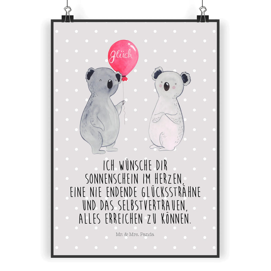 Dieses liebevoll illustrierte Poster aus der Koala-Kollektion von Mr. & Mrs. Panda zeigt zwei glückliche Koalas, die einen bunten Luftballon halten. Auf dem Ballon steht der herzliche Spruch: „Ich wünsche dir Sonnenschein im Herzen, eine nie endende Glückssträhne und das Selbstvertrauen, alles erreichen zu können.“ 🌞🎈