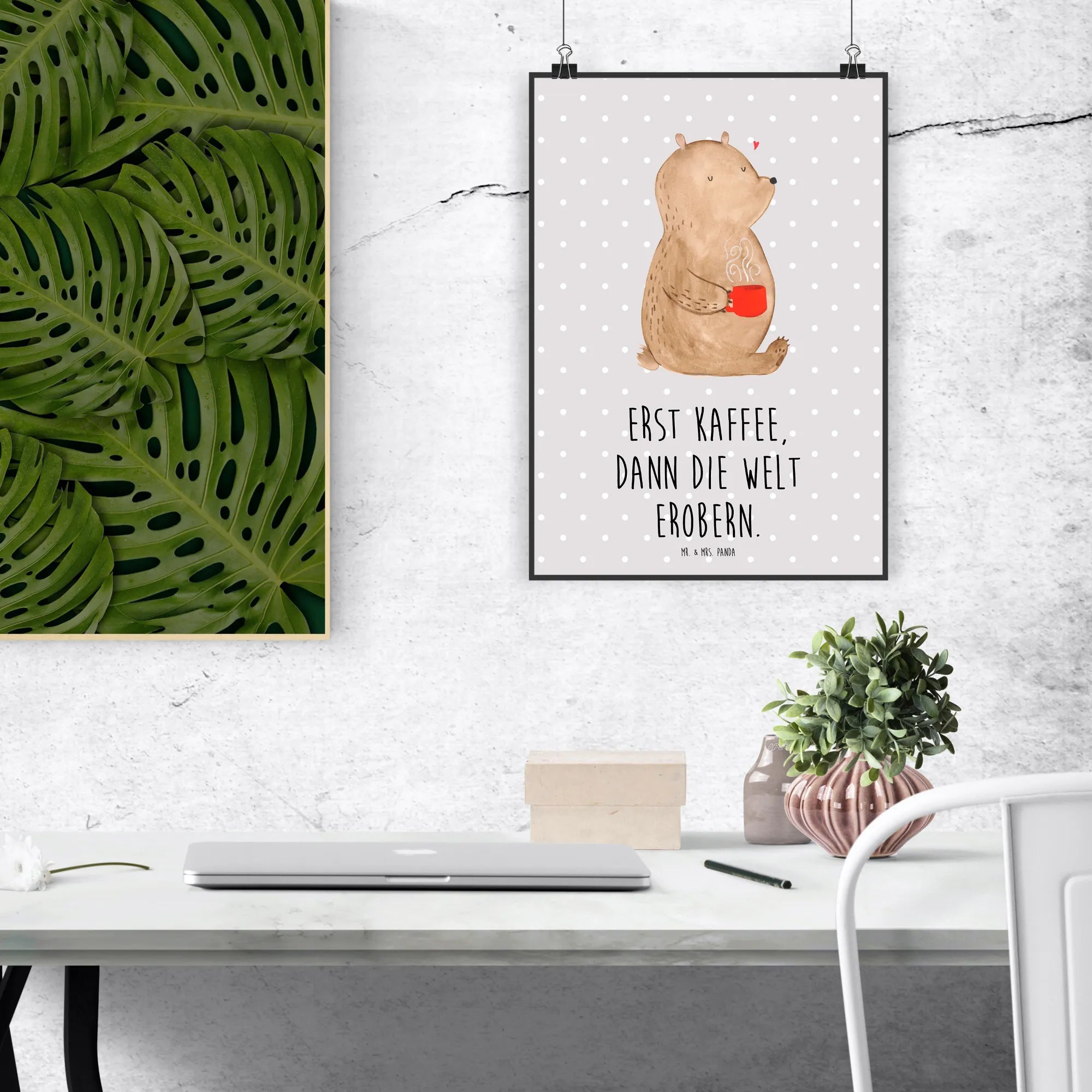 Plakat Niedźwiedź kawa - DIN A0 - z napisem - Pastelowy niebieski