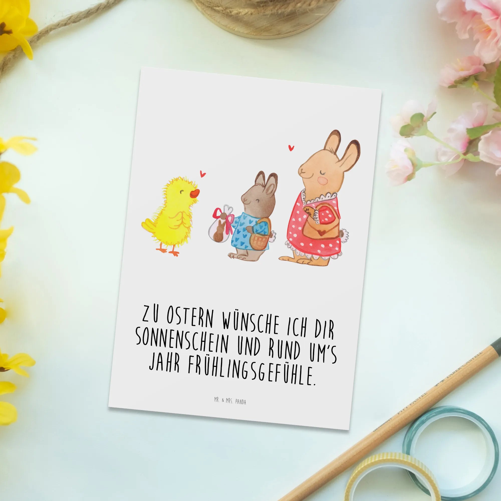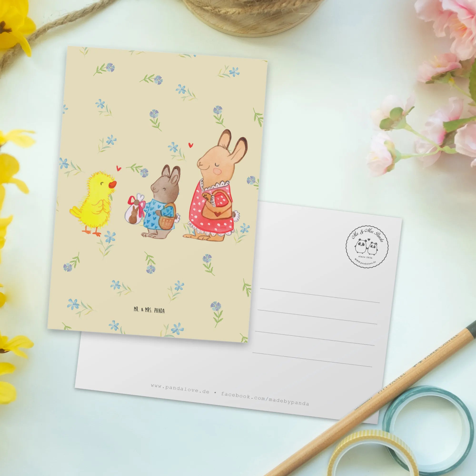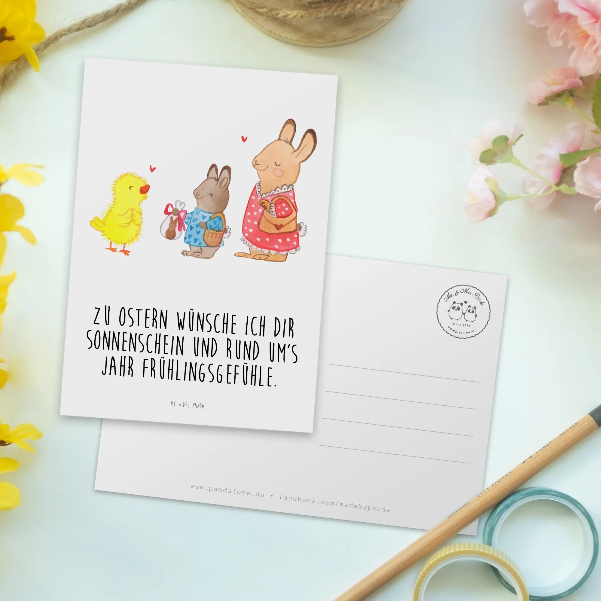 Die perfekte Postkarte von Mr. & Mrs. Panda für die fröhliche Osterzeit! Lass dich von unserem liebevollen Motiv "Ostern Geschenke" verzaubern, das eine zarte Hasenmama zeigt, die ihrem kleinen Kind dabei zuschaut, wie es mit einem süßen Schokoladen-Osterhasen und einem flauschigen Küken spielt.