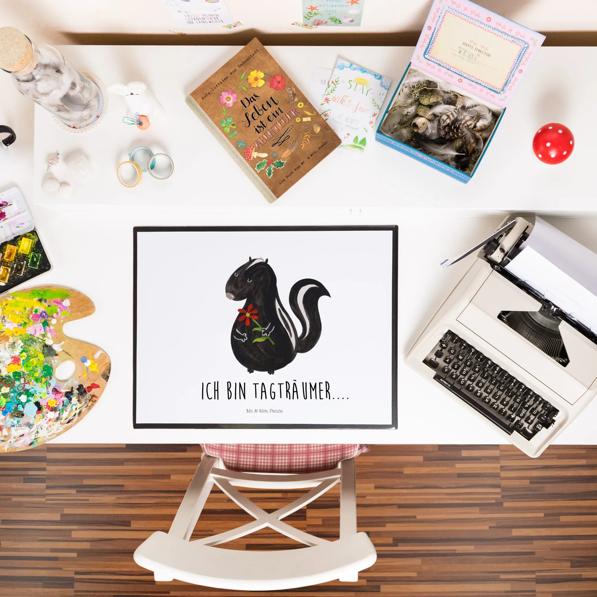 Unsere liebevoll gestaltete Schreibtischunterlage aus der Stinktier - Kollektion von Mr. & Mrs. Panda bringt verträumte Leichtigkeit an deinen Arbeitsplatz. Das niedliche Aquarell-Stinktier mit bunter Blumenkrone und der Schriftzug „Ich bin Tagträumer.“ macht jede Schreibfläche zum Hingucker – perfekt als Schreibtischmatte, Tischpad oder Arbeitsunterlage.