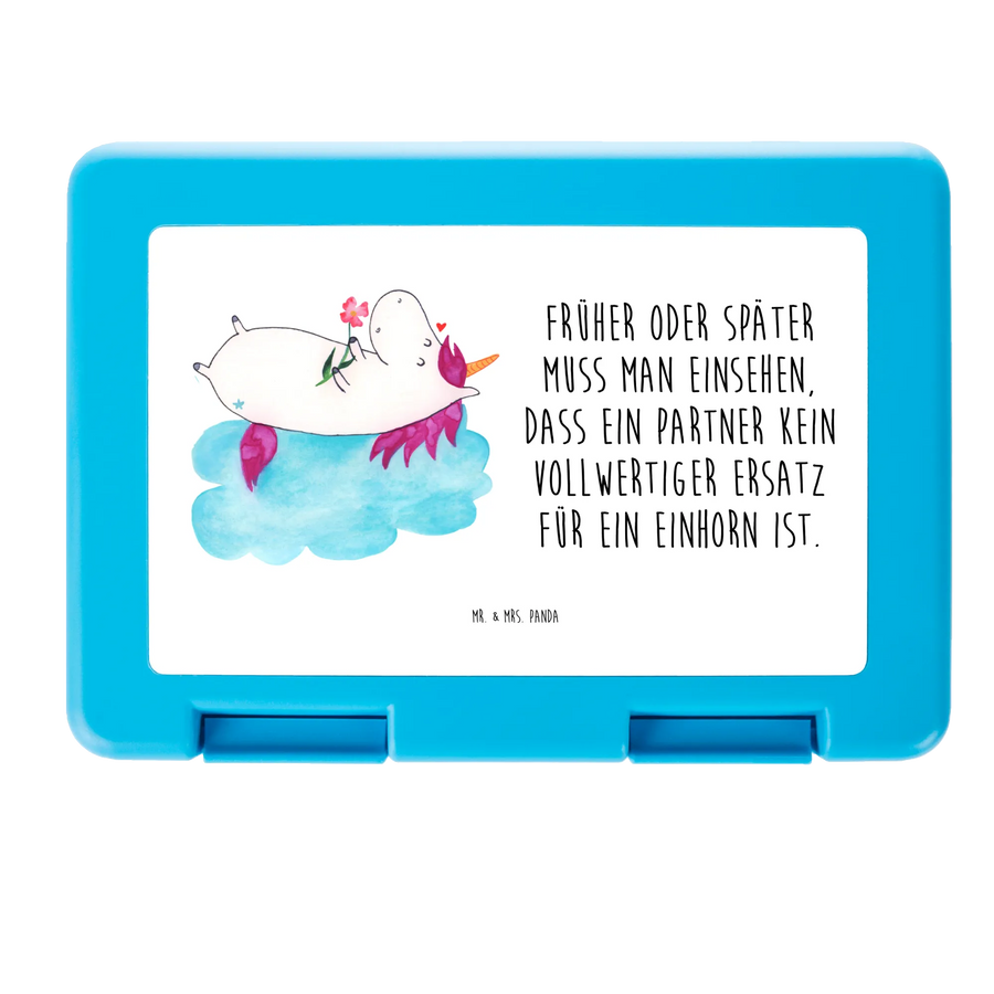 Die liebevoll handgezeichnete Illustration eines verliebten Einhorns auf einer Wolke entfaltet eine zauberhafte Ausstrahlung und bringt Freude in den Alltag. Der witzige Slogan "Früher oder später muss man einsehen, dass ein Partner kein vollwertiger Ersatz für ein Einhorn ist" sorgt für Schmunzeln und ist der perfekte Liebesbeweis für eine Freundin! Diese Brotdose ist auch ein tolles Mitbringsel für Junggesellenabschiede oder einfach so, um einer lieben Person eine Freude zu machen.