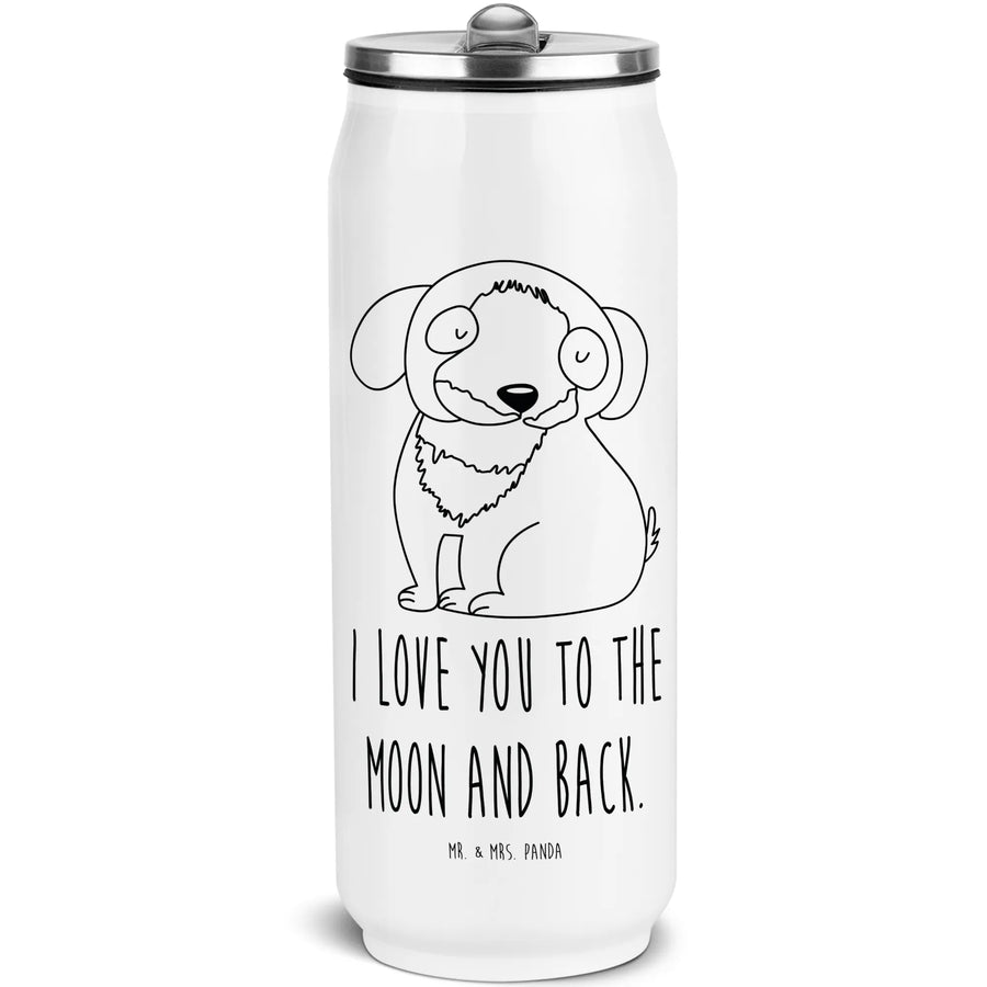 Die Edelstahl Getränkedosen Trinkflasche "Hund entspannt" von Mr. & Mrs. Panda ist das perfekte Geschenk für jeden Hundeliebhaber! Mit ihrem bezaubernden Design, das einen süßen, schwarz-weißen Hund zeigt, und dem liebevollen Slogan "I love you to the moon and back" bringt sie Freude in den Alltag.