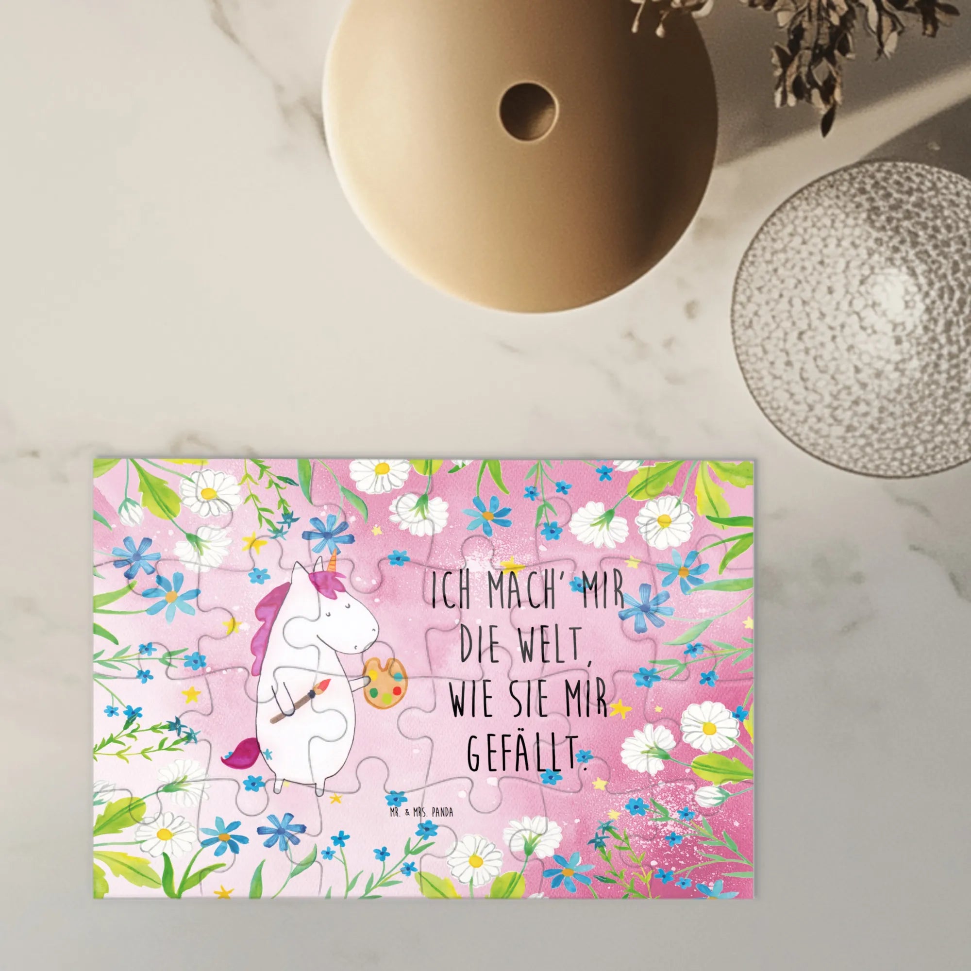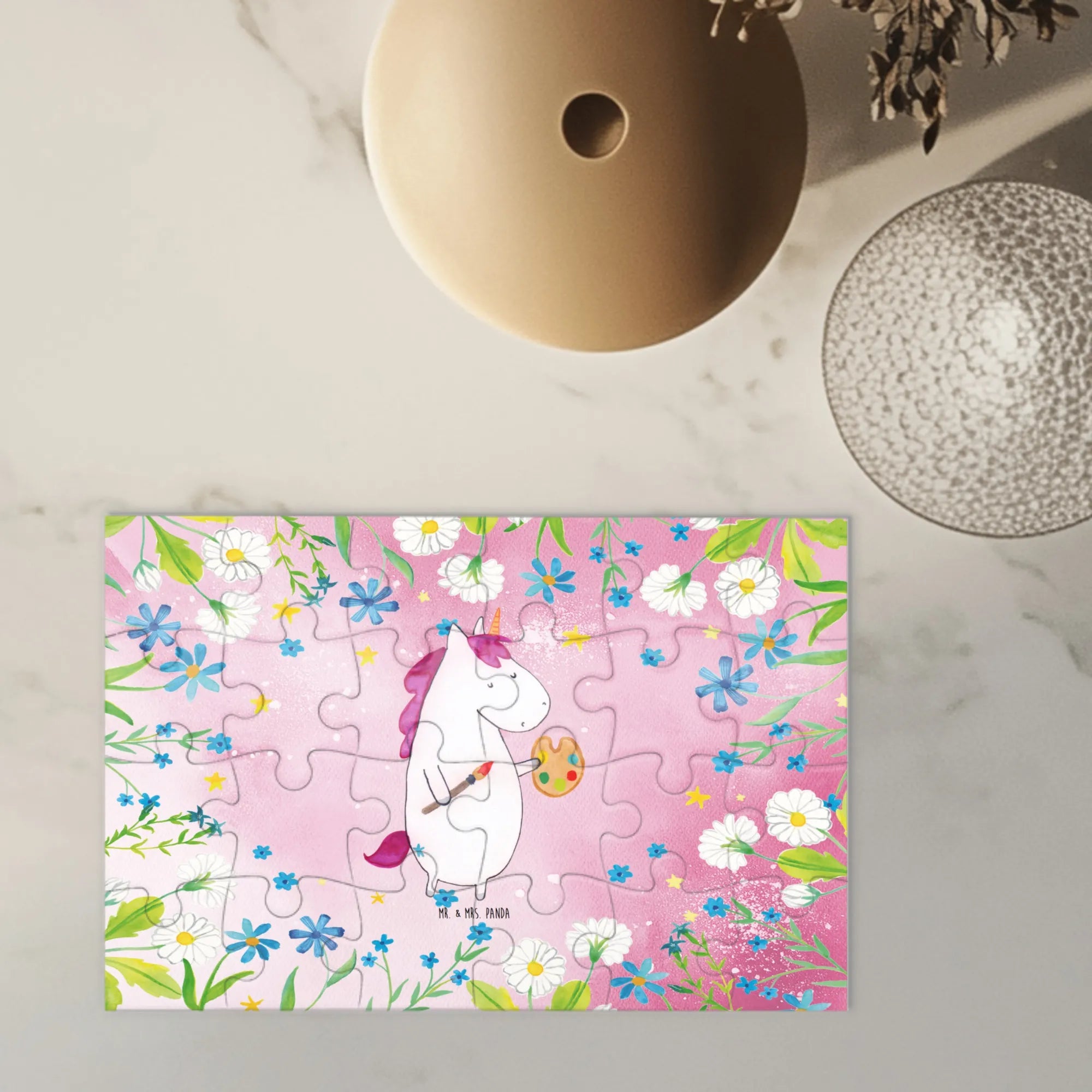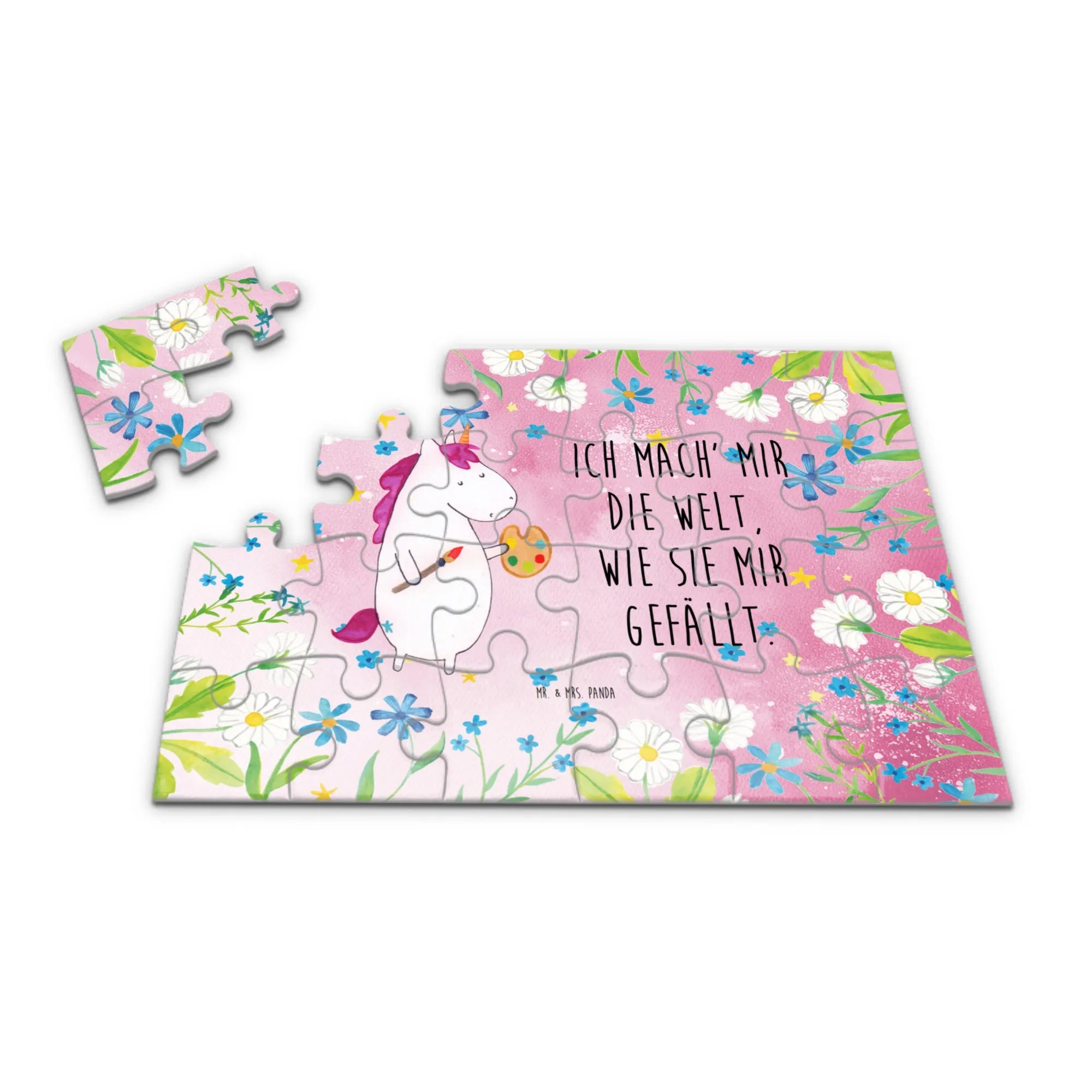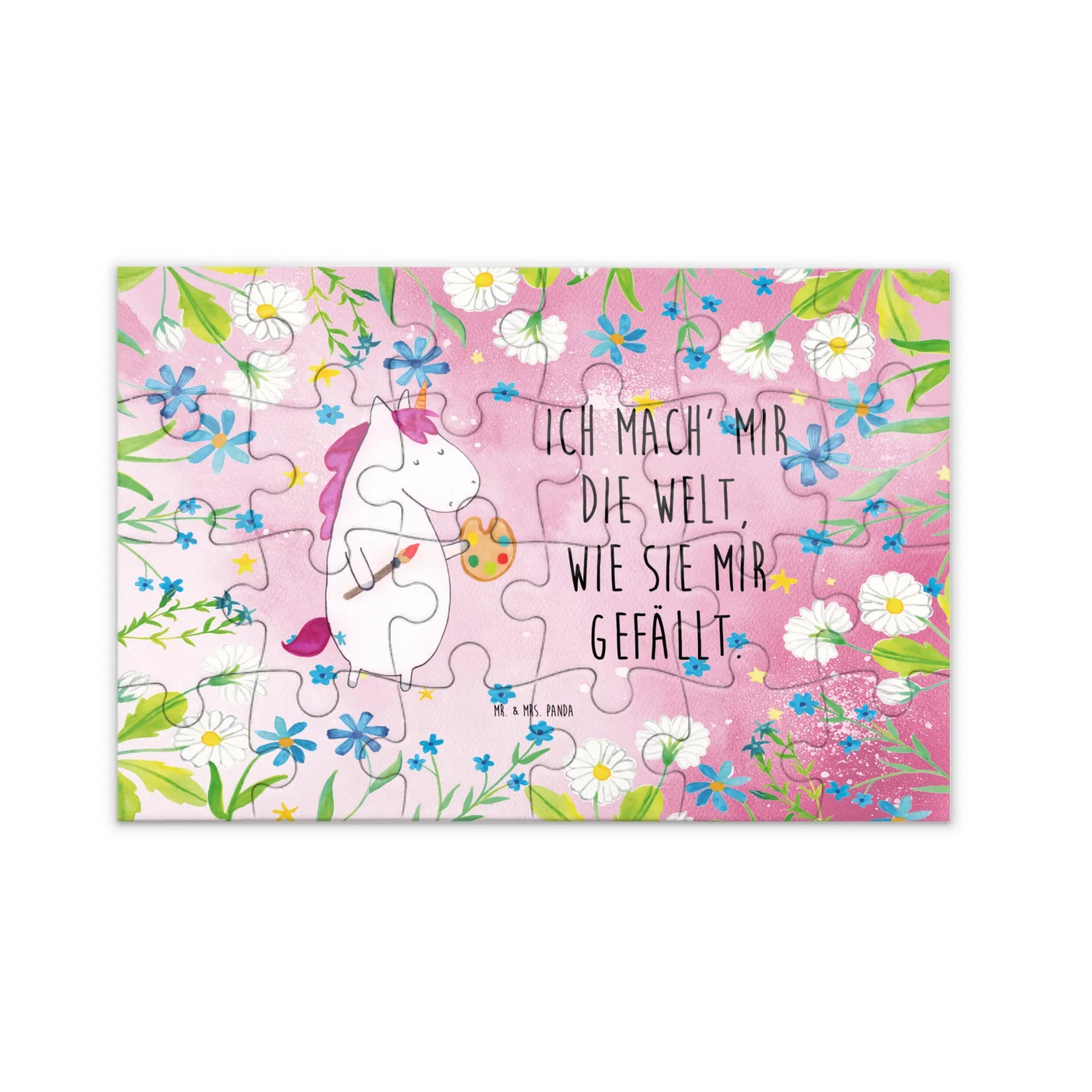 Verschenke Freude, Kreativität und kleine Momente der Entspannung mit dem Einhorn Künstler Puzzle aus der Einhorn - Kollektion von Mr. & Mrs. Panda. Ein Geschenk, das Herz und Fantasie berührt.