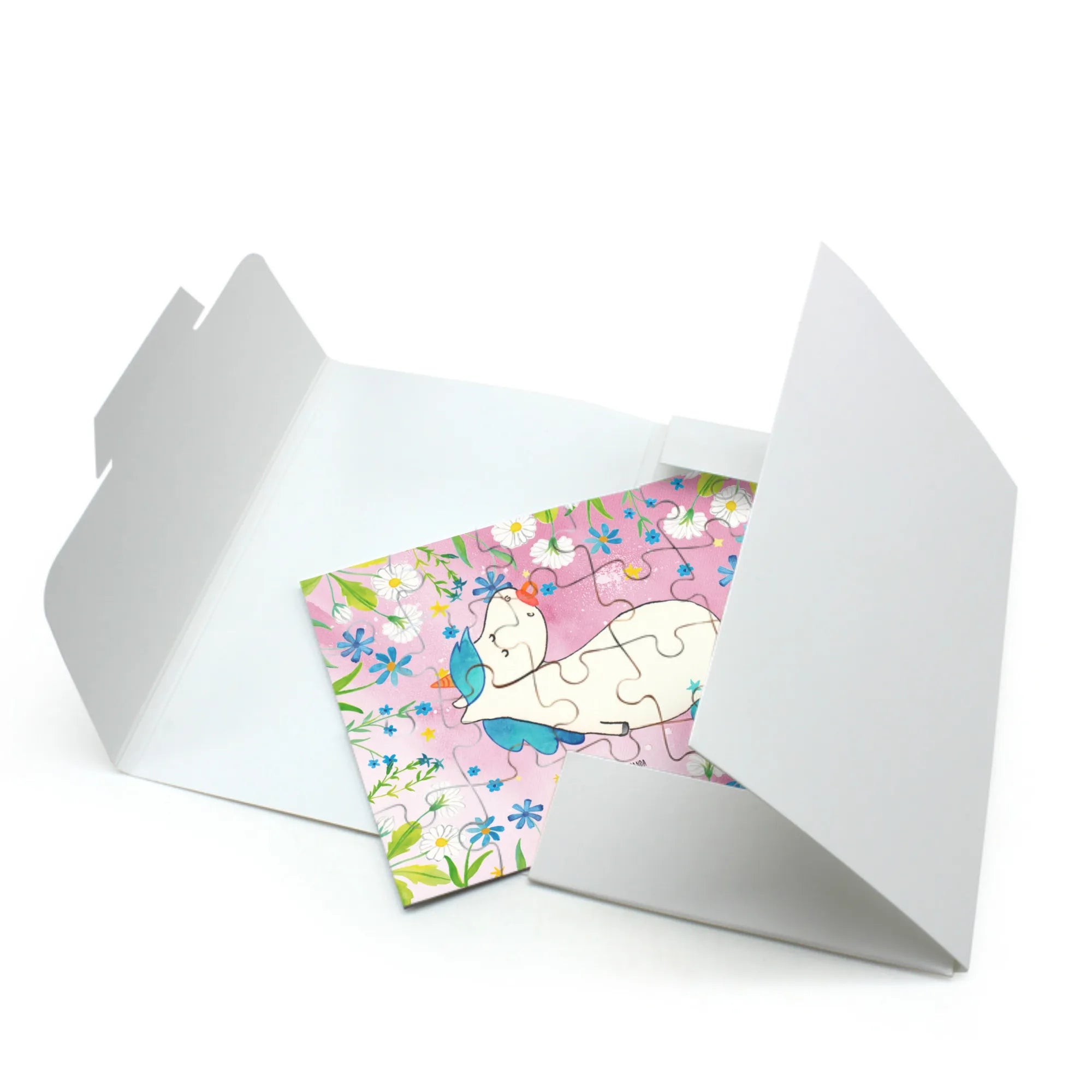 Ein kleines, großes Geschenk: Handgezeichnetes Motiv, seidenmatter Aufdruck, strahlende Farben, 96 Teile Puzzle und eine edle Metall-Schmuckdose – liebevoll verpackt und bereit, ein Lächeln zu schenken.