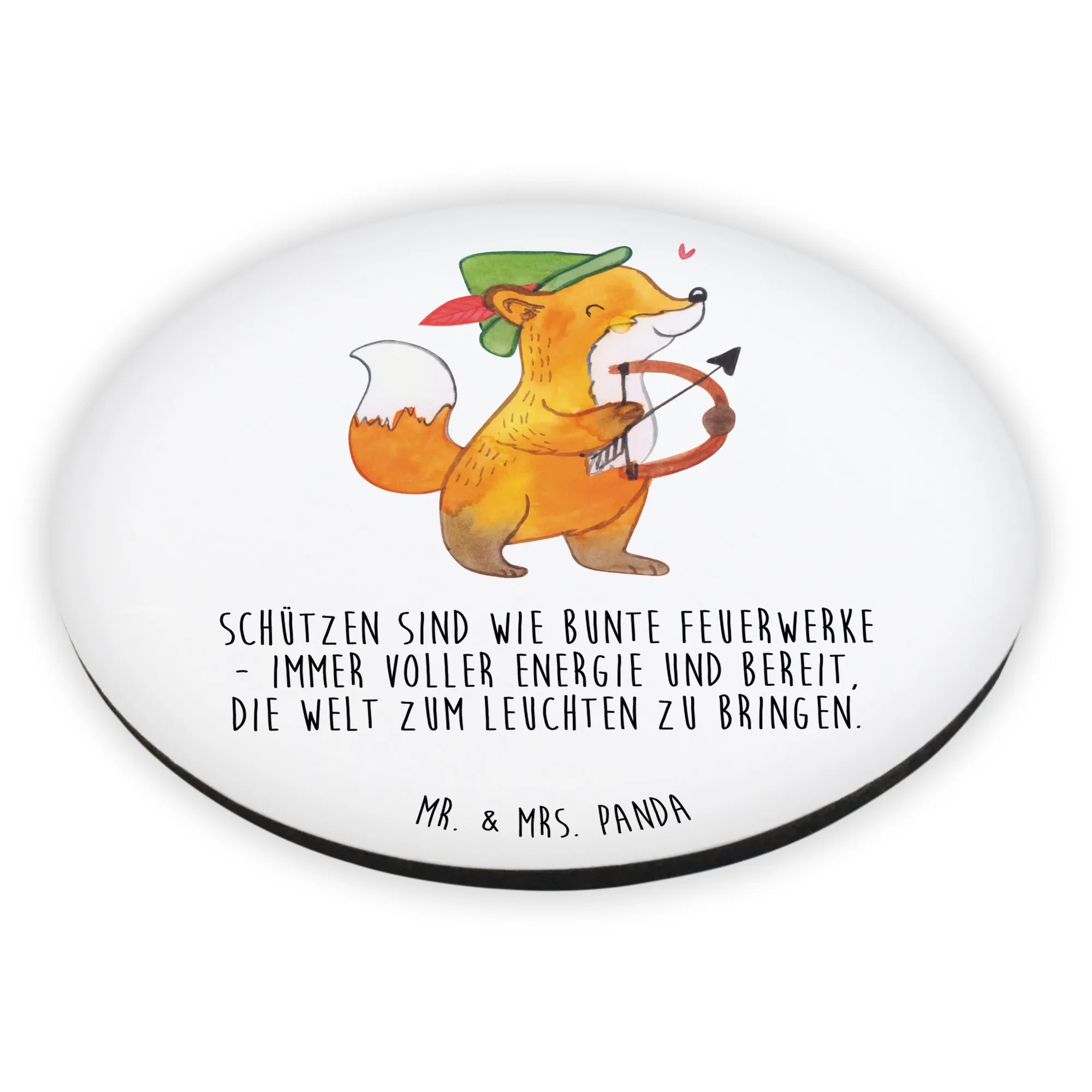 Suchst du nach dem perfekten Geschenk für Schütze-Fans? Dann ist unser Rund Magnet mit dem bezaubernden Schütze-Motiv genau das Richtige für dich! Dieser einzigartige Kühlschrankmagnet bringt nicht nur Farbe in die Küche, sondern auch das Sternzeichen Schütze direkt zu dir. Mit seinem liebevoll handgezeichneten Motiv von Mrs. Panda zeigt dieser Magnet einen lustigen orange-braunen Fuchs, der sich als Schütze verkleidet hat. Er trägt einen grünen Hut mit einer roten Feder und zielt mit Pfeil und Bogen, was dir ein Lächeln ins Gesicht zaubern wird! Der charmante Slogan "Schützen sind wie bunte Feuerwerke - immer voller Energie und bereit, die Welt zum Leuchten zu bringen" ergänzt das Motiv und macht den Magneten zu einer tollen Deko für den Kühlschrank oder das Whiteboard.