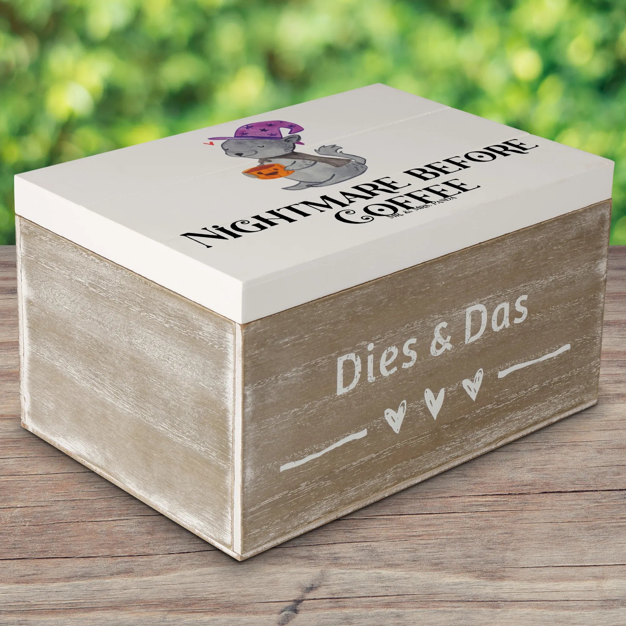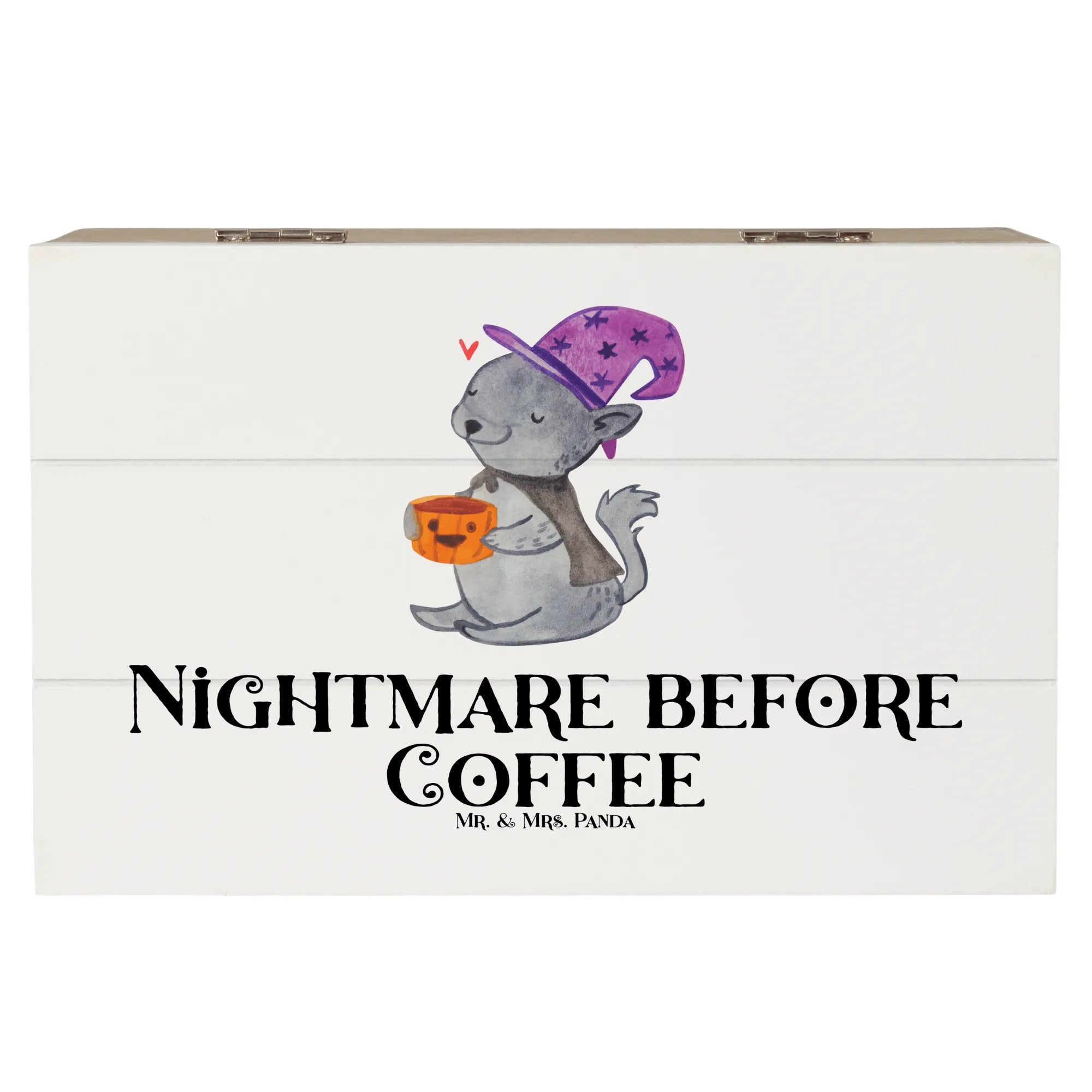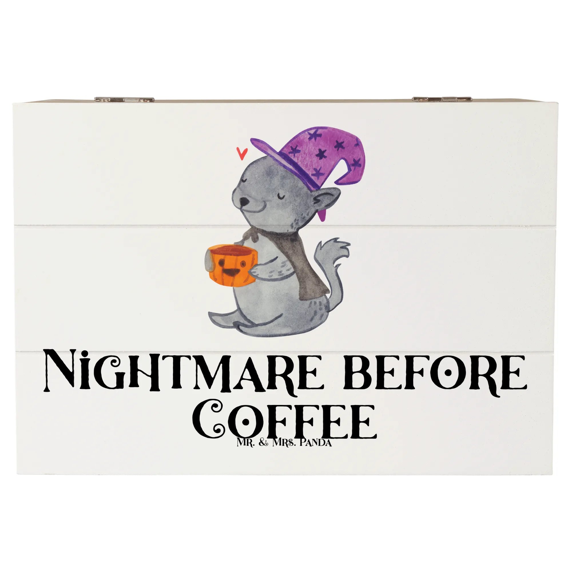 Mr. & Mrs. Panda Holzkiste „Kater Kaffee“ – eine bezaubernde Aufbewahrungsbox, die Dekoration und Funktion vereint. Auf der Holztruhe siehst du einen frechen Hexenkater mit einer Kürbis-Kaffeetasse und dem humorvollen Spruch „Nightmare before Coffee“. Das liebevoll illustrierte Motiv bringt Wärme und eine Prise Halloween-Magie in dein Zuhause.