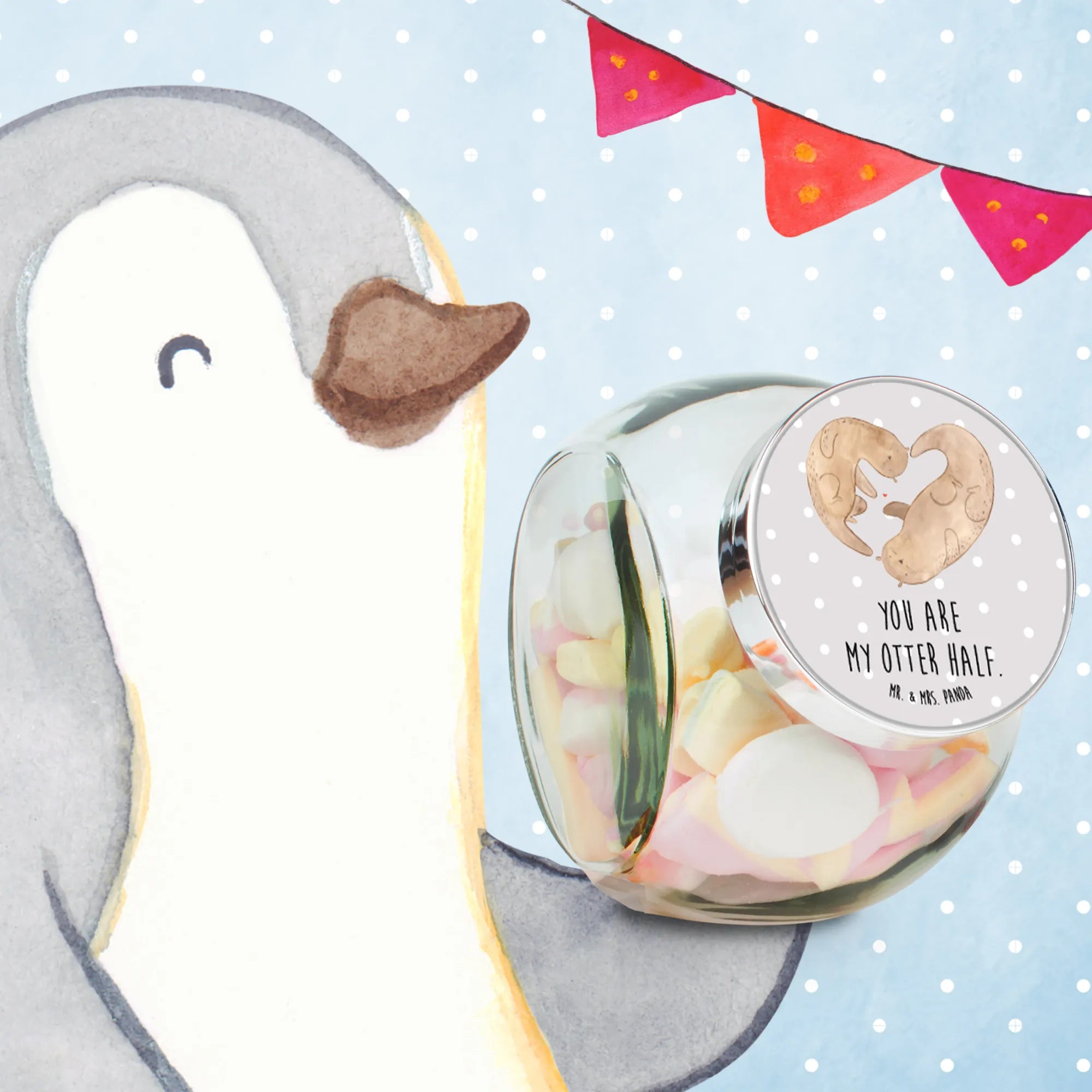 Lass dich von der Lebensfreude des niedlichen Otters anstecken und genieße jeden Tag ein Stückchen mehr. Das Bonbonglas von Mr. & Mrs. Panda – für all die kleinen und großen Momente des Lebens.