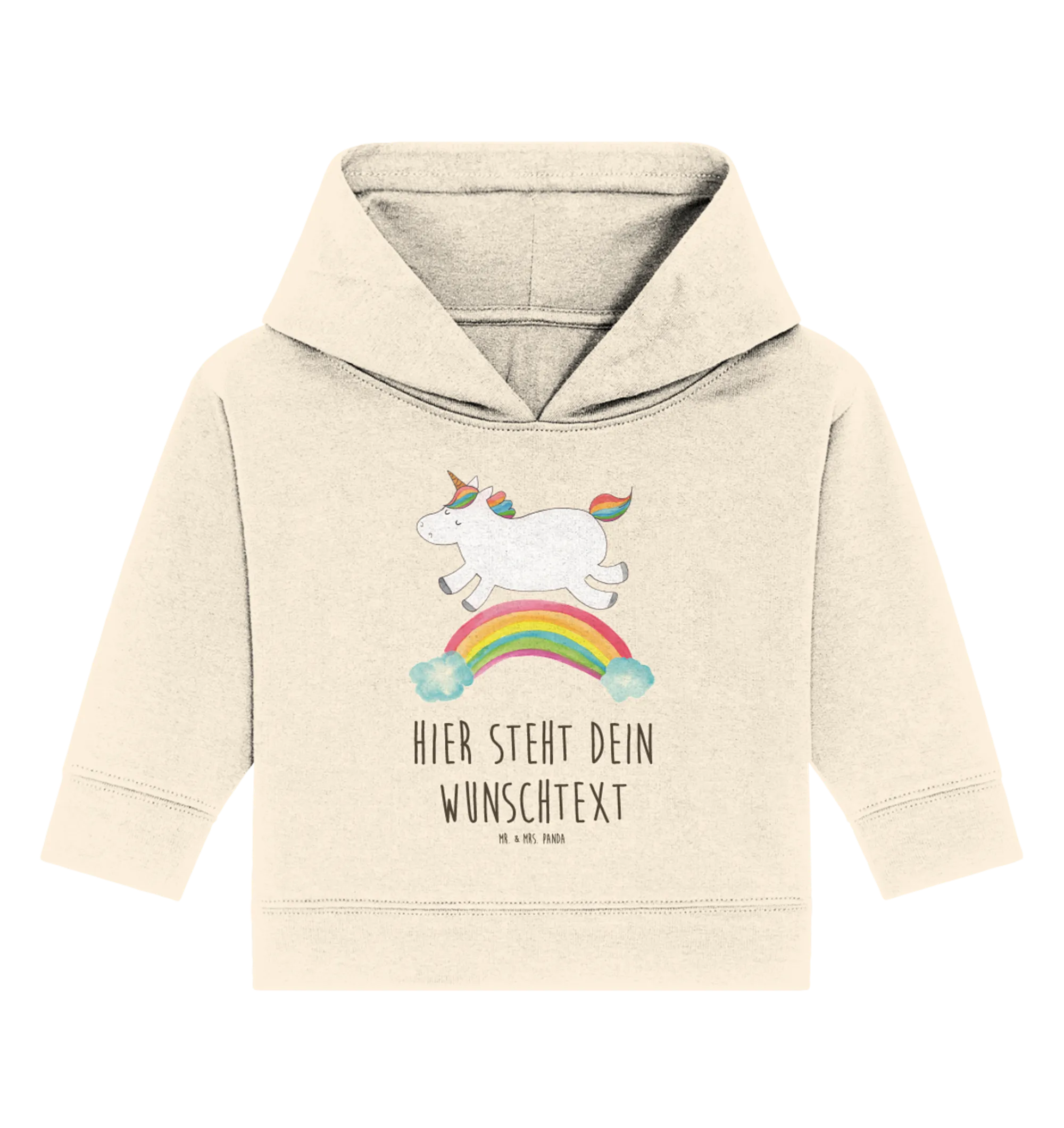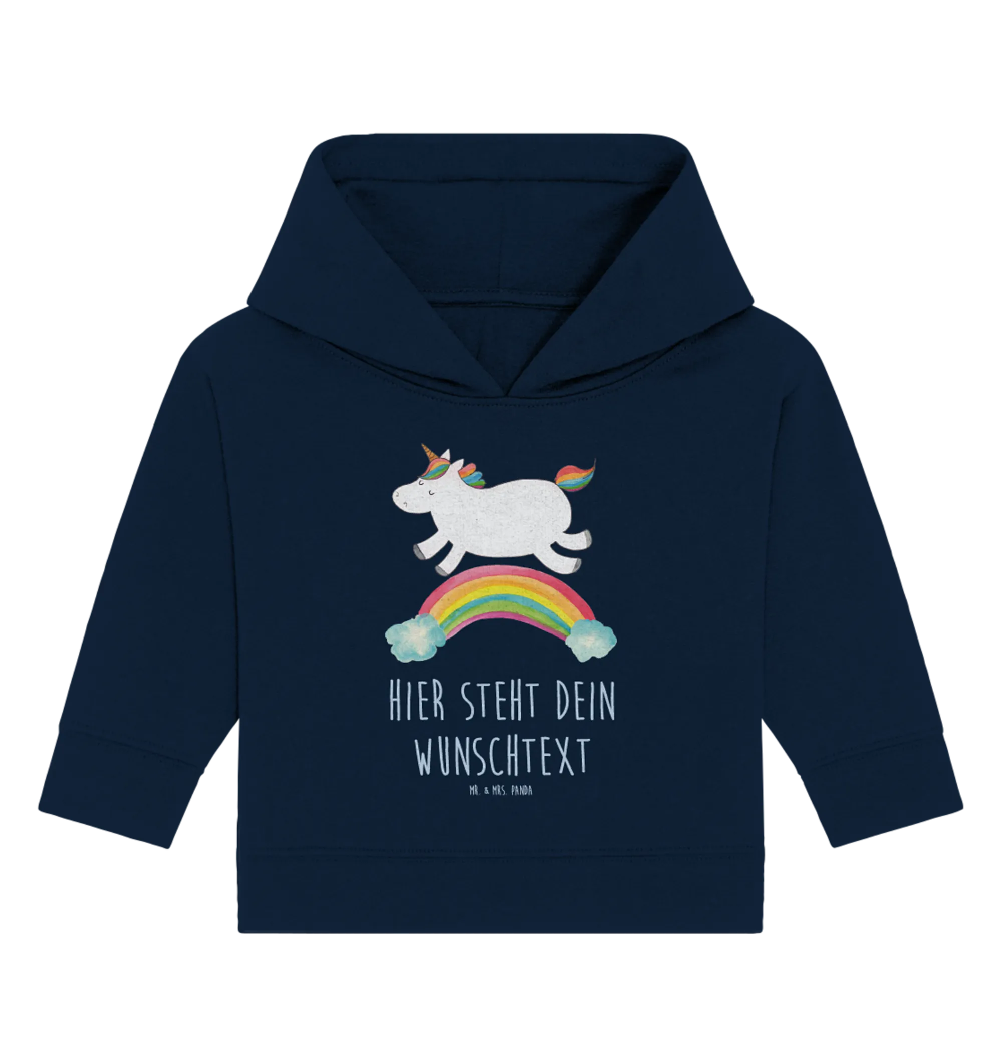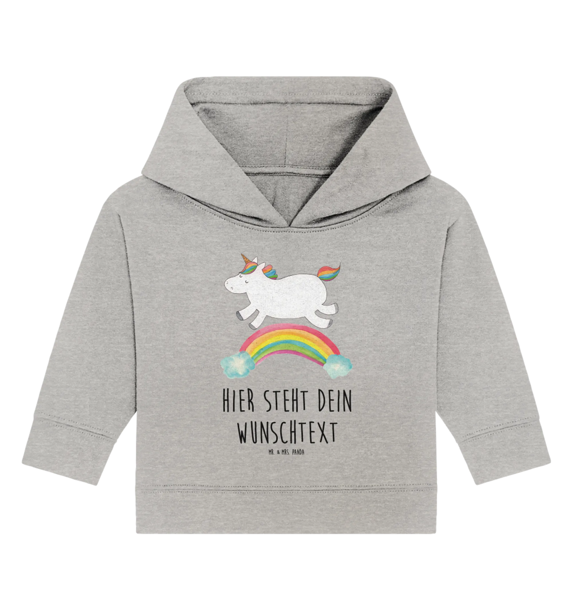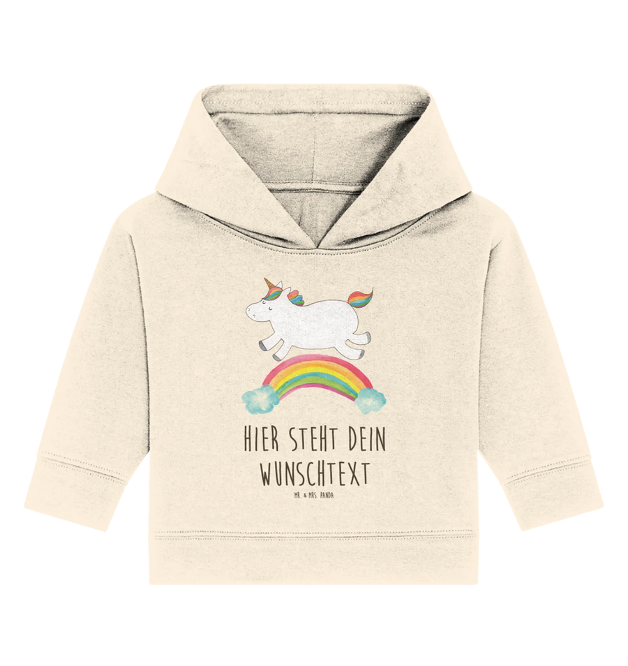 Personalisierter Baby Hoodie Einhorn Regenbogen – ein zauberhaftes Geschenk aus der Einhorn - Kollektion von Mr. & Mrs. Panda. Das niedliche Regenbogen-Einhorn wurde liebevoll von Mrs. Panda per Aquarell gezeichnet und trägt den fröhlichen Spruch: „Einen Regenbogen nennt man in Einhornkreisen auch Einhornautobahn.“