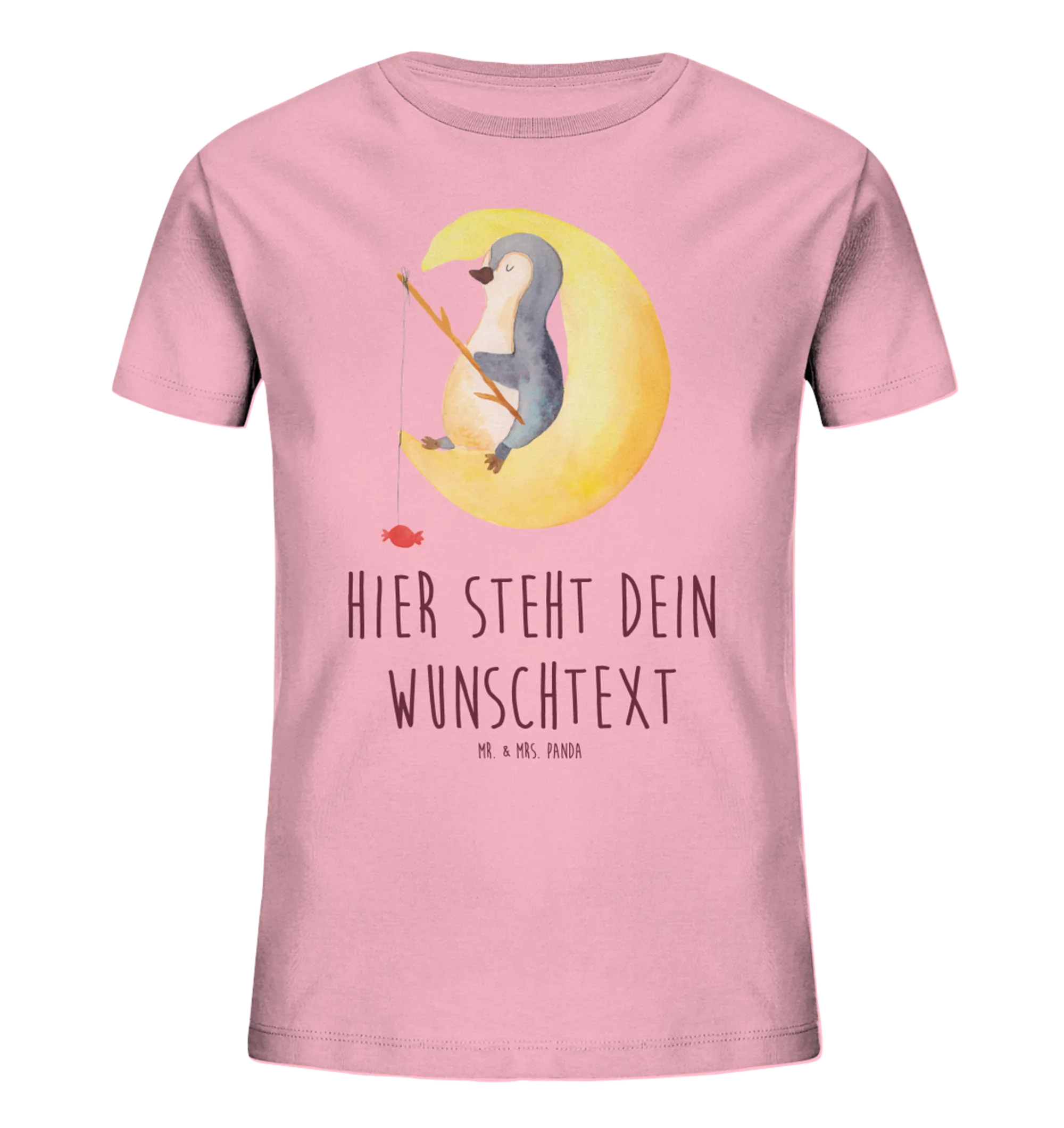 Der süße Pinguin, der es sich auf einer Mondsichel gemütlich gemacht hat und mit einer Angel nach Bonbons angelt, sorgt für Freude und Schmunzeln jedes Mal, wenn dein Kind es trägt. Mit einem witzigen Spruch: „Ich und mein Körper wollen schlafen, aber mein Kopf will wissen, ob Pinguine Knie haben...“ macht es das Einschlafen gleich viel lustiger.