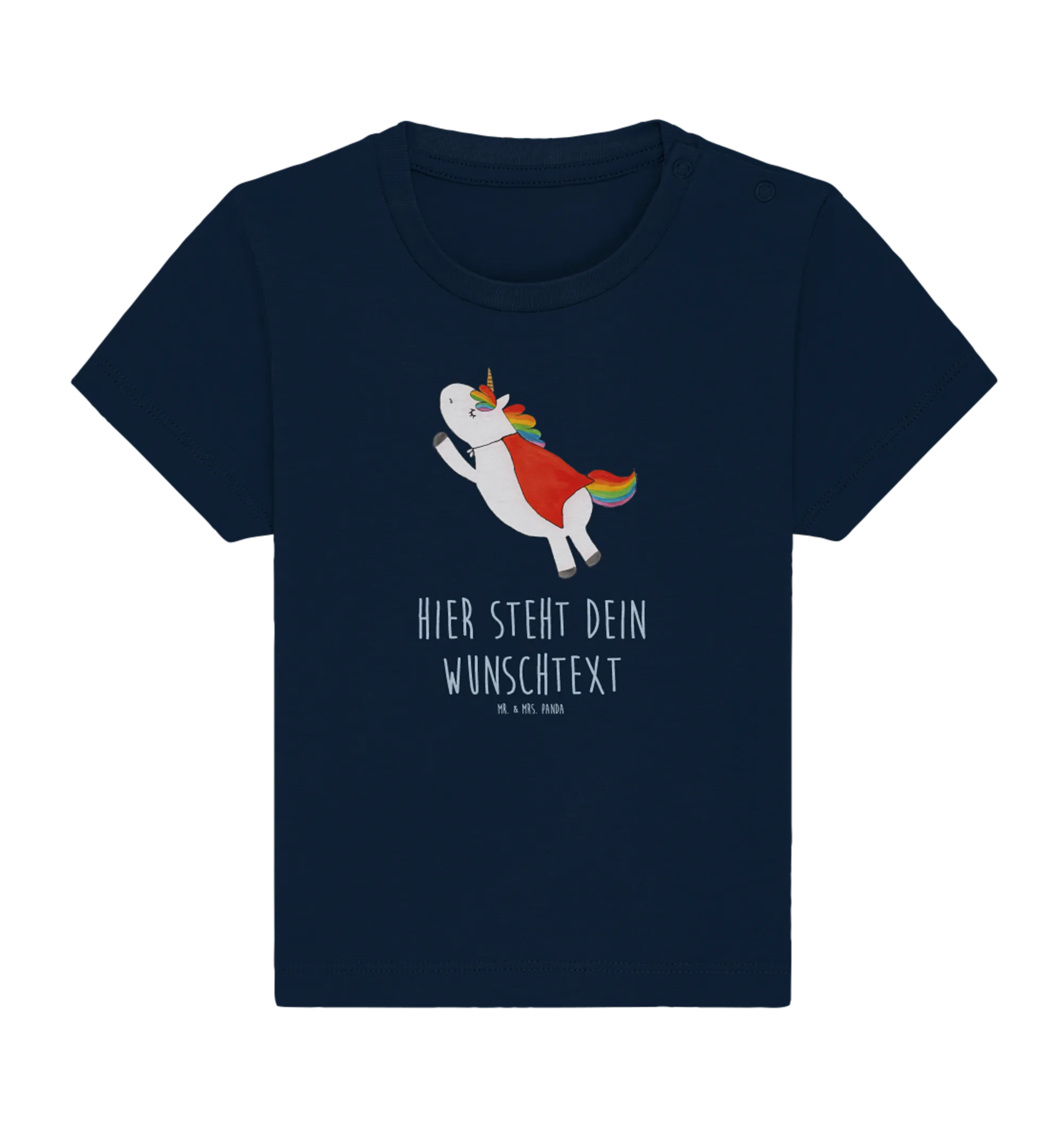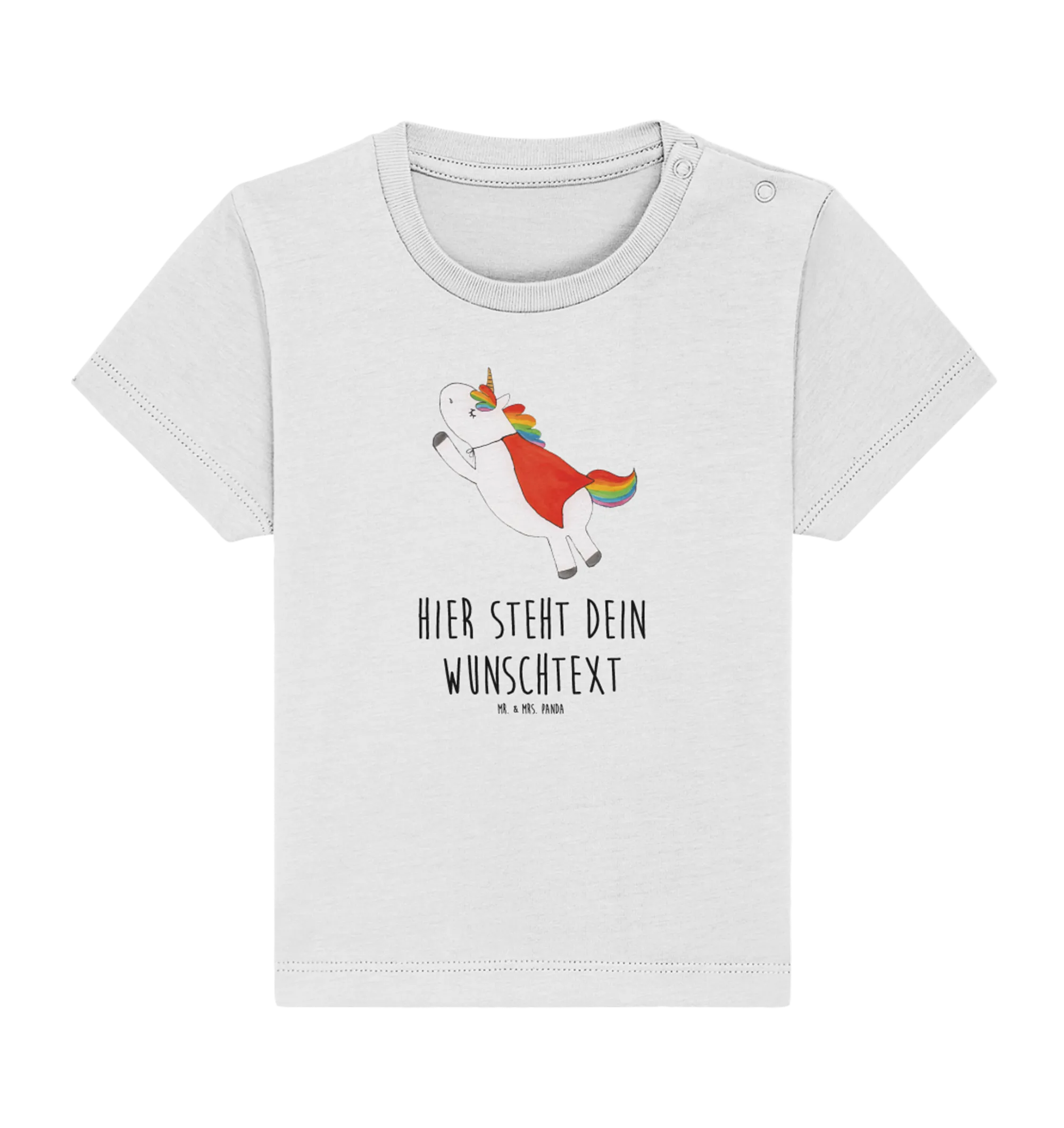 Das personalisierte Baby T-Shirt mit dem wunderbaren Motiv "Einhorn Super" aus der Einhorn-Kollektion von Mr. & Mrs. Panda ist das perfekte Geschenk für alle kleinen Superheldinnen! Jedes Mädchen verdient einen Superhelden, und was könnte da besser sein, als ein Einhorn, das in einem zauberhaften Kostüm steckt? Dieses süße Einhorn trägt den Schmetterlings-Flügeln und strahlt eine positive Energie aus, die jeden Tag von einem Märchen erzählt.