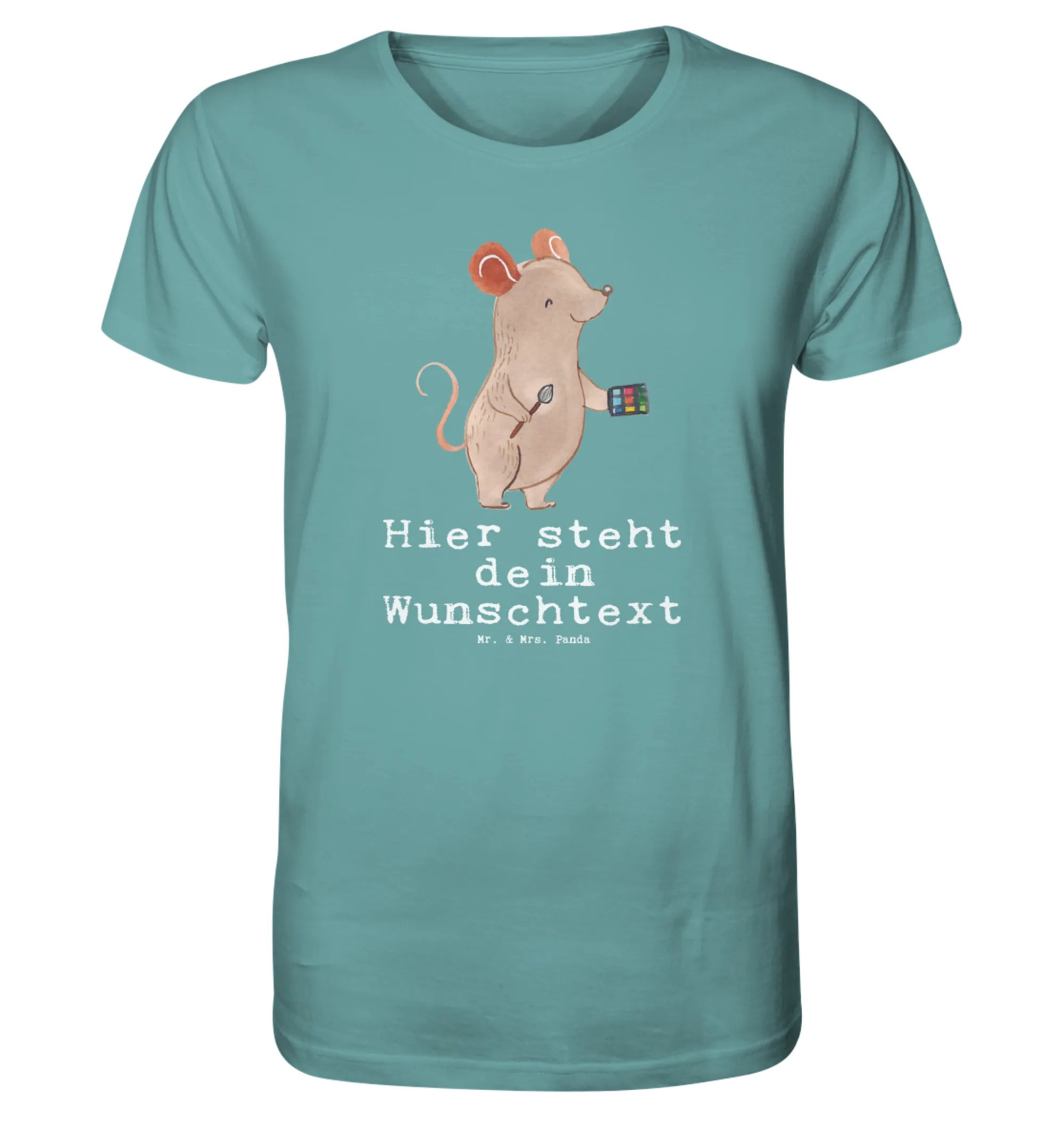 Das besondere Motiv "Maskenbildner mit Herz" begeistert mit einer süßen Maus, die Lidschatten in einer Hand und einen Schminkpinsel in der anderen hält, sowie dem neuen Slogan: "Du bist nur ein halber Mensch, wenn du kein Maskenbildner bist." Dieses Shirt ist aus 100% Baumwolle gefertigt und trägt das Öko-Siegel – perfekt für alle, die Wert auf Nachhaltigkeit legen.