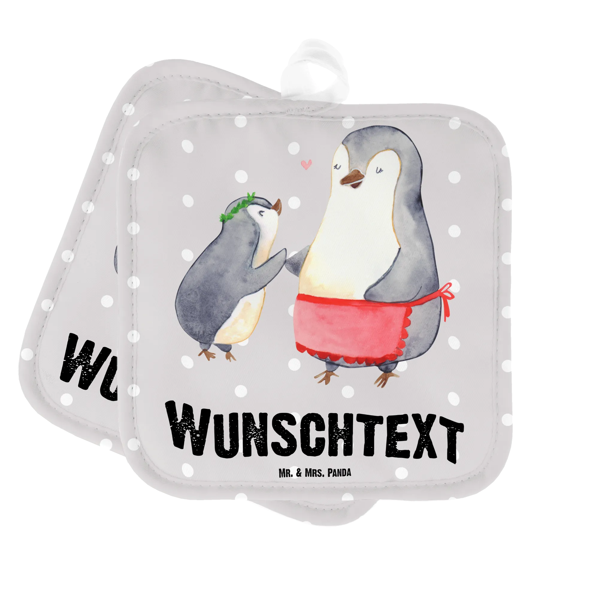 Spersonalizowane rękawice kuchenne Pingwin z dzieckiem - Pastelowy czerwony