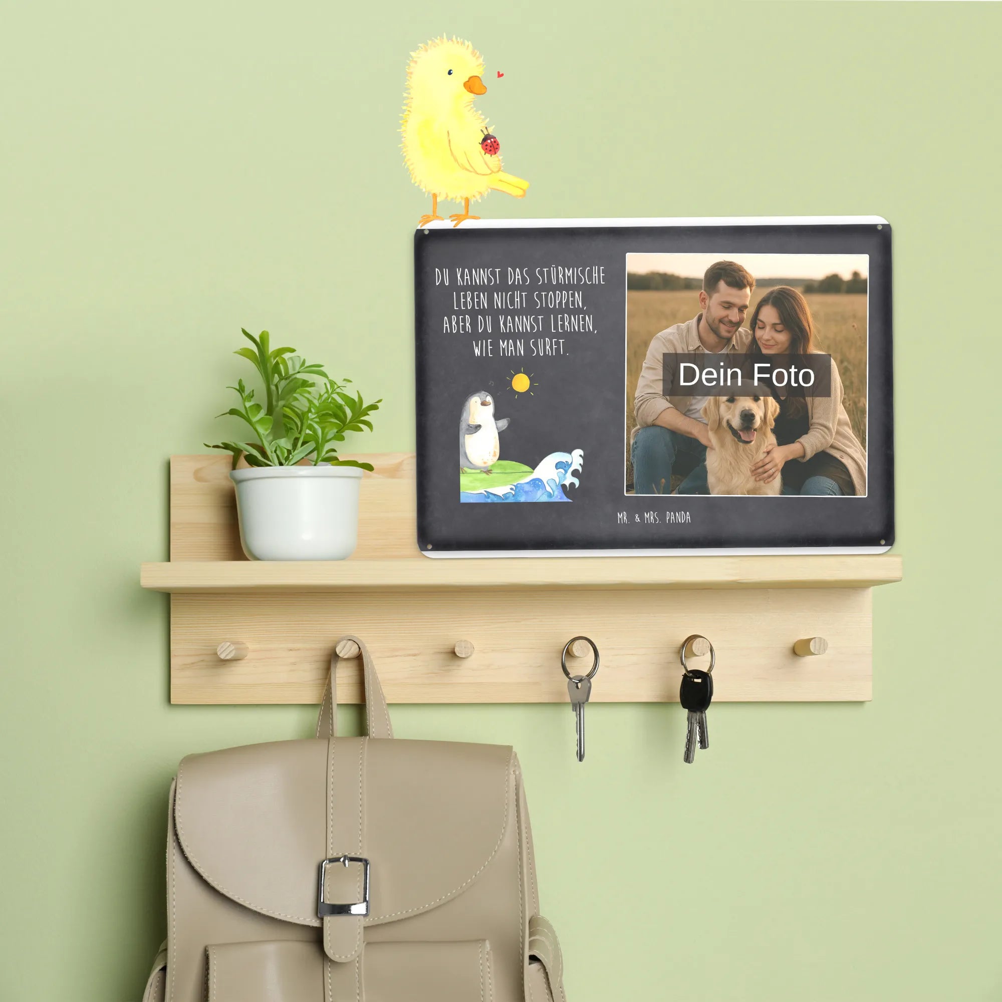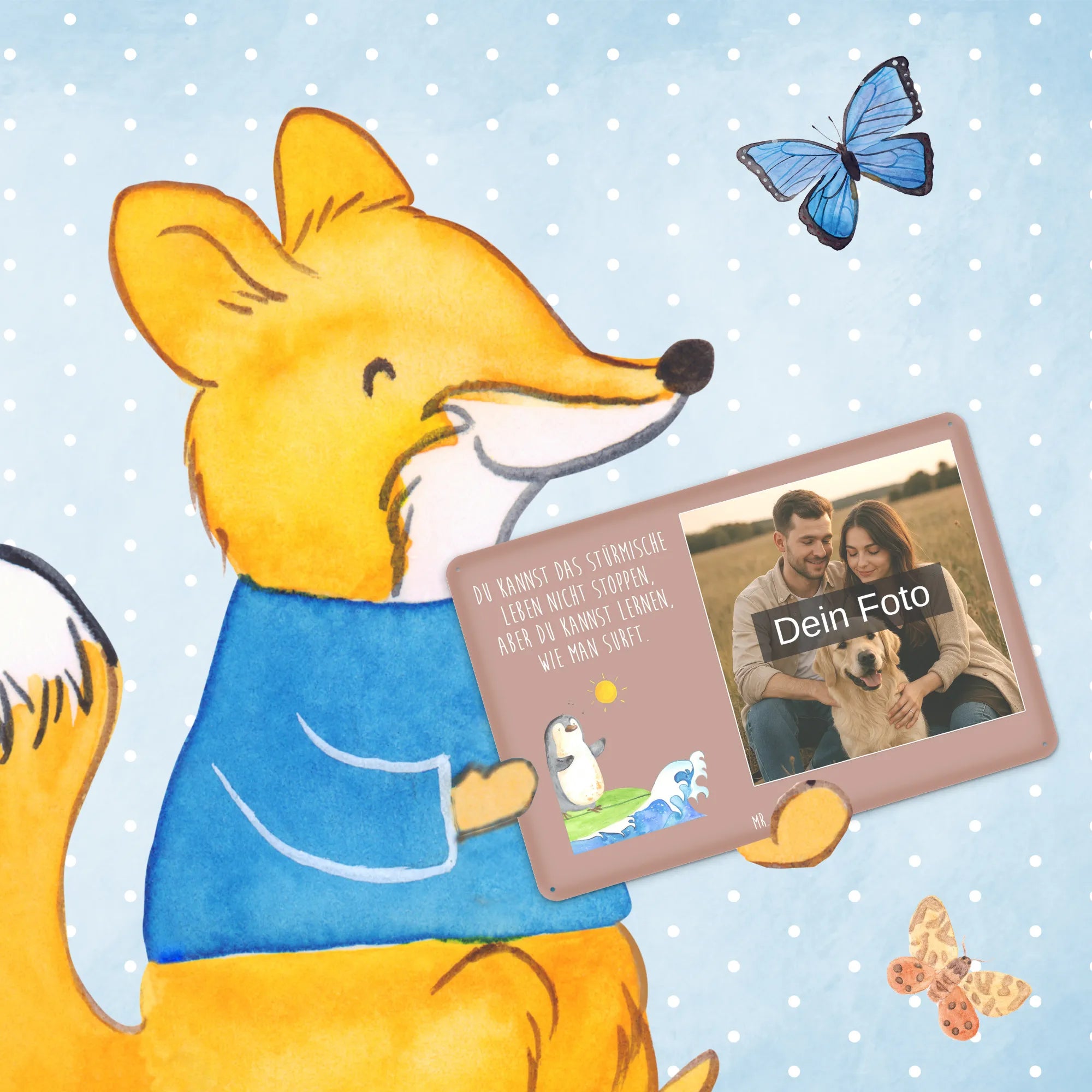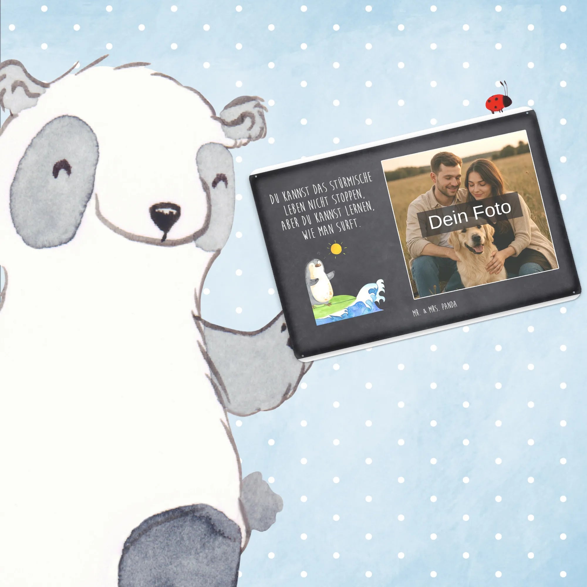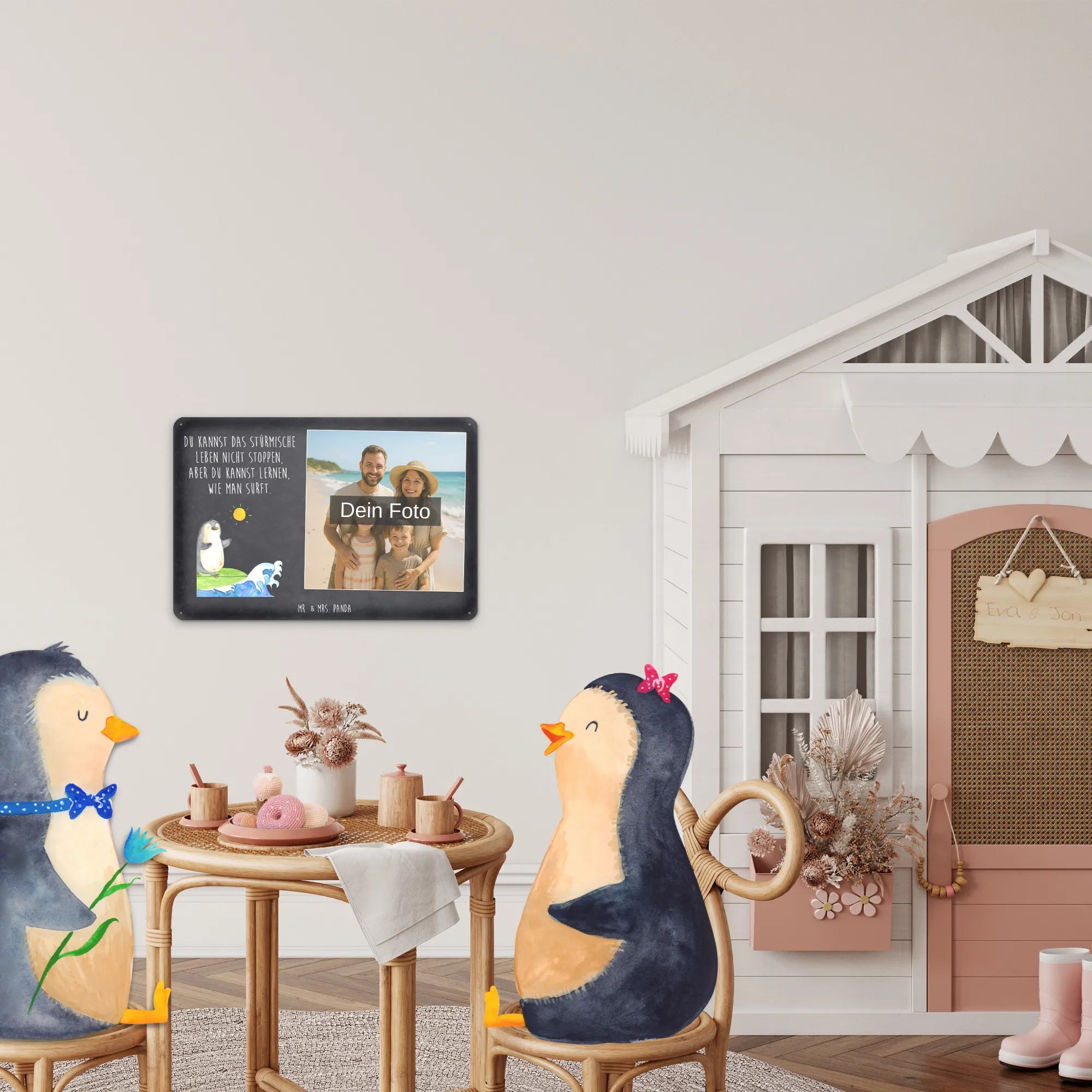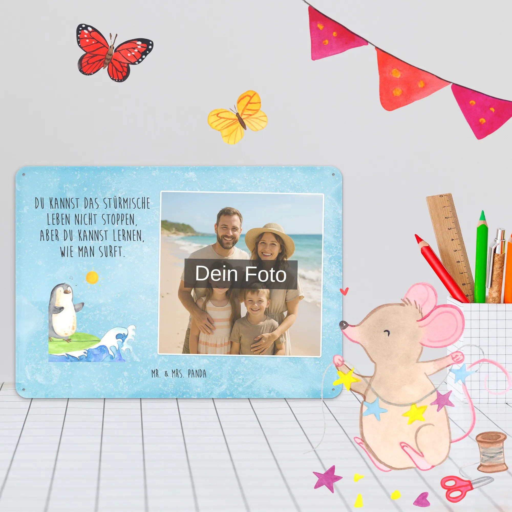 Spersonalizowany metalowy szyld ze zdjęciem Pingwin surfista - DIN A6 - lodowoniebieski