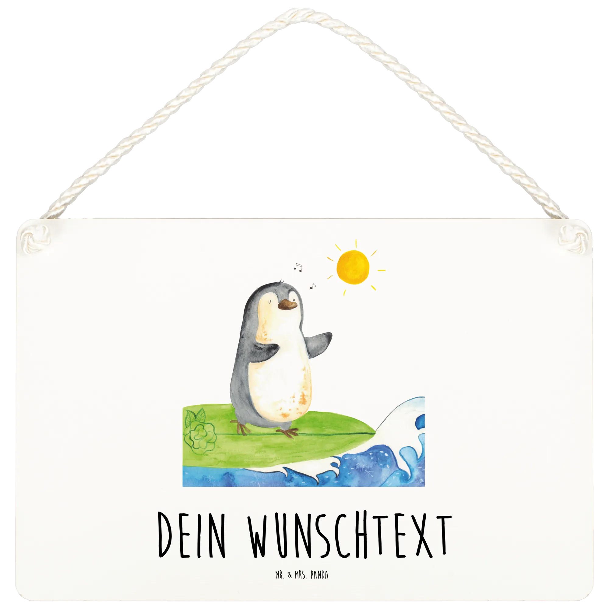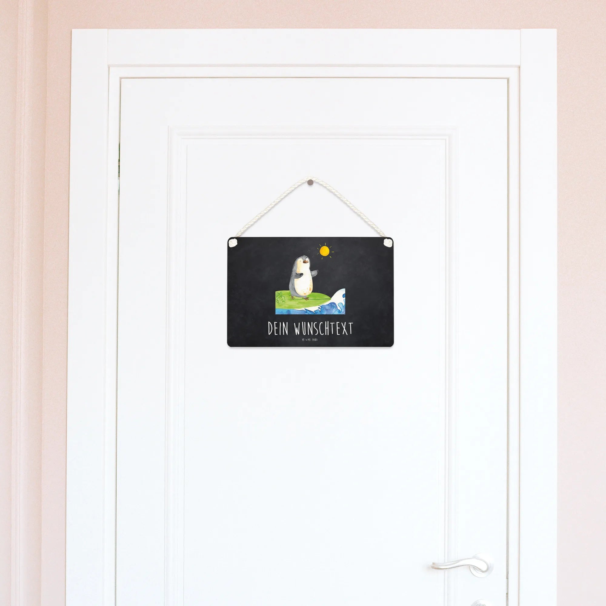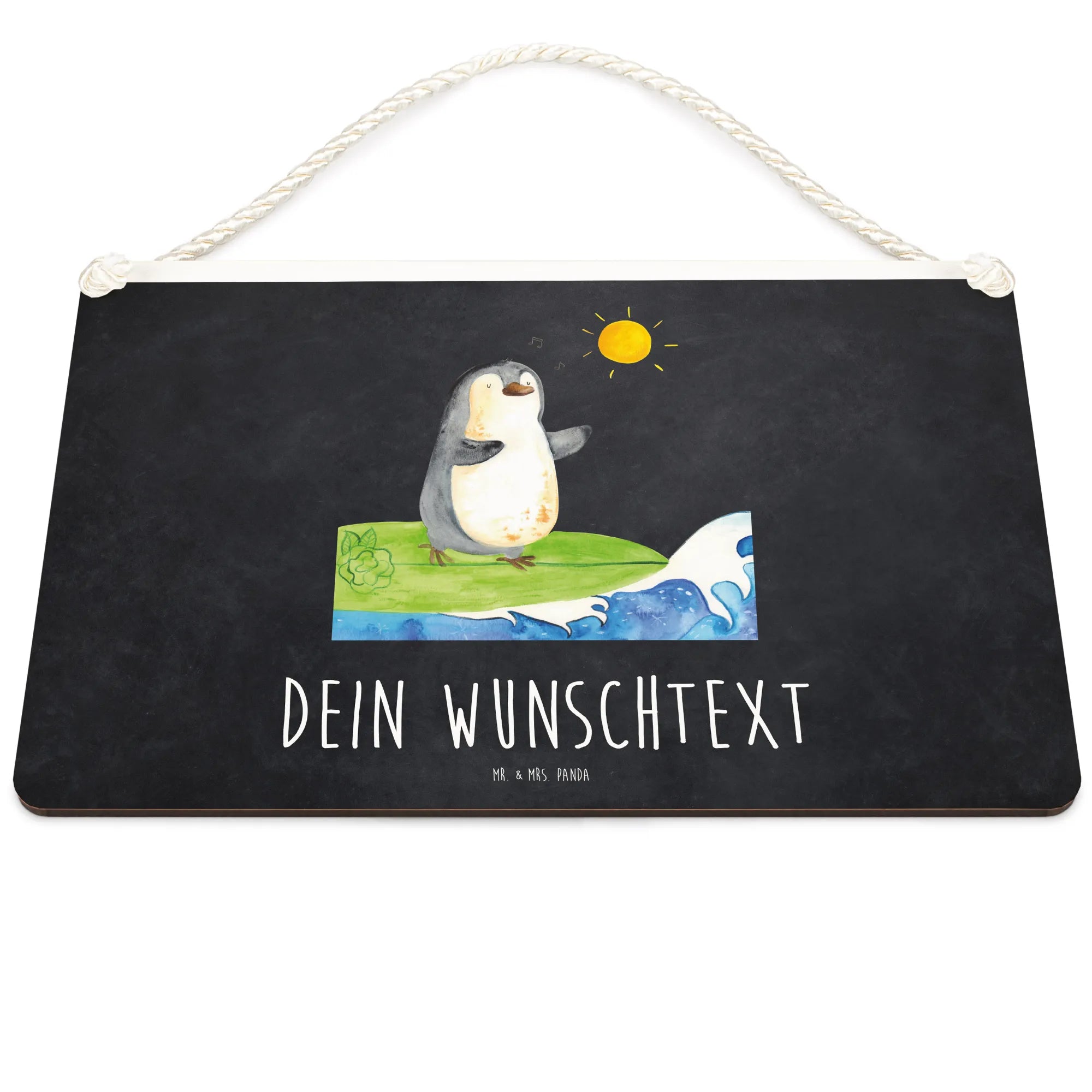 Spersonalizowany szyld dekoracyjny Pingwin surfista - DIN A6 - biały