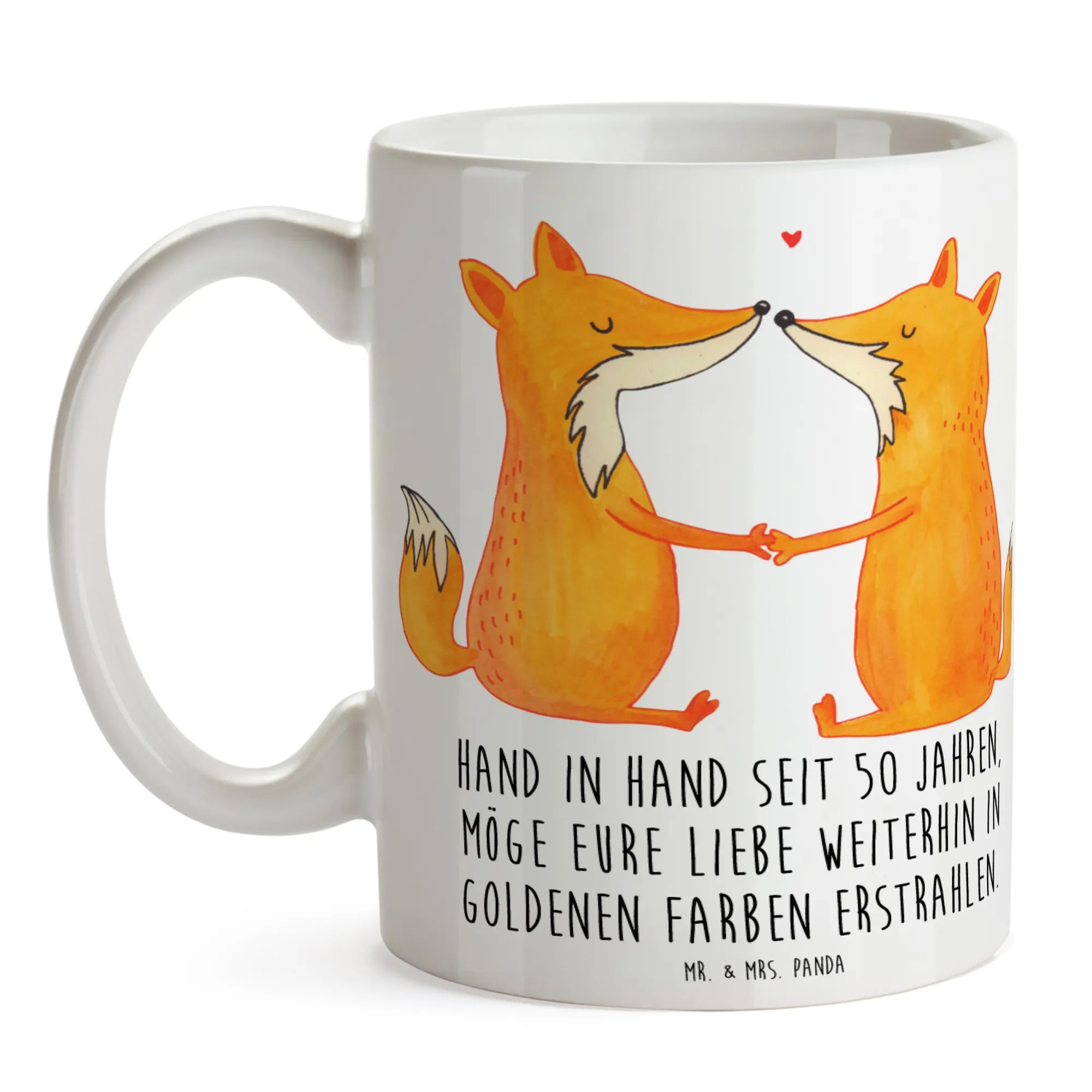 Die Tasse zum 50. Hochzeitstag, liebevoll gestaltet von Mr. & Mrs. Panda, ist das perfekte Geschenk für alle Paare, die ihr halbes Jahrhundert Liebe feiern! Diese wunderschöne, spülmaschinenfeste Keramiktasse besticht nicht nur durch ihre hohe Qualität, sondern gefällt auch mit einem herzlichen Spruch: "Hand in Hand seit 50 Jahren, möge eure Liebe weiterhin in goldenen Farben erstrahlen." Mit einer Füllmenge von 325 ml eignet sich die Tasse perfekt für eine köstliche Tasse Kaffee oder Tee am Morgen oder für eine gemütliche Kaffeerunde am Nachmittag. Egal, ob als Geschenk zur goldenen Hochzeit oder als Ehrung für die unvergängliche Liebe – diese Tasse ist ein wahrhaft persönliches Geschenk!