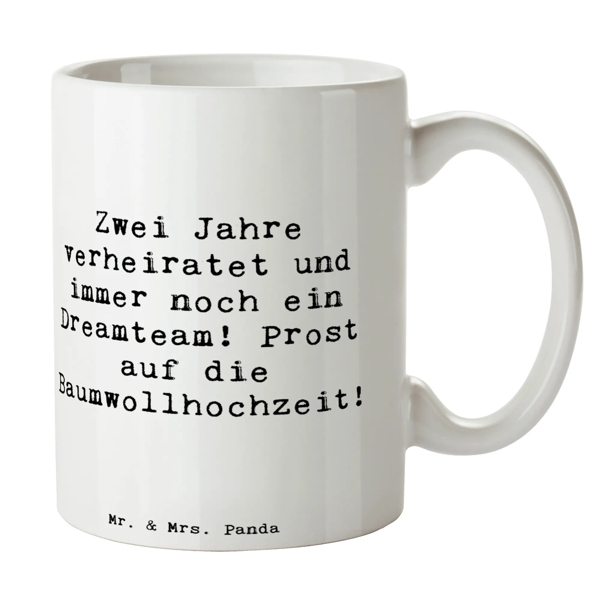 Die wunderschöne Kaffeetasse "2. Hochzeitstag Baumwollhochzeit" von Mr. & Mrs. Panda ist das perfekte Geschenk für Paare, die ihr zweijähriges Ehejubiläum feiern. Diese charmante Keramiktasse, brillant bedruckt mit dem spritzigen Slogan "Zwei Jahre verheiratet und immer noch ein Dreamteam! Prost auf die Baumwollhochzeit!", bringt ein Lächeln in den Alltag.