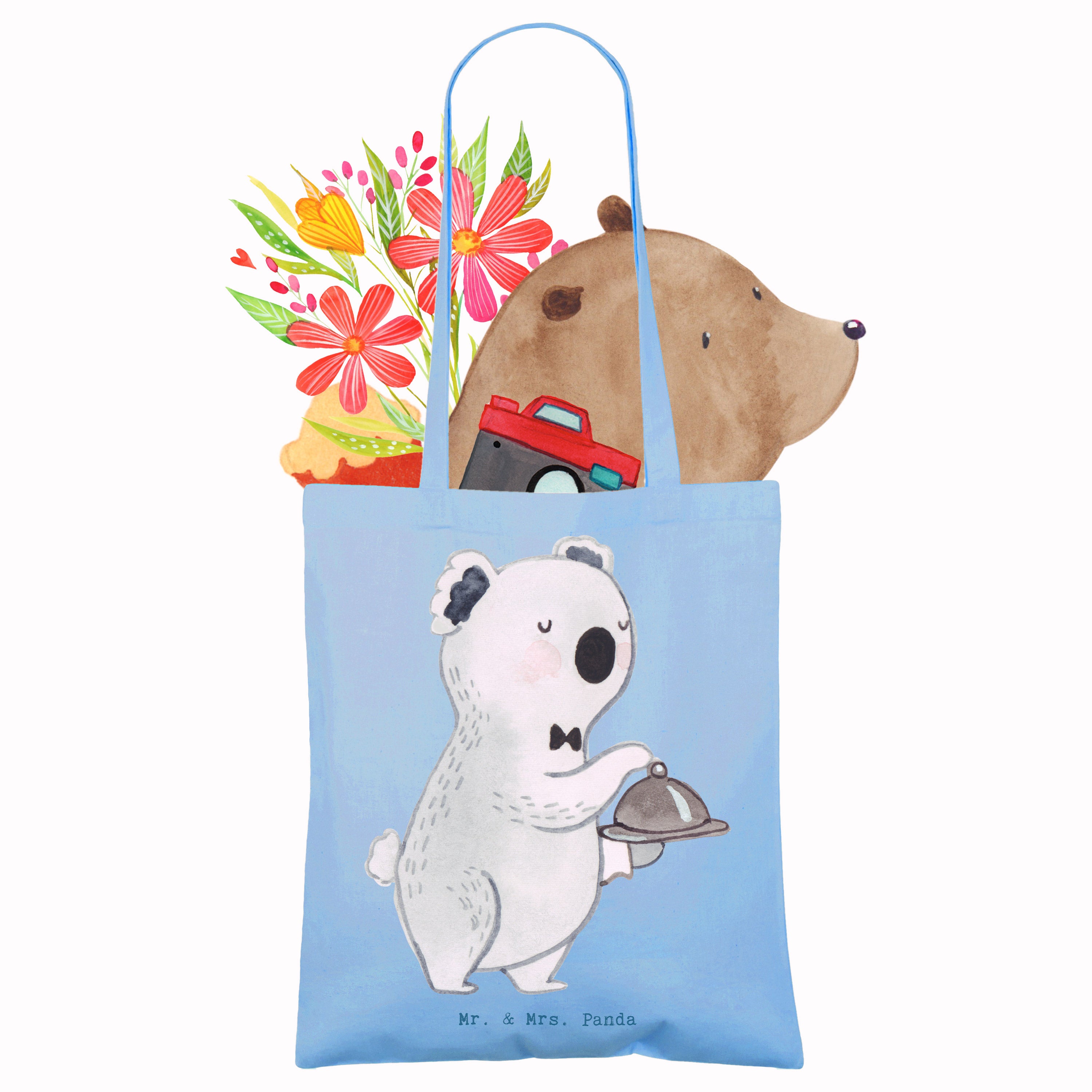 Diese zauberhafte Tragetasche ist ein liebevolles Geschenk für alle im Service: für Auszubildende, Restaurantfachleute, Abschiedsgeschenke an Kollegen oder als Dankeschön an treue Mitarbeiter. Das handgezeichnete Aquarellmotiv von Mrs. Panda zeigt einen entzückenden Koala, der mit Herz und Humor das Leben im Restaurant feiert. Das ruhige Sky Blue im Hintergrund lässt das Motiv freundlich strahlen.