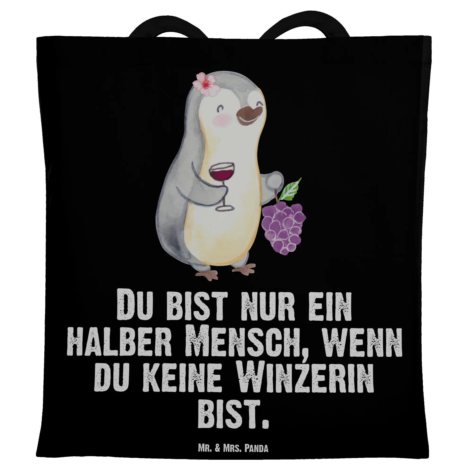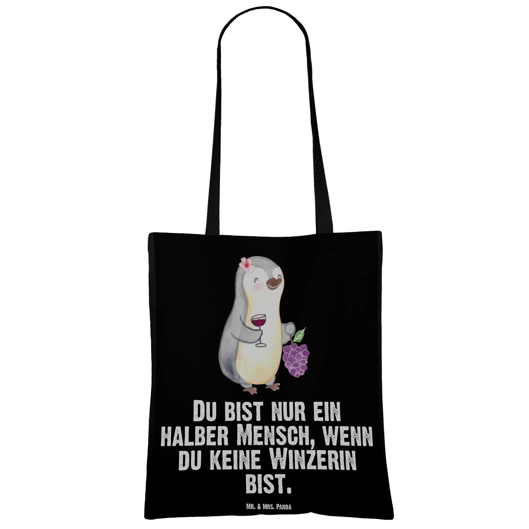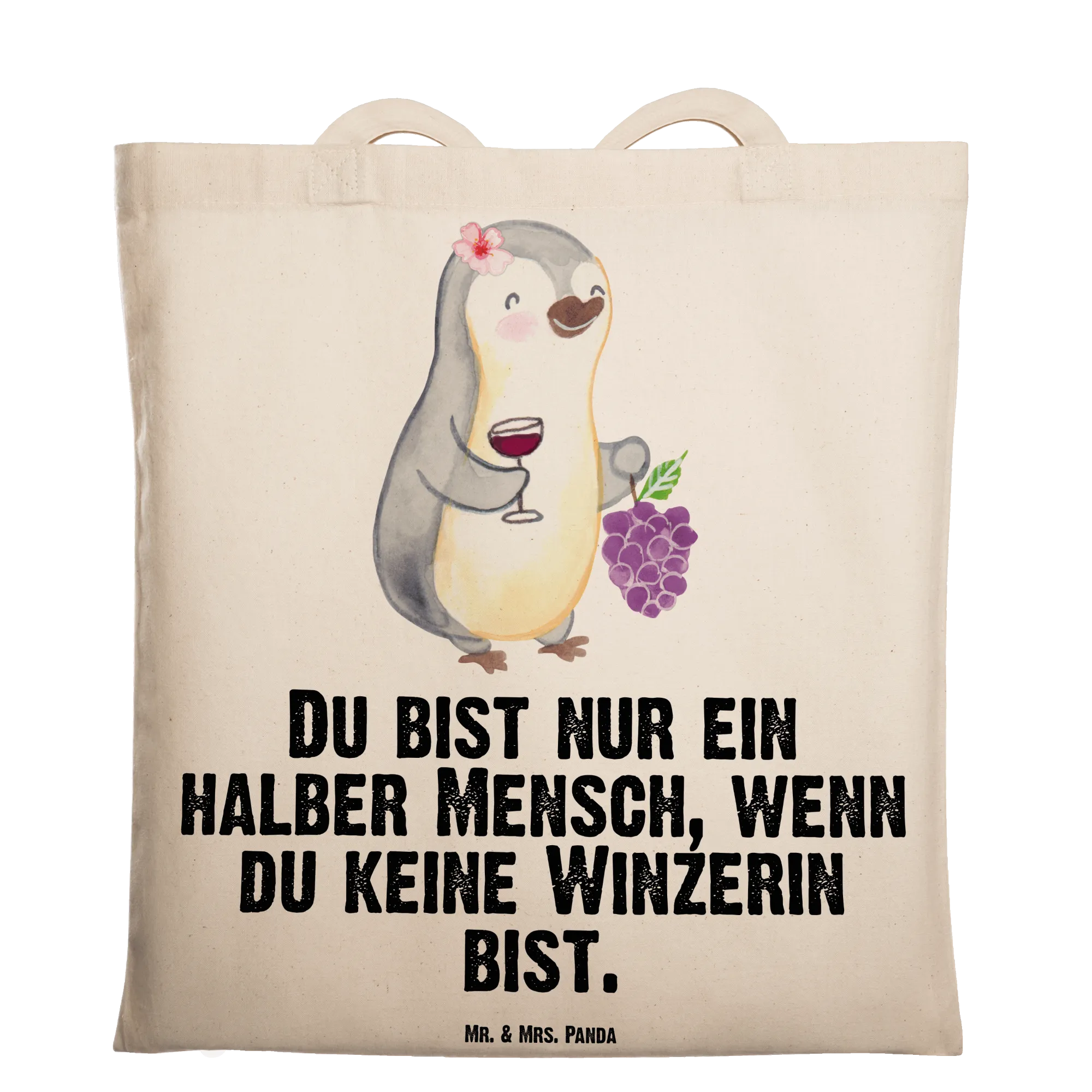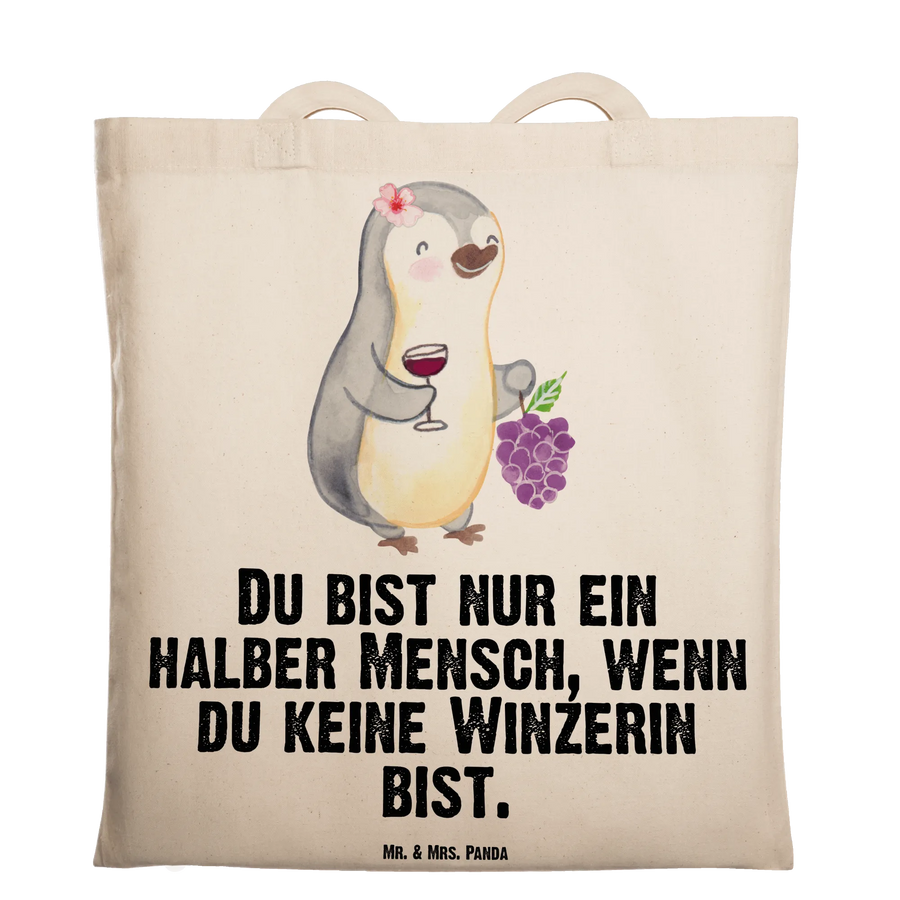 Suchst du ein liebevolles Geschenk für eine Winzerin, eine Kollegin im Weingut oder die Freundin, die Wein und Humor liebt? Unsere Tragetasche „Winzerin mit Herz“ vereint niedliches Design und praktischen Alltagssinn. Das Motiv zeigt eine fröhliche, weibliche Pinguin-Winzerin mit Weintrauben und einem gefüllten Glas – handgezeichnet in Aquarell von Mrs. Panda – und den frechen Spruch „Du bist nur ein halber Mensch, wenn du keine Winzerin bist.“