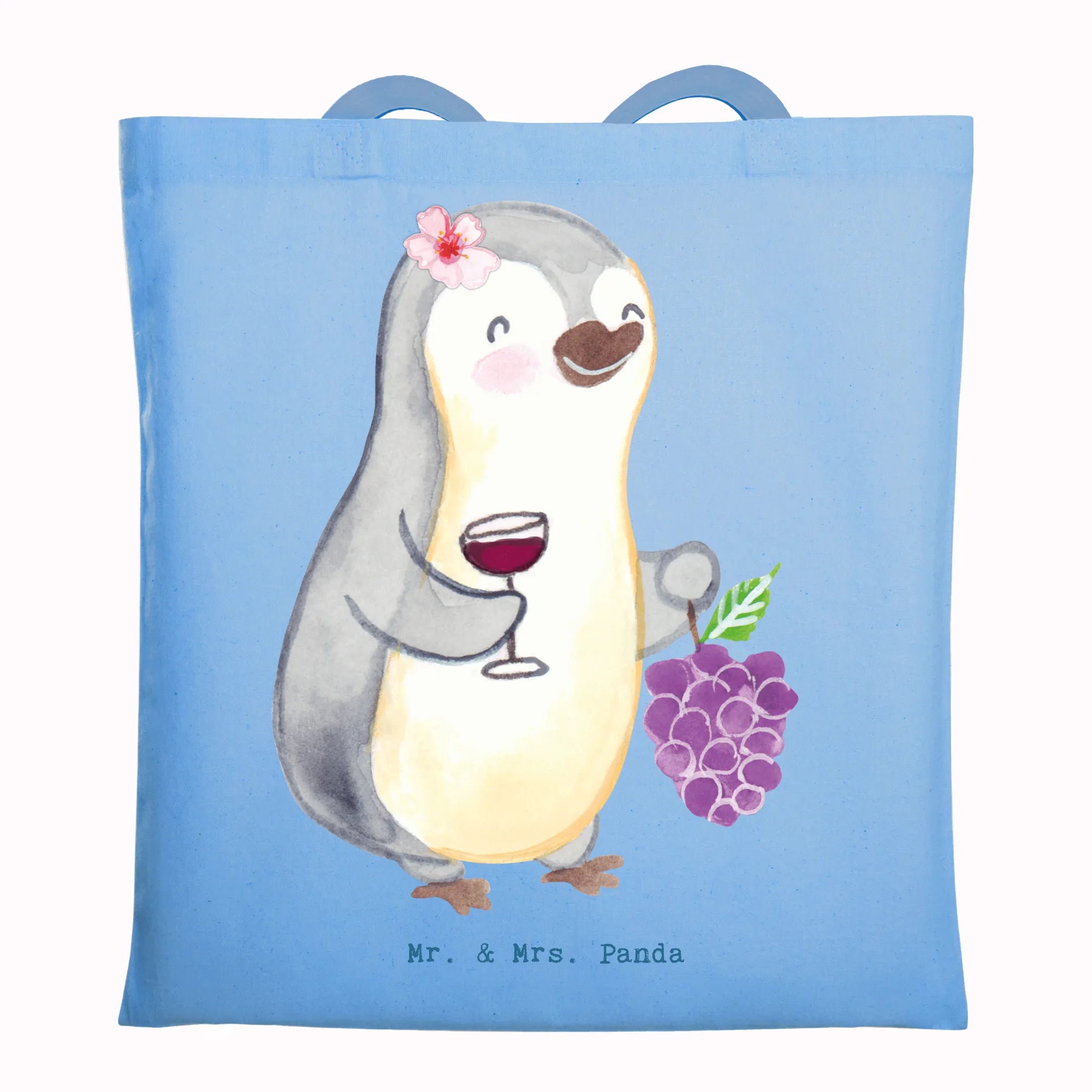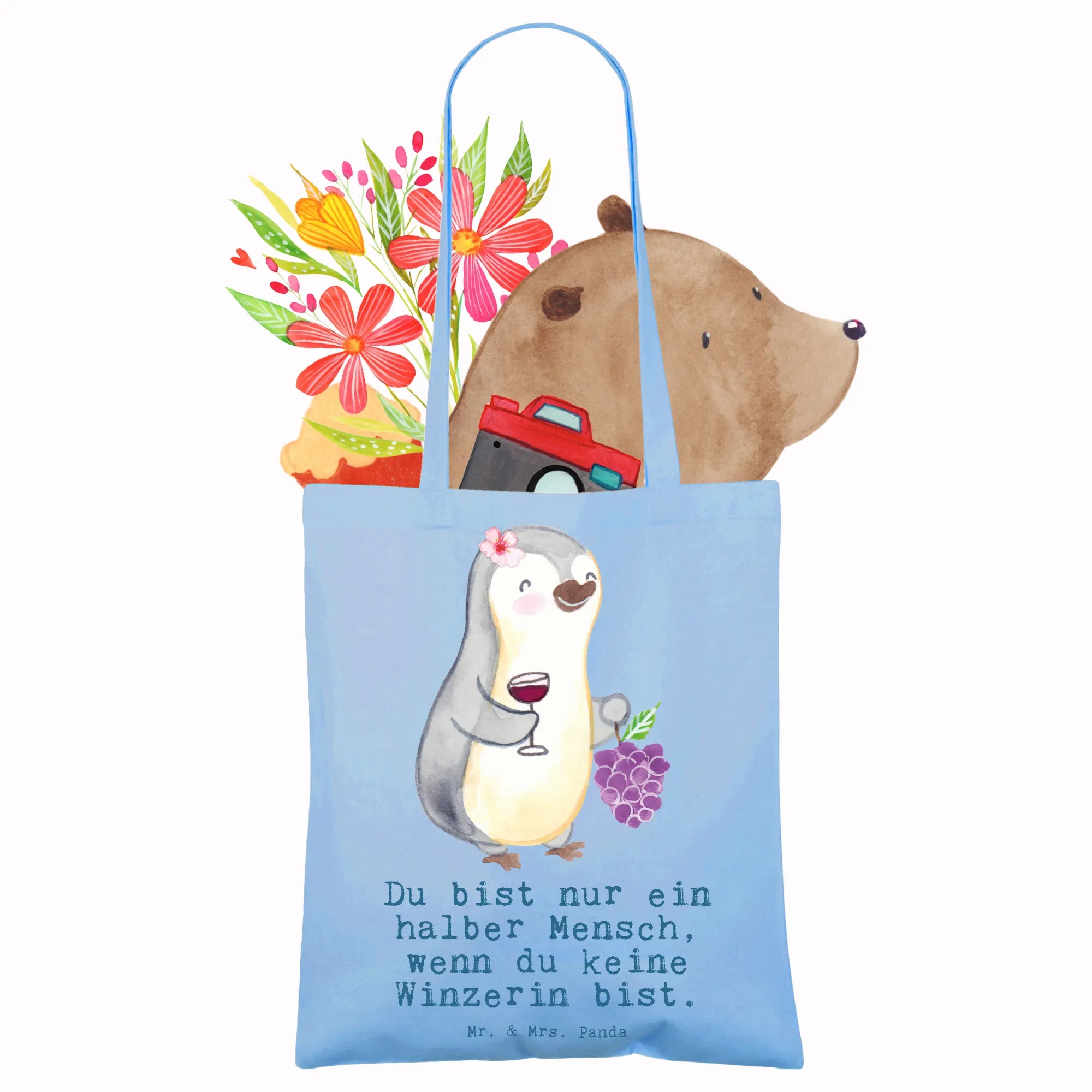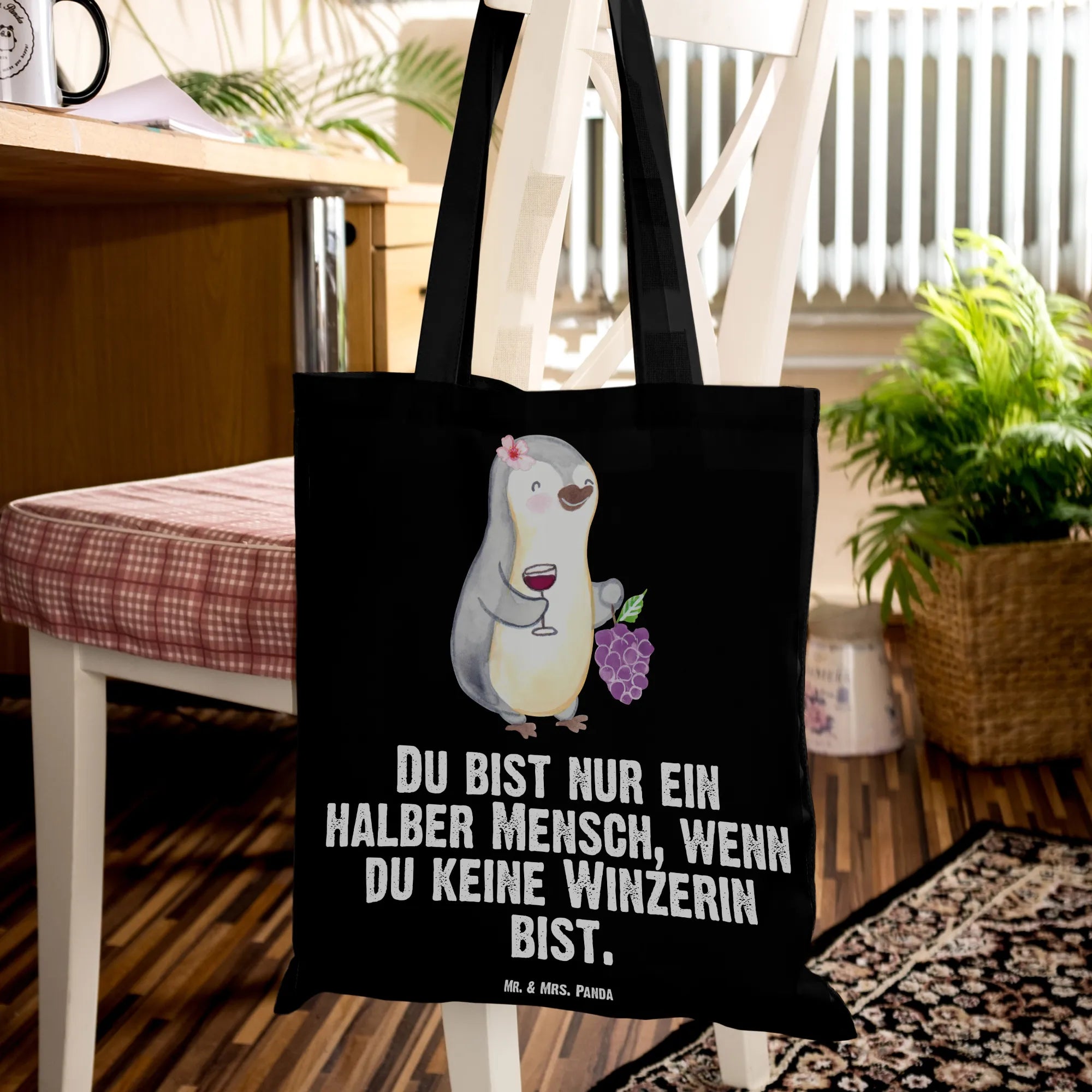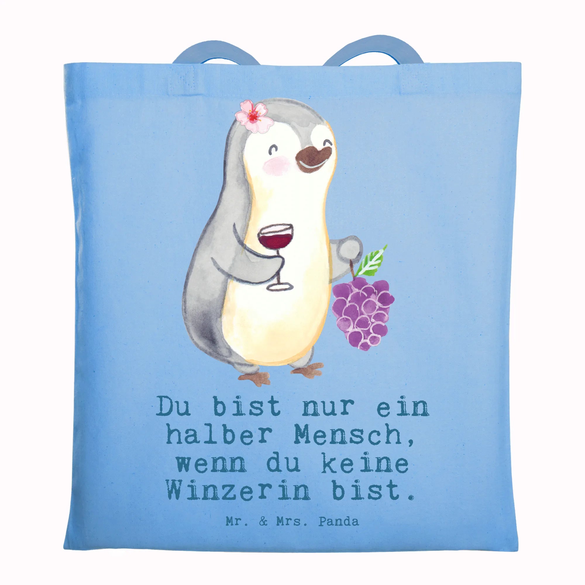 Suchst du ein liebevolles Geschenk für eine Winzerin, eine Kollegin im Weingut oder die Freundin, die Wein und Humor liebt? Unsere Tragetasche „Winzerin mit Herz“ vereint niedliches Design und praktischen Alltagssinn. Das Motiv zeigt eine fröhliche, weibliche Pinguin-Winzerin mit Weintrauben und einem gefüllten Glas – handgezeichnet in Aquarell von Mrs. Panda – und den frechen Spruch „Du bist nur ein halber Mensch, wenn du keine Winzerin bist.“