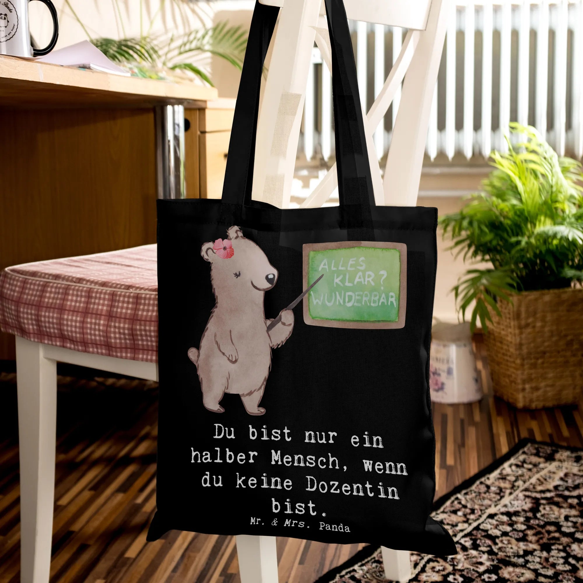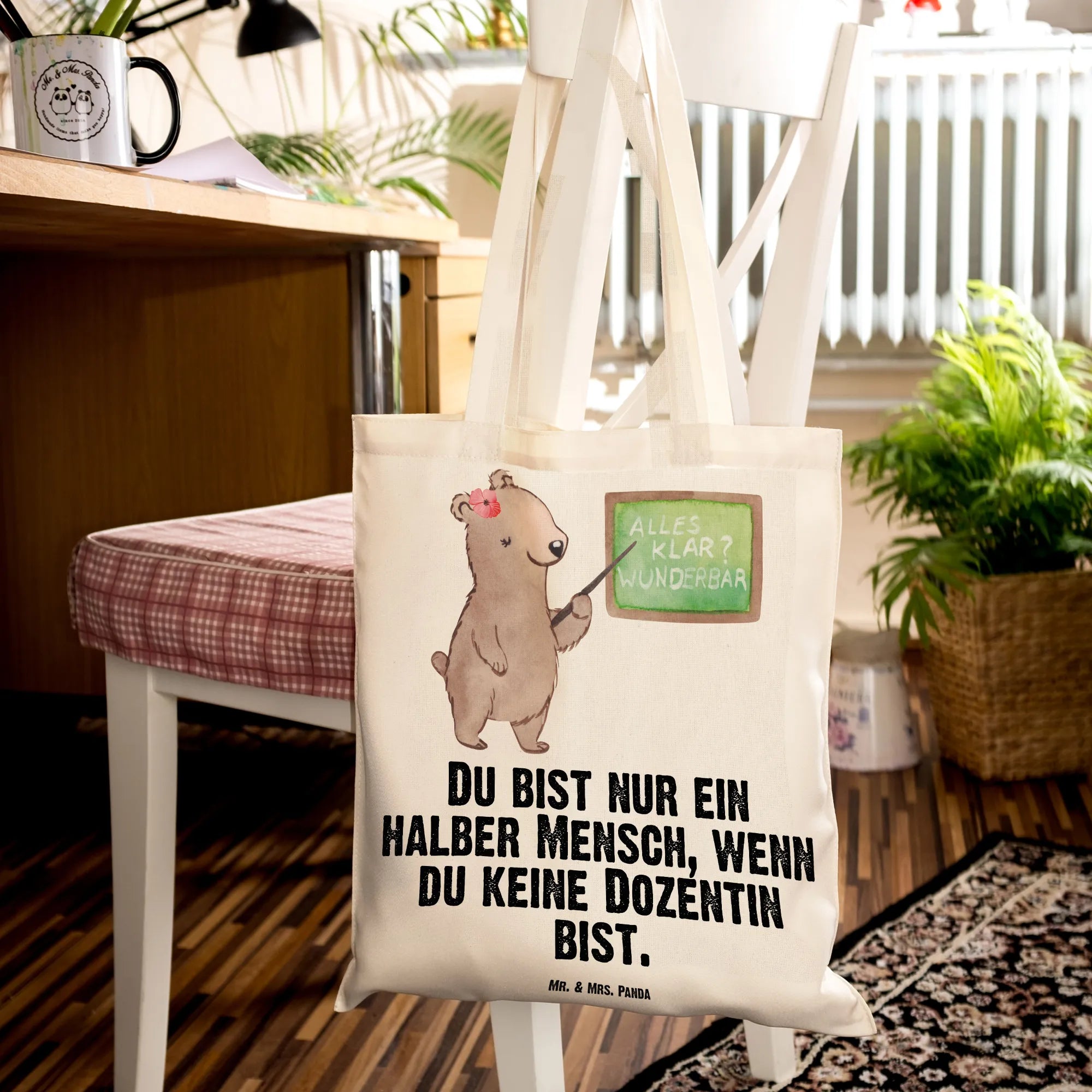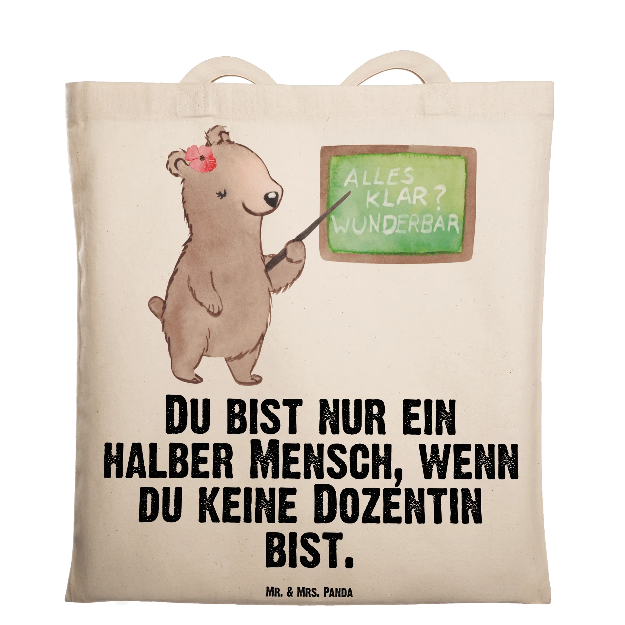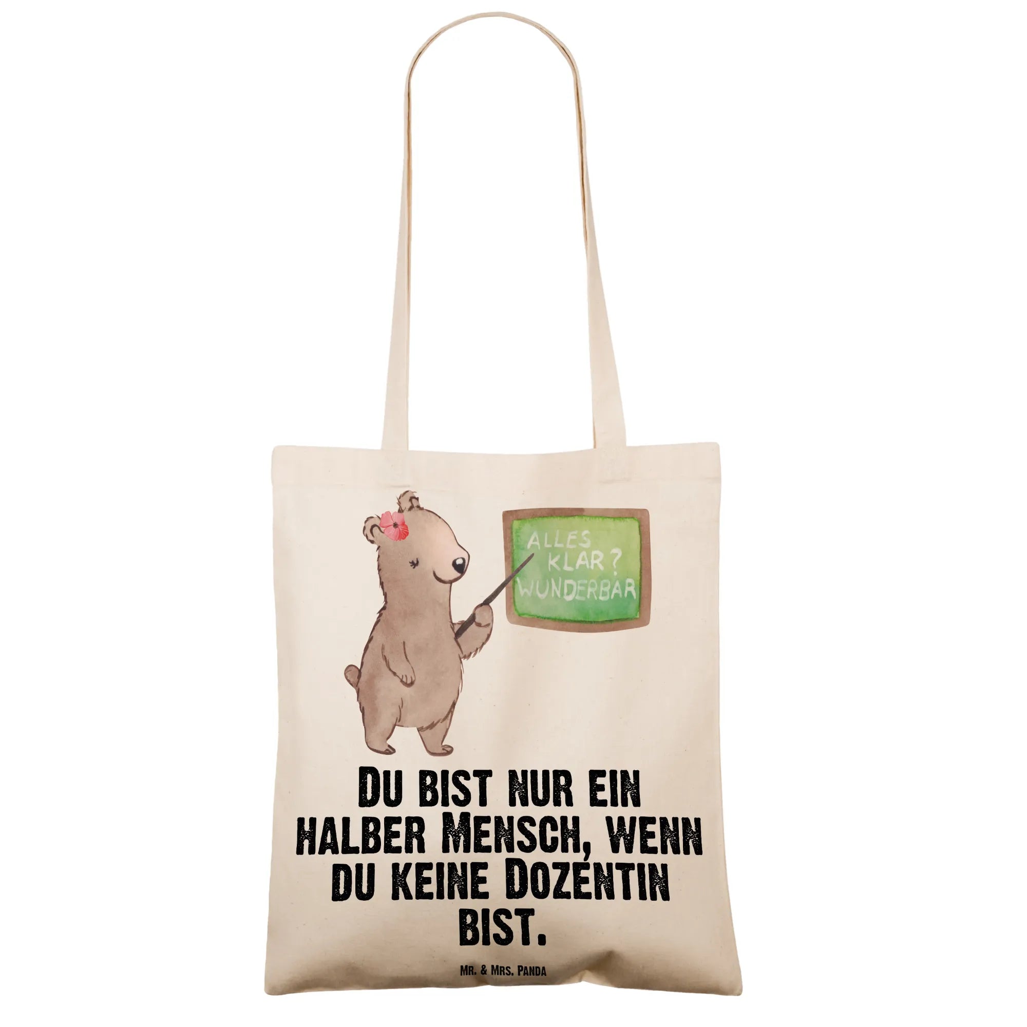 Unsere liebevoll gestaltete Stofftasche zeigt eine kleine Bärendame vor der Schultafel – handgezeichnet und aquarelliert von Mrs. Panda. Sie strahlt Wärme, Kompetenz und Humor aus und ist damit ein ideales Präsent für Dozentinnen, Tutorinnen, Professorinnen und alle, die an der Universität und in der Lehre arbeiten.