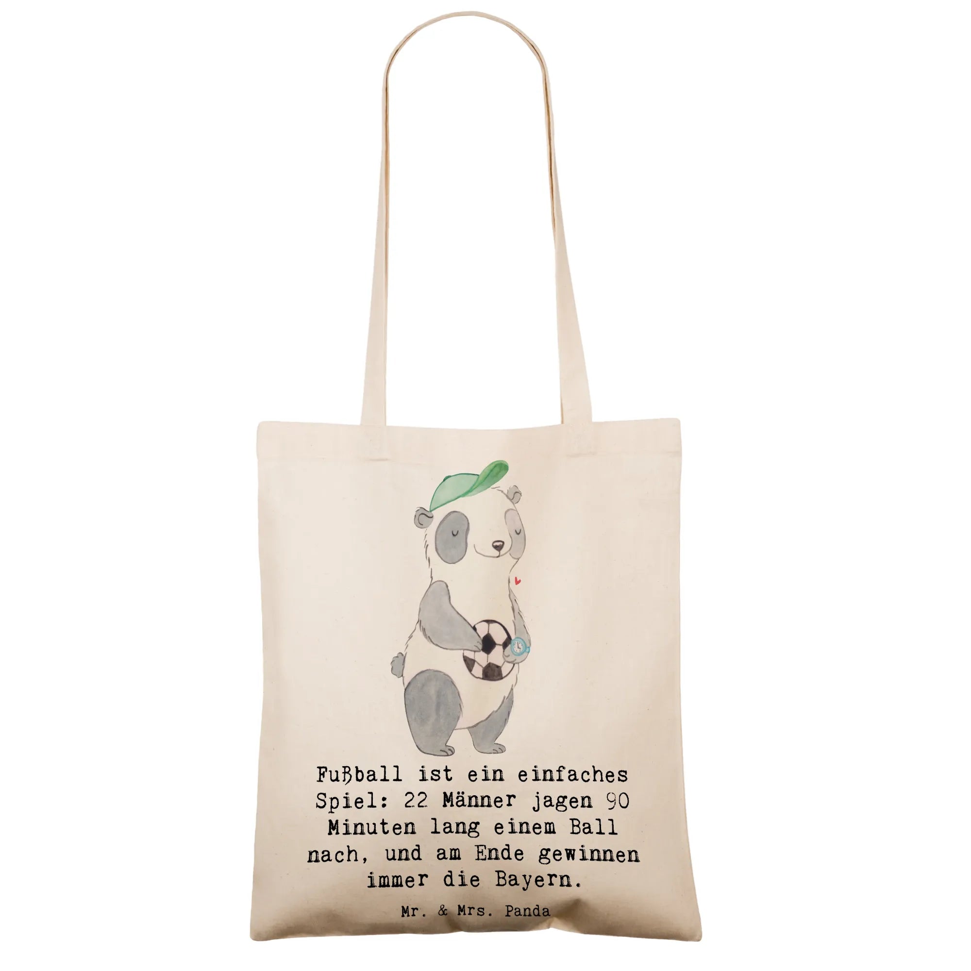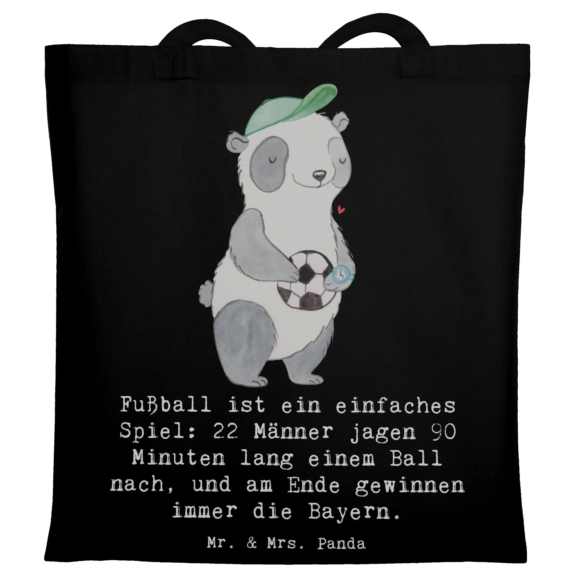 Mr. & Mrs. Panda Tragetasche „Fußball“ – die perfekte Kombination aus liebevollem Design und praktischer Alltagstauglichkeit. ⚽️👜 Auf schwarzem Hintergrund zeigt die Tasche unser handgemaltes Fußball-Motiv und den frechen Spruch: „Fußball ist ein einfaches Spiel: 22 Männer jagen 90 Minuten lang einem Ball nach, und am Ende gewinnen immer die Bayern.“ Ein echter Hingucker für Fans, Spieler und Trainer.