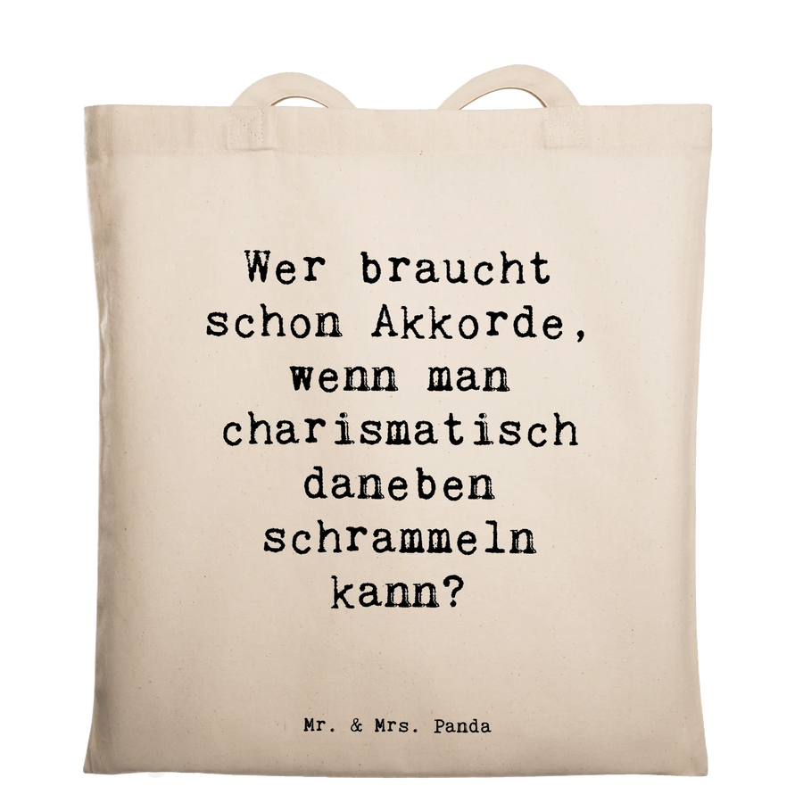 Bist du auf der Suche nach dem perfekten Geschenk für einen leidenschaftlichen Musiker oder einfach einen Musikliebhaber? Dann ist die Tragetasche mit dem tollen Gitarre-Motiv aus der Collection „Musizieren & Instrumente“ von Mr. & Mrs. Panda genau das richtige für dich! Diese wunderschöne Tragetasche ist mit einem einzigartigen Design versehen, das nicht nur die Leidenschaft zur Musik zelebriert, sondern auch eine Botschaft vermittelt, die jeder Musiker nachvollziehen kann: "Wer braucht schon Akkorde, wenn man charismatisch daneben schrammeln kann?"