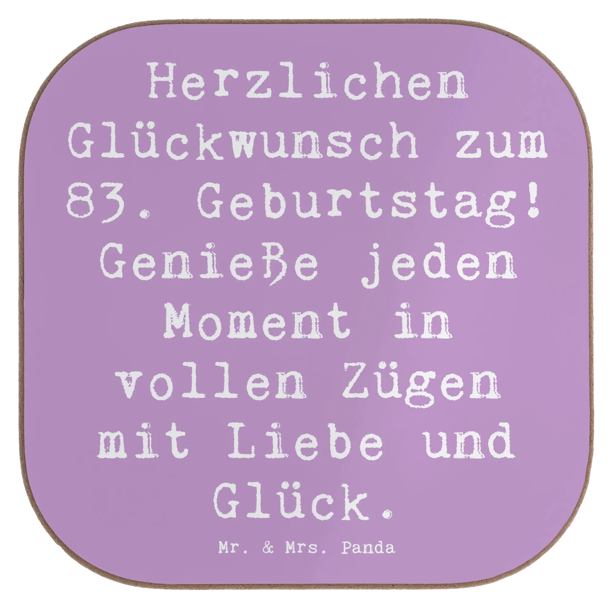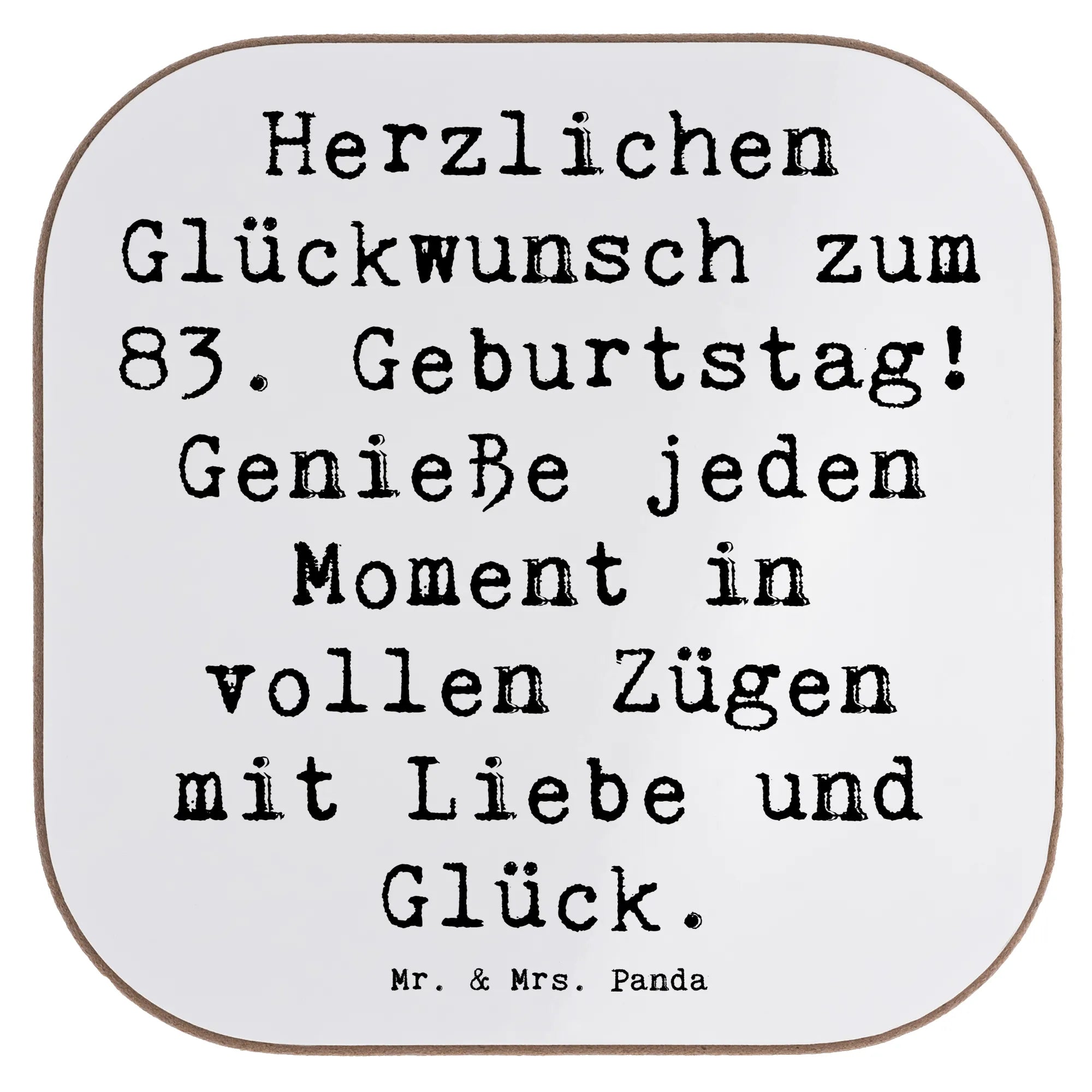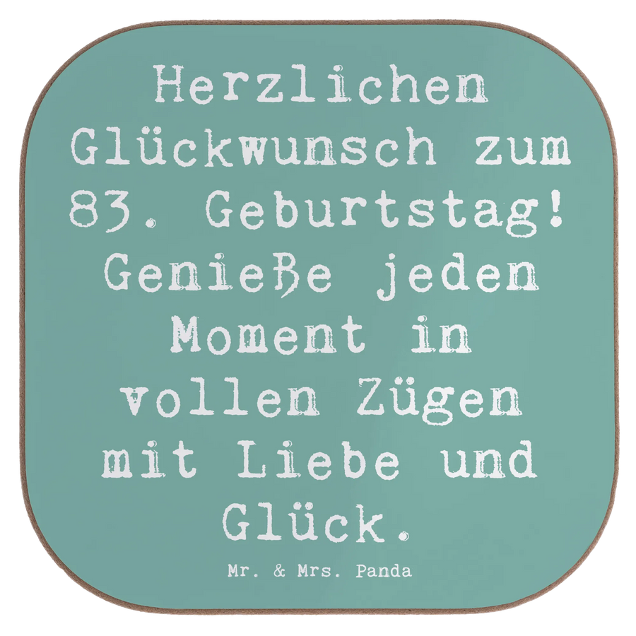 Unser quadratischer Untersetzer von Mr. & Mrs. Panda mit dem Slogan „Herzlichen Glückwunsch zum 83. Geburtstag! Genieße jeden Moment in vollen Zügen mit Liebe und Glück.“ ist das ideale Geschenk für alle, die einem besonderen Menschen eine kleine Freude machen wollen. Der Spruch steht im Mittelpunkt und bringt viel Herzlichkeit auf den Tisch.