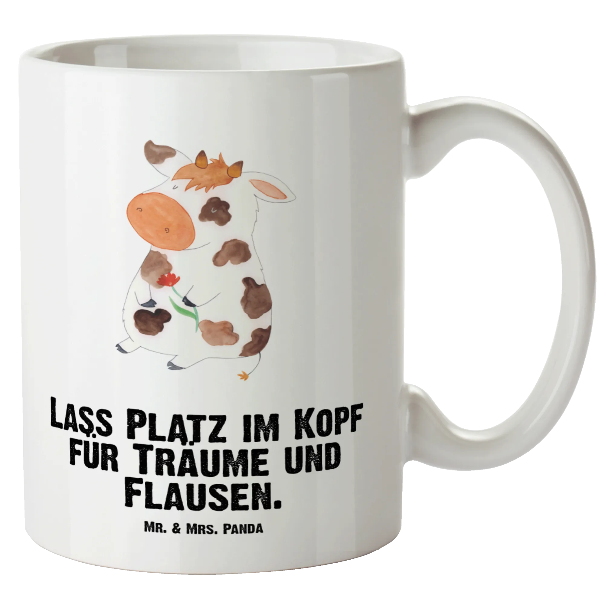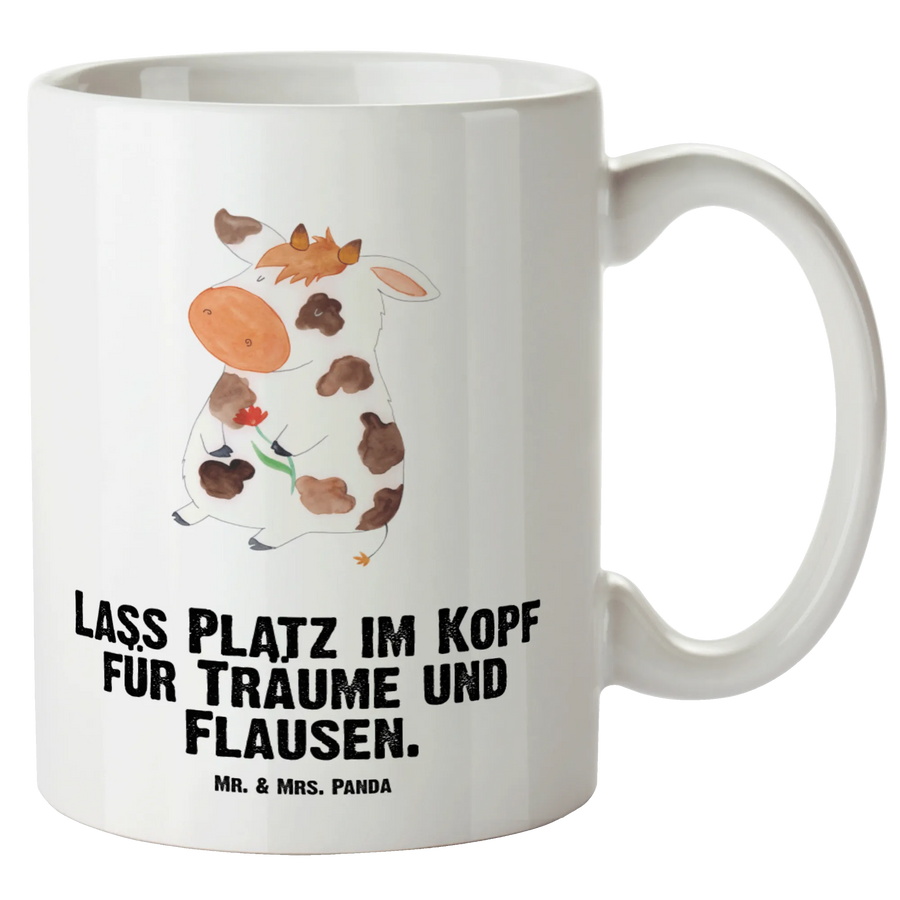 Die XL Tasse Kuh von Mr. & Mrs. Panda ist der perfekte Begleiter für all jene, die das Leben auf dem Bauernhof lieben! Mit einer Füllmenge von 500 ml bietet diese große Kaffeetasse genug Platz für Deinen Lieblingskaffee, Tee oder sogar eine leckere heiße Schokolade. Das zauberhafte Motiv einer kleinen, verträumten Kuh, die stolz mit einer Blume in der Hand strahlt, verleiht jedem Moment eine besondere magische Note. Der Spruch 'Lass Platz im Kopf für Träume und Flausen' inspiriert Dich dazu, kreativ zu sein und Deinen Alltag farbenfroh zu gestalten.