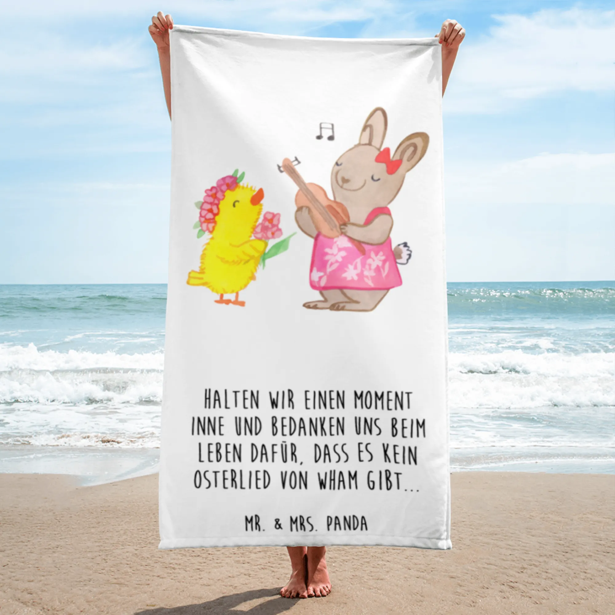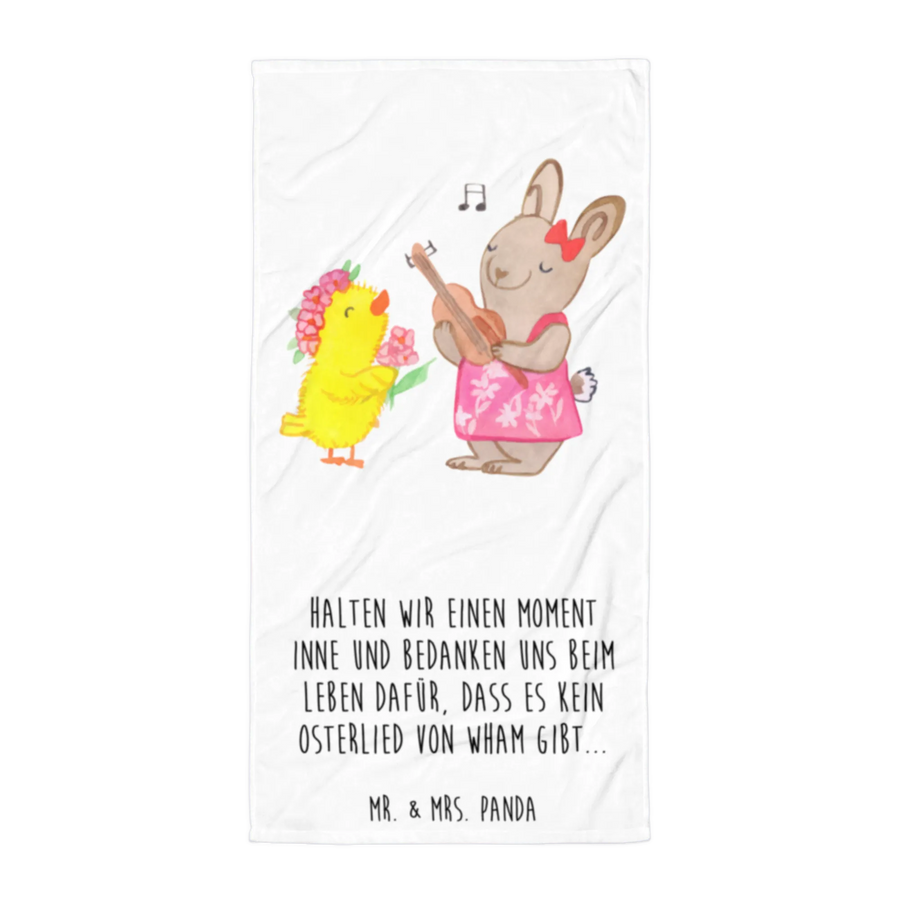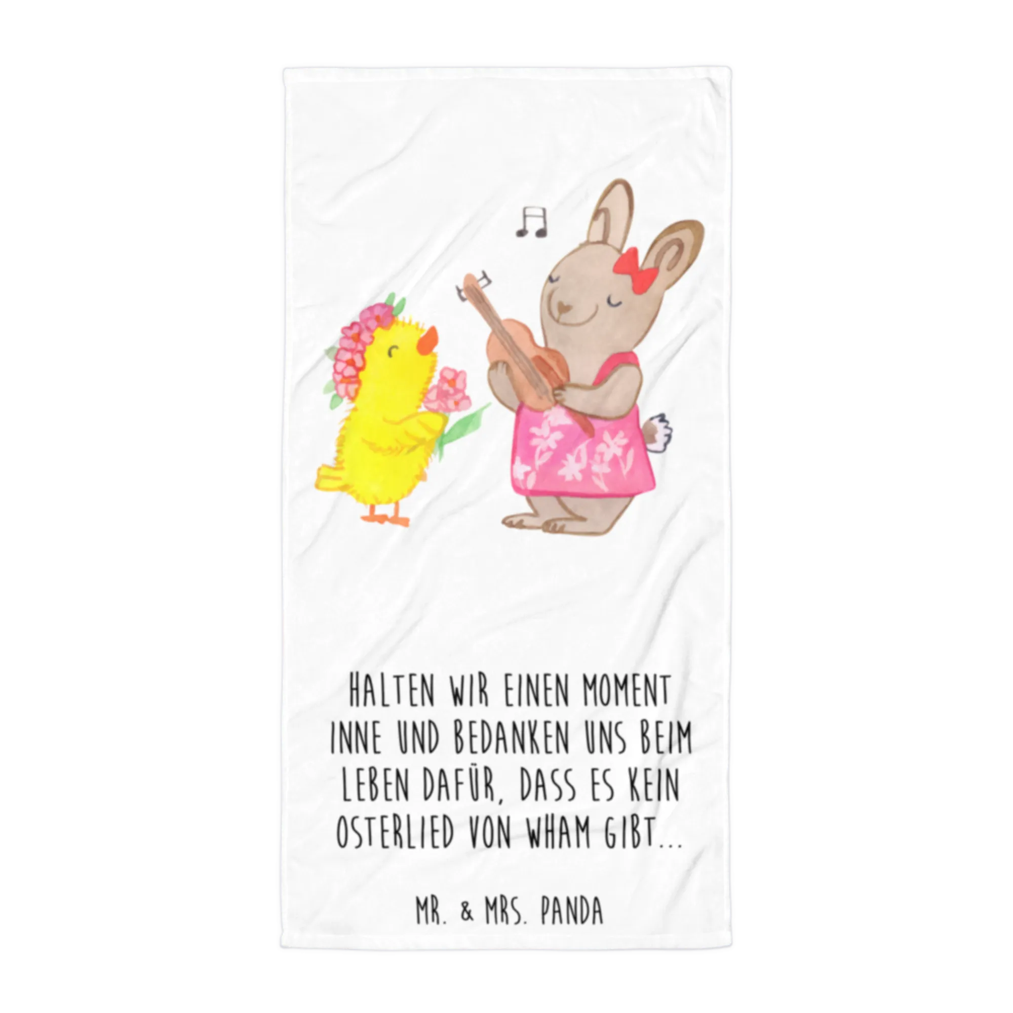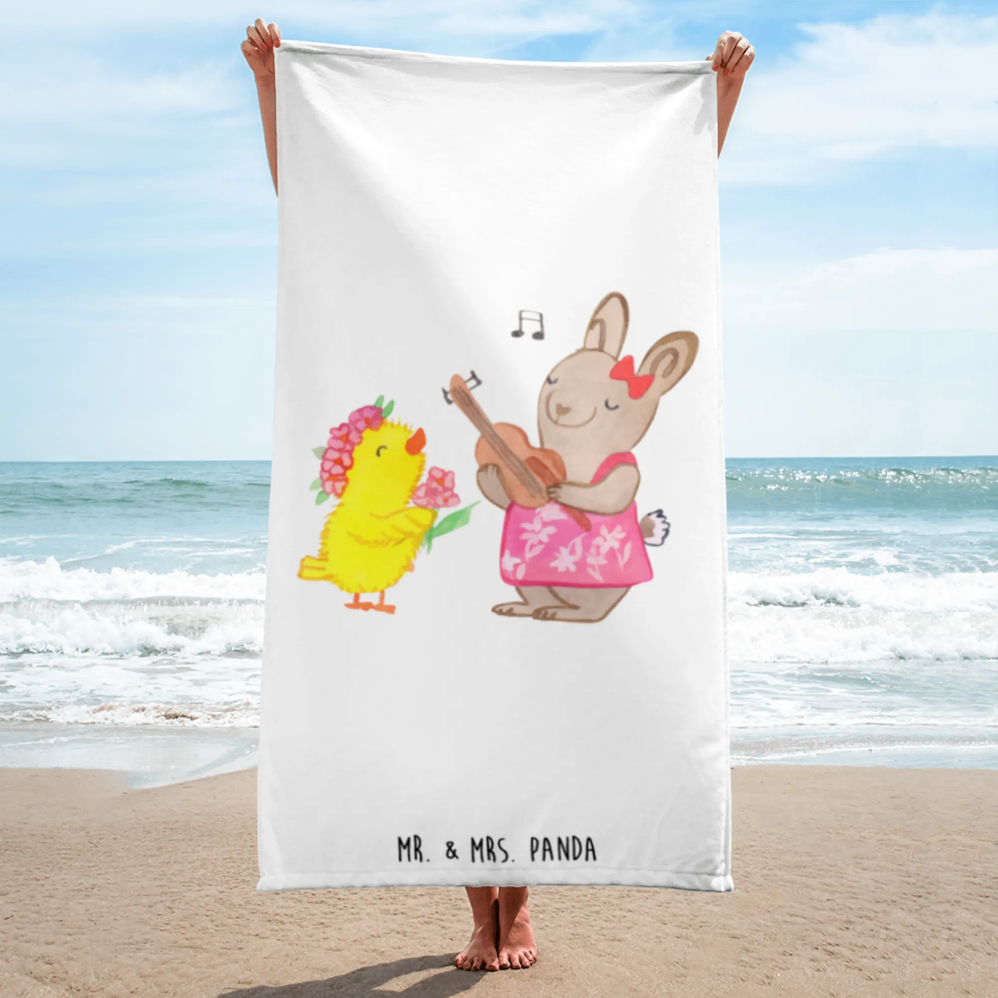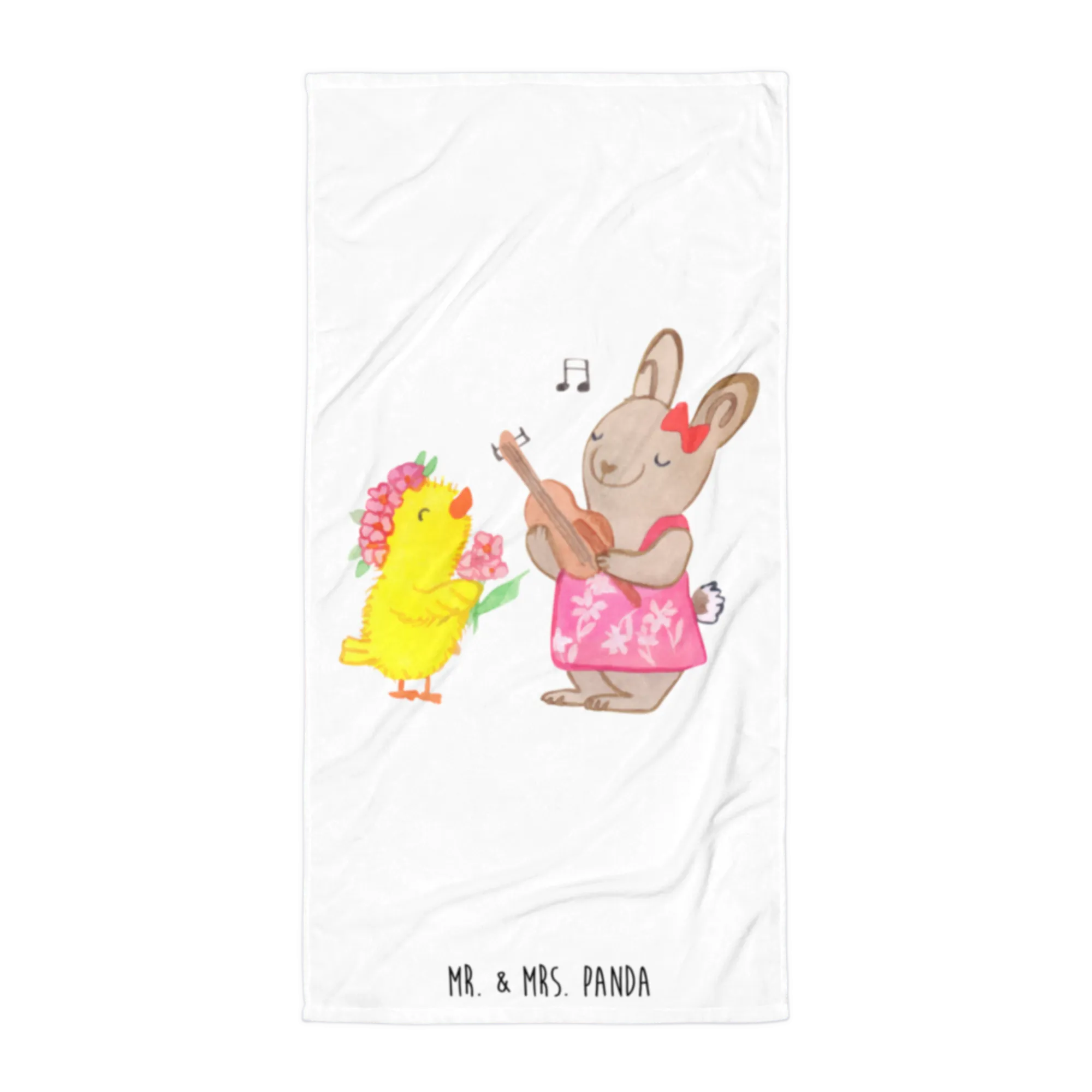 Das XL Badehandtuch Ostern Frühlingsgefühle von Mr. & Mrs. Panda ist das perfekte Geschenk für alle, die Ostern und die Frühlingsgefühle lieben! Mit einem liebevoll gestalteten Motiv, das einen süßen Hase im Sommerkleid zeigt, der einem kleinen Küken auf der Gitarre ein Lied vorspielt, bringt es dir ein Lächeln ins Gesicht.