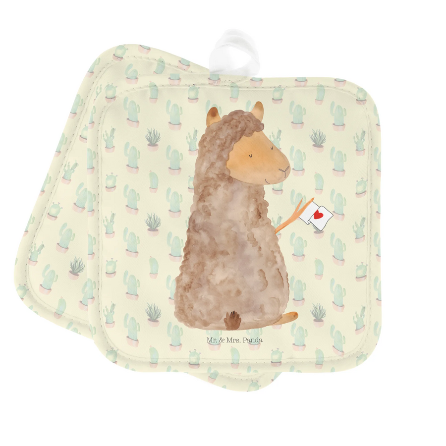 Die Mr. & Mrs. Panda Topflappen im 2er Set mit dem lustigen Alpaka Fahne Motiv sind das perfekte Geschenk für jeden Koch und Backliebhaber!