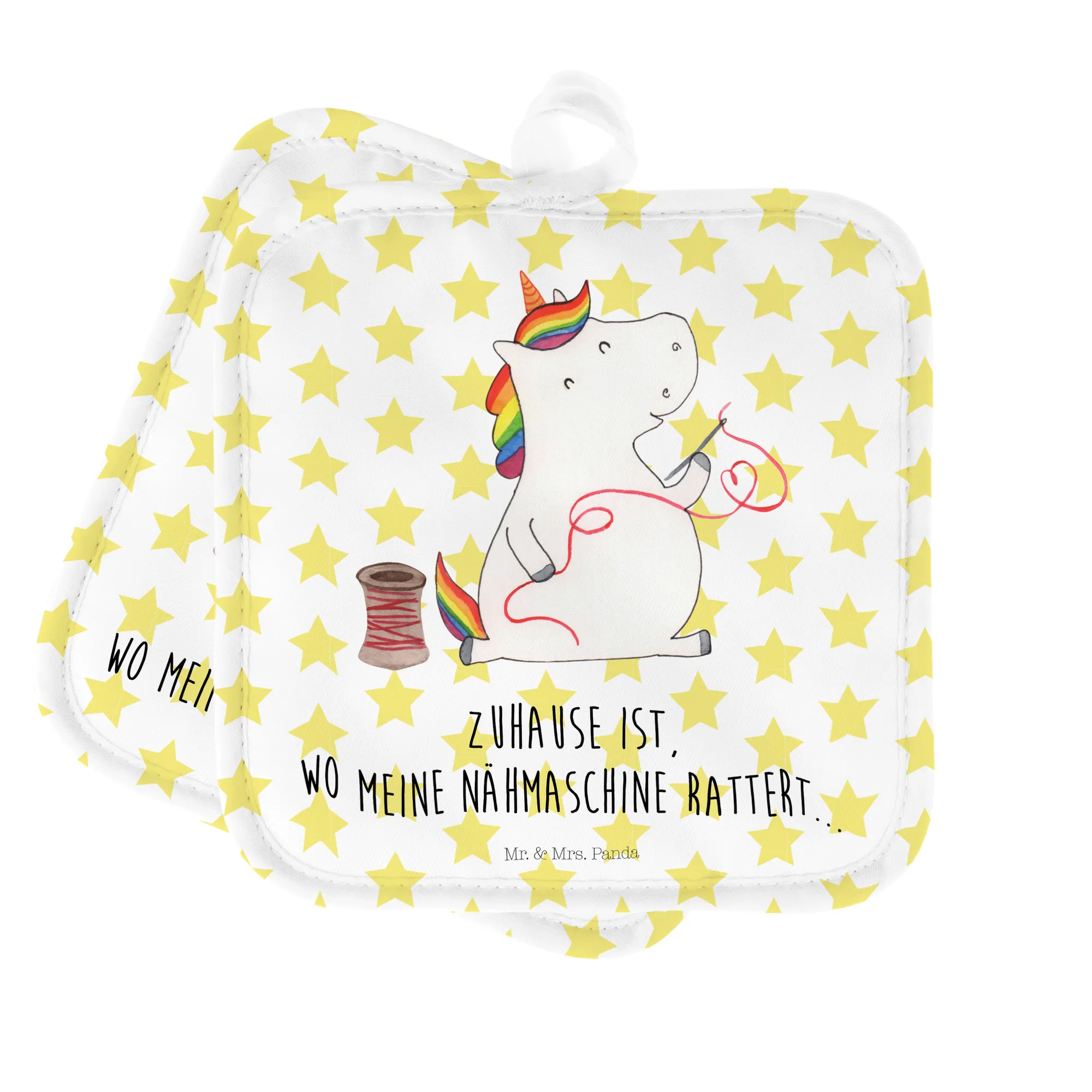Entdecke das 2er Set Topflappen Einhorn Näherin aus der bezaubernden Einhorn-Kollektion von Mr. & Mrs. Panda! Diese zwei wunderschönen Topflappen sind die perfekten Helfer in deiner Küche im zauberhaften Einhorn-Design. Mit liebevoll handgezeichneten Motiven und dem Spruch "Zuhause ist, wo meine Nähmaschine rattert" bringen sie ganz viel Freude beim Kochen und Backen.