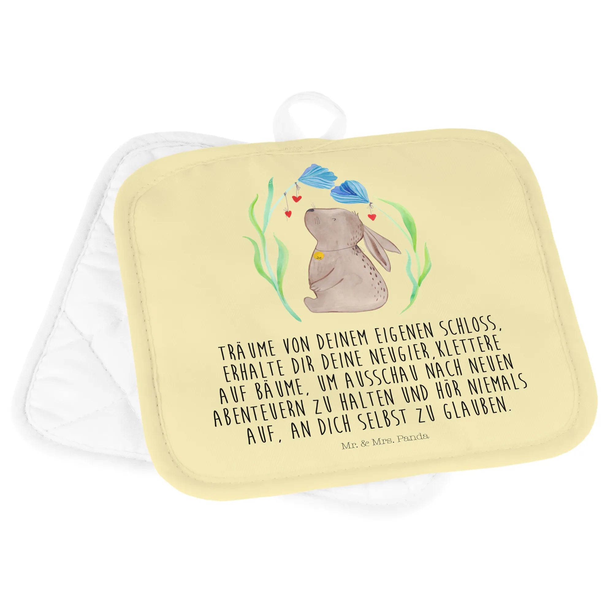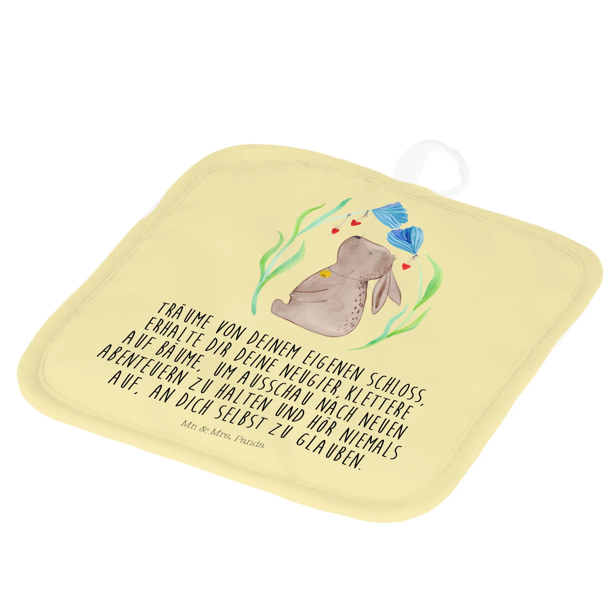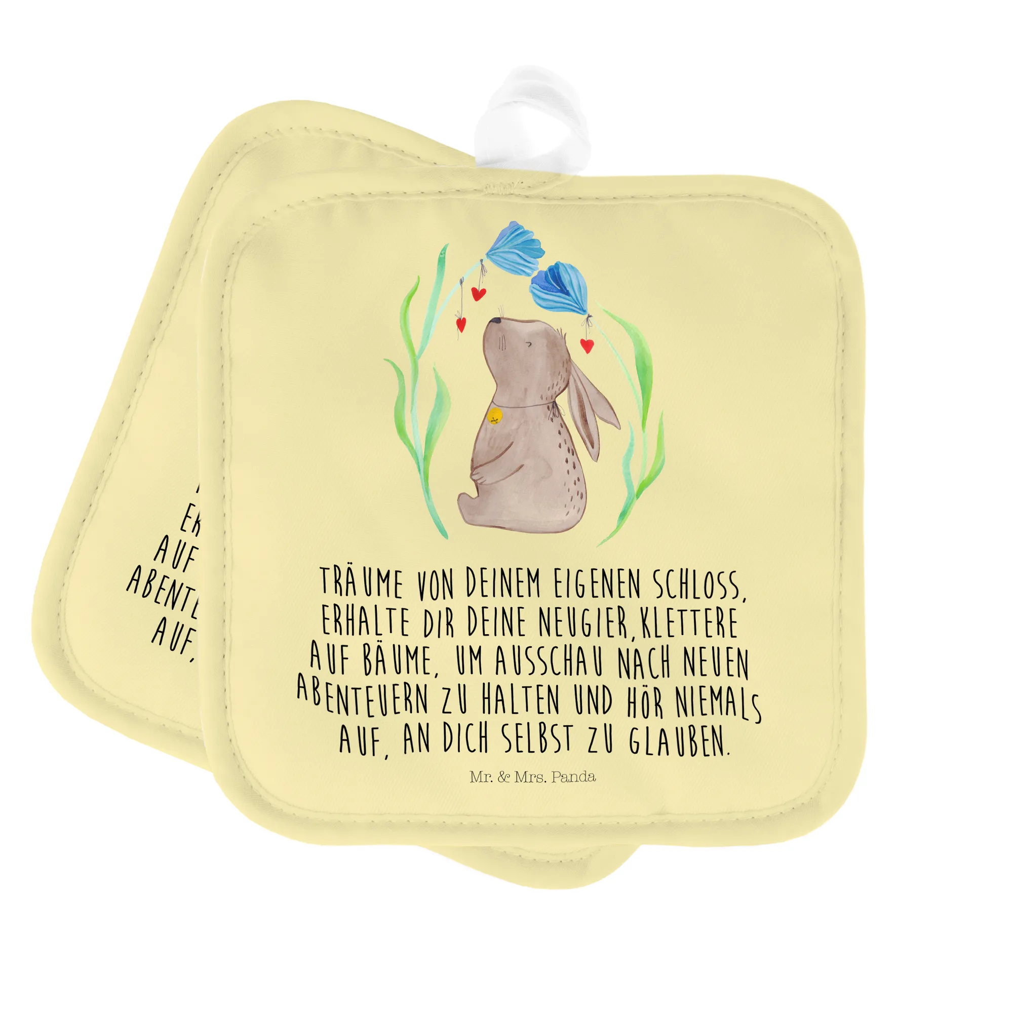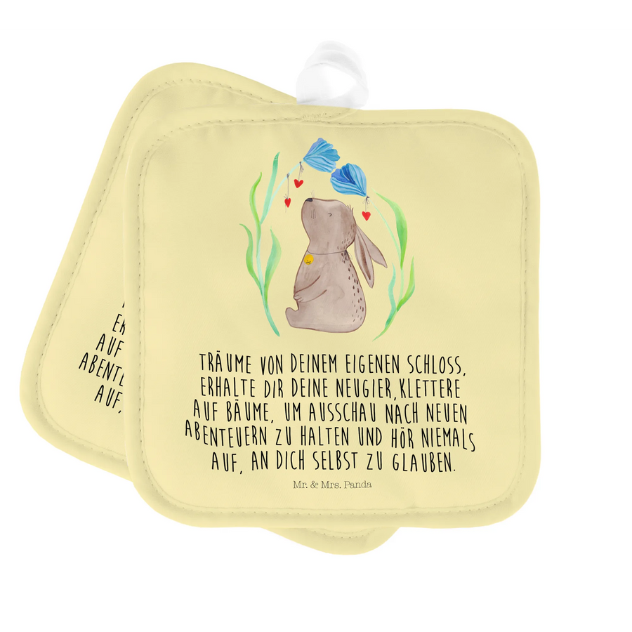2er Set Topflappen Hase Blume - mit Spruch - Gelb Pastell