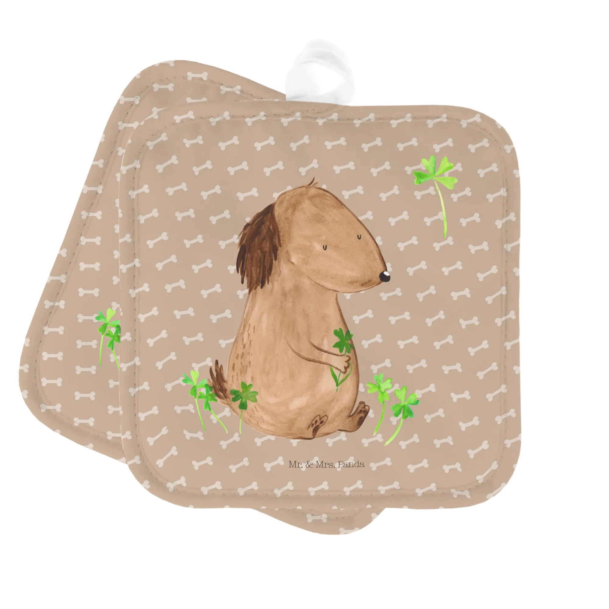 Entdecke die bunten und fröhlichen 2er Set Topflappen mit dem niedlichen Motiv Hund Kleeblatt von Mr. & Mrs. Panda!