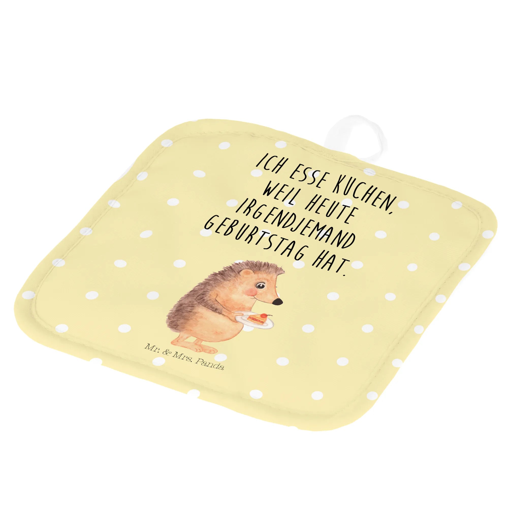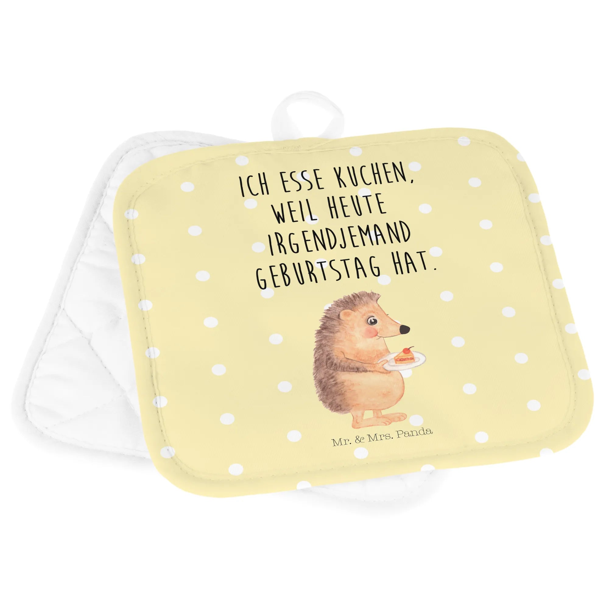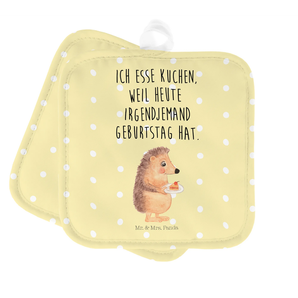 Diese zwei wunderschönen Topflappen von Mr. & Mrs. Panda sind mehr als nur Küchenhelfer – sie sind ein Stück gute Laune. Das niedliche Motiv zeigt einen fröhlichen Igel mit Schürze, der stolz ein Stück Kuchen präsentiert, begleitet vom lustigen Spruch: „Ich esse Kuchen, weil heute irgendjemand Geburtstag hat.“ Das pastellige Gelb zaubert einen warmen Akzent in deine Küche.