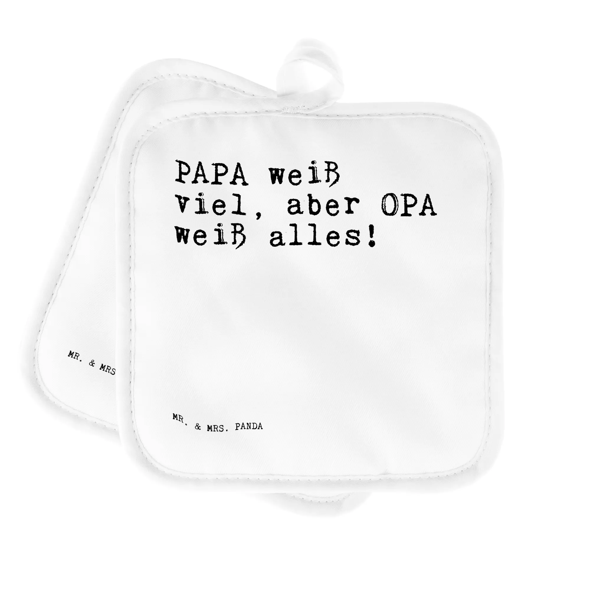 Die 2er Set Topflappen "PAPA weiß viel, aber OPA weiß alles!" von Mr. & Mrs. Panda sind das perfekte Geschenk für all jene, die Wert auf stilvolle und humorvolle Küchenausstattung legen. Diese wunderschön gestalteten Topflappen sind nicht nur praktisch, sondern bringen auch eine gehörige Portion Persönlichkeit in deine Küche. Hergestellt aus hochwertiger Kunstfaser, sind sie besonders hitzebeständig und strapazierfähig.