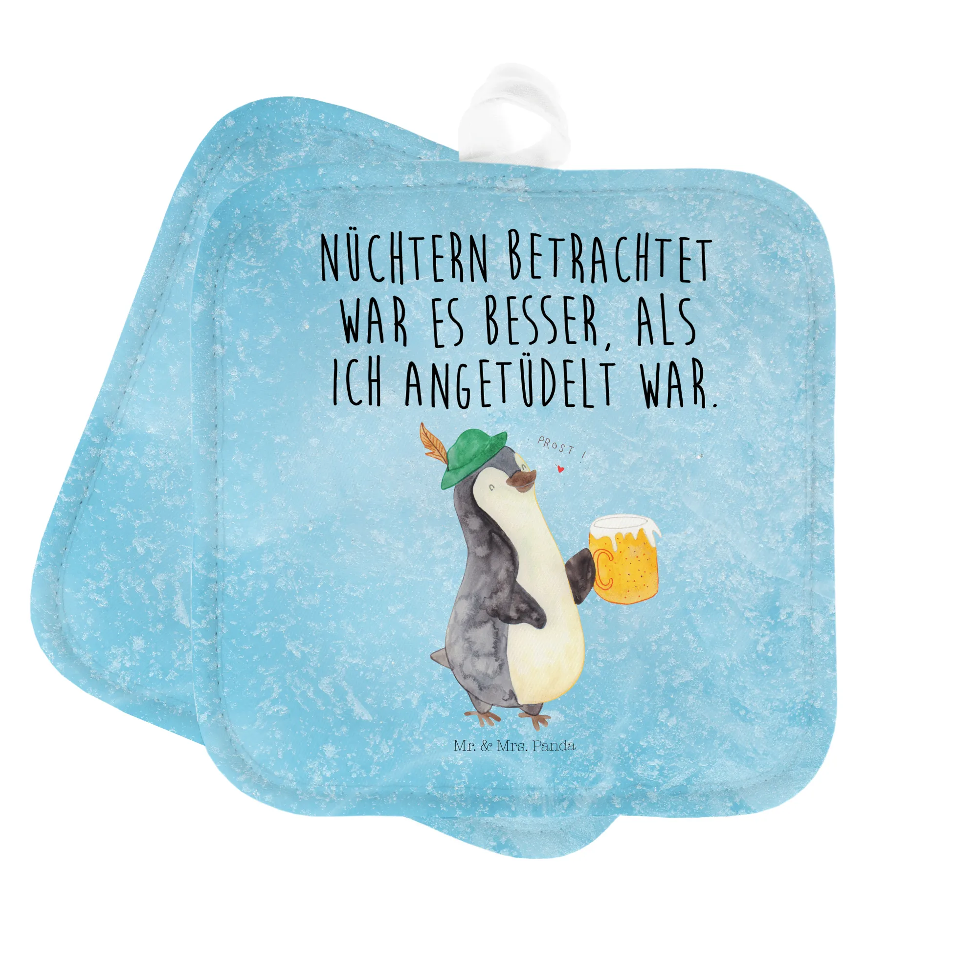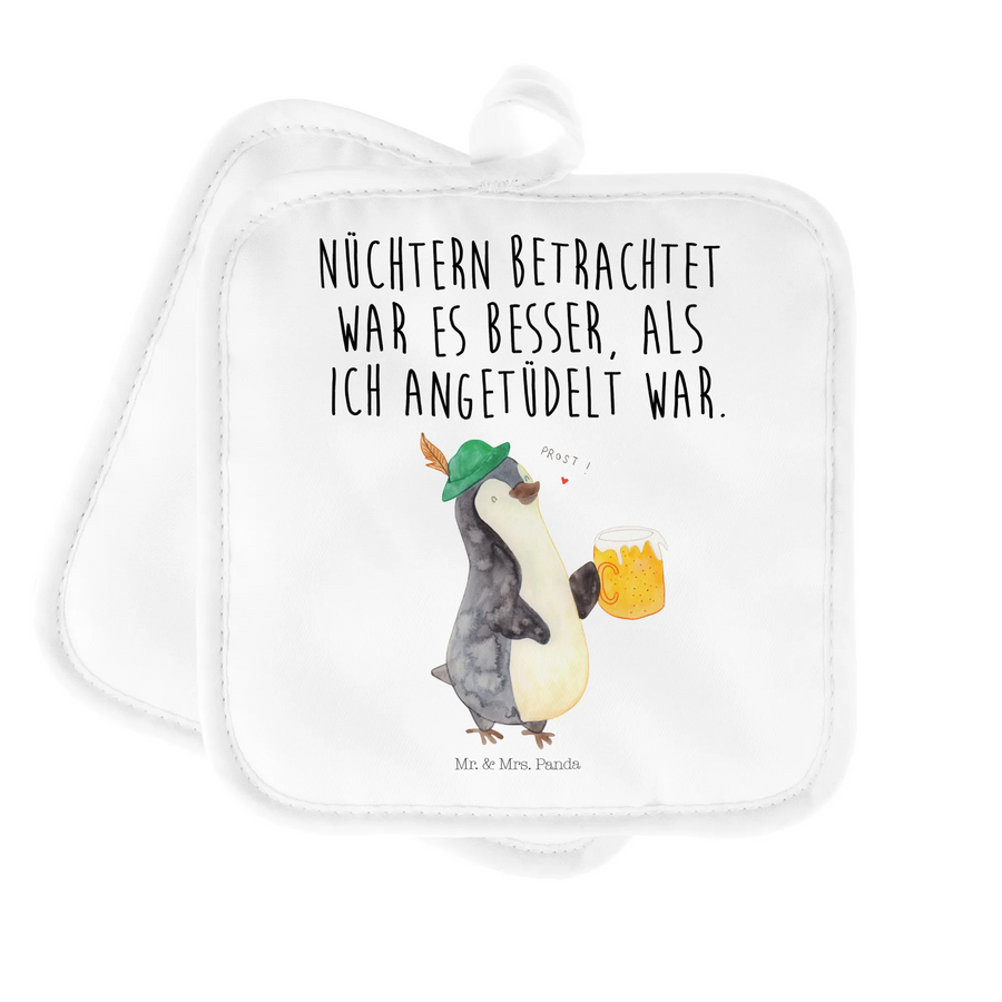 Entdecke das perfekte Geschenk für alle Freunde der bayrischen Kultur und Pinguin-Liebhaber mit unserem wunderschönen 2er Set Topflappen "Pinguin Bier" von Mr. & Mrs. Panda! Diese Topflappen sind nicht nur ein praktisches Küchenaccessoire, sondern auch ein echter Blickfang. Mit einem niedlichen Pinguin, der ein Maß Bier in der Hand hat und in bayerischer Tracht gekleidet ist, zauberst du jedem ein Lächeln ins Gesicht. Perfekt geeignet für Deine nächste Oktoberfest-Feier oder eine gesellige Runde zu Hause. Die Sprüche auf den Topflappen sorgen zusätzlich für gute Laune!