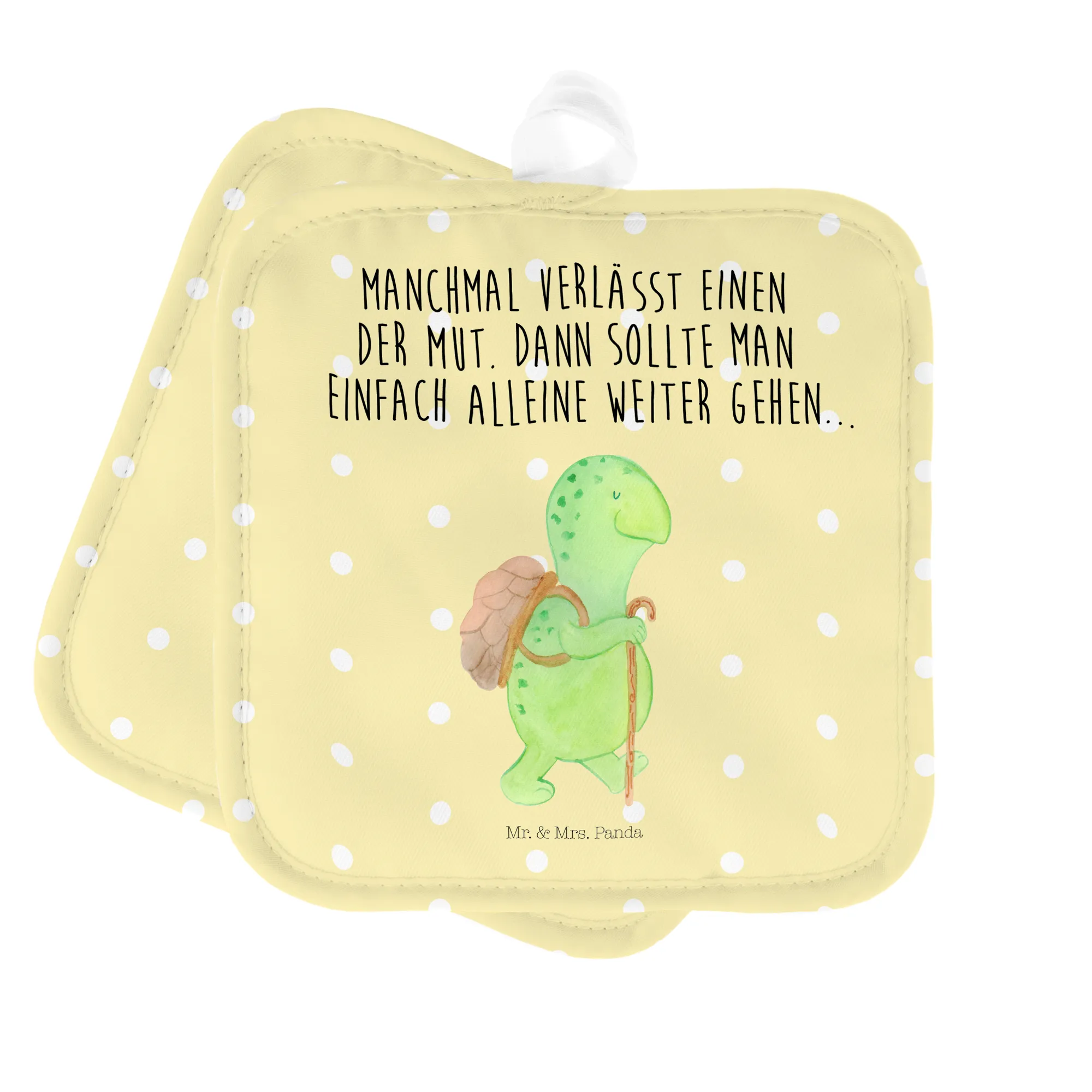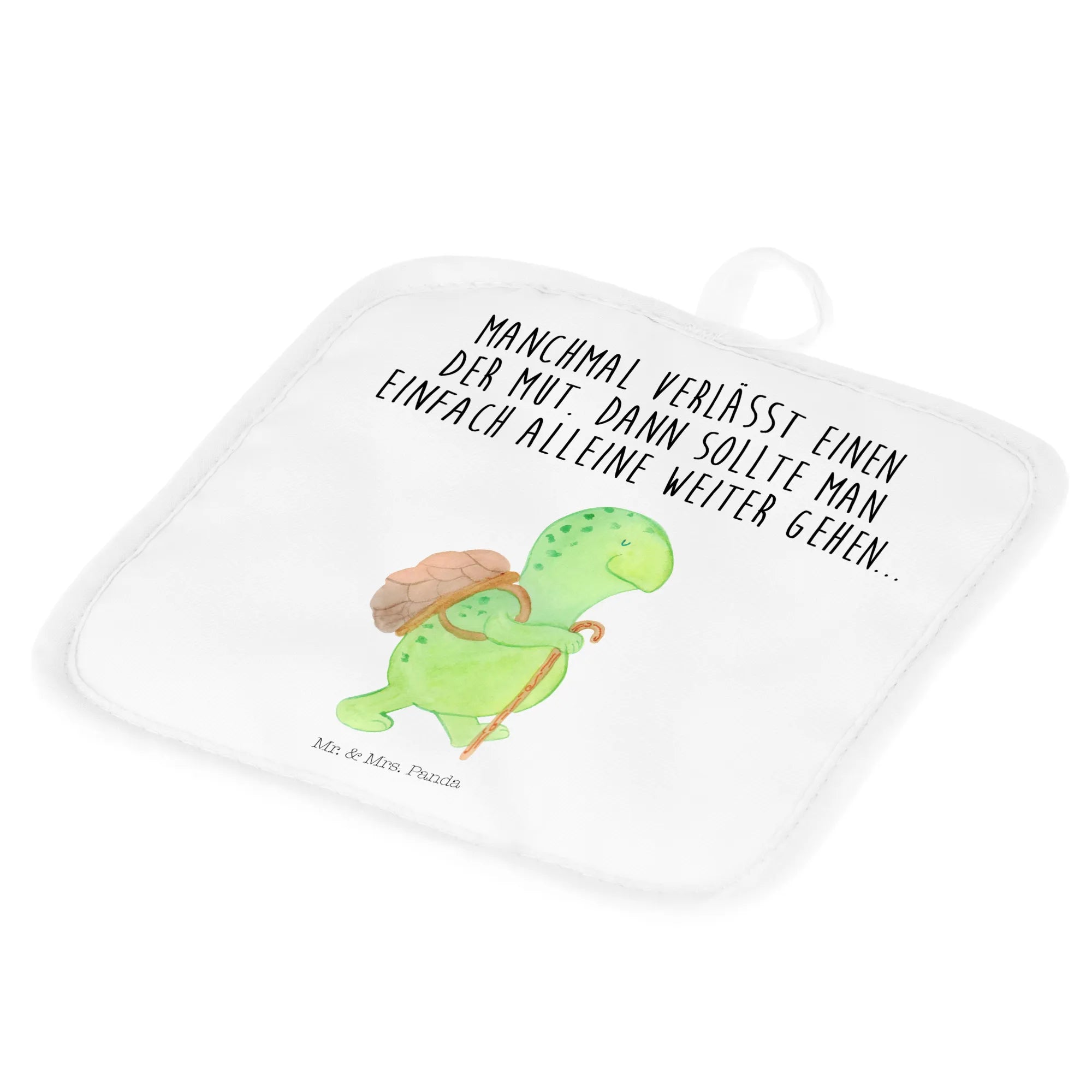 Entdecke unser 2er Set Topflappen „Schildkröte Wanderer“ von Mr. & Mrs. Panda 🐢✨ – ein bezauberndes Topflappenset aus der liebevoll gestalteten Schildkröten-Kollektion. Die kleine Schildkröte mit Panzer-Rucksack und Gehstock strahlt Abenteuerlust und Herzenswärme aus, während der Spruch „Manchmal verlässt einen der Mut. Dann sollte man einfach alleine weiter gehen...“ sanft ermutigt und inspiriert.