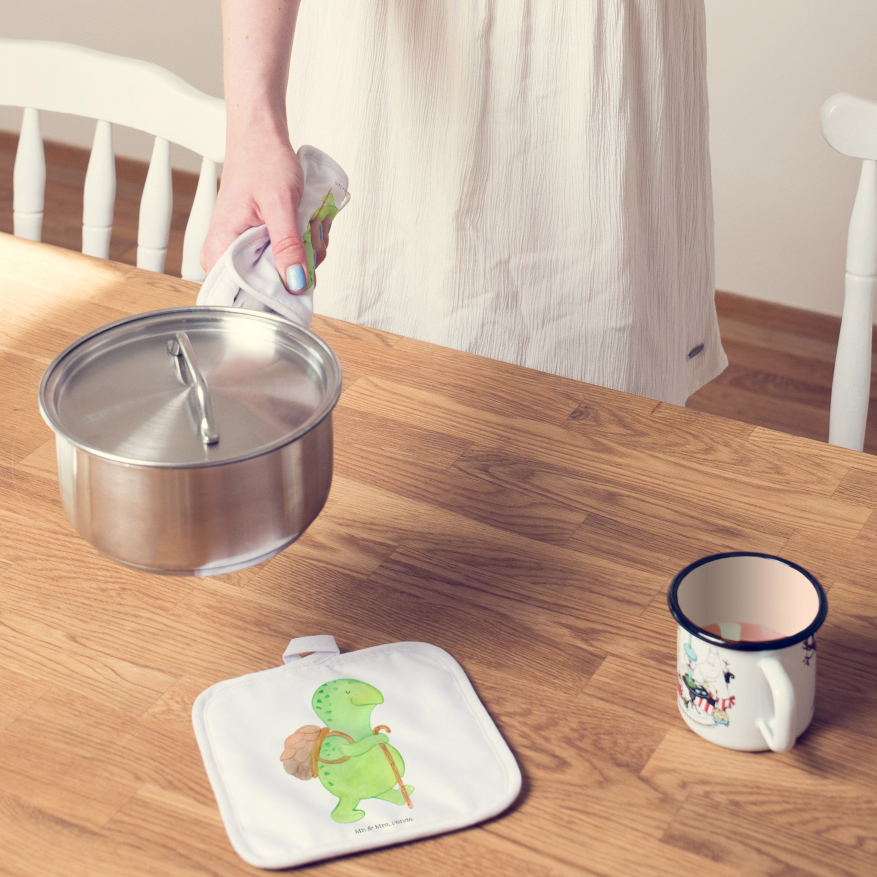 Unsere Topflappen sind einseitig bedruckt mit dem handgezeichneten Aquarellmotiv von Mrs. Panda und kommen mit praktischer Aufhängeschlaufe. Sie passen perfekt in jede Küche und sind ideale Geschenke für besondere Anlässe wie Einzug, Geburtstag oder als kleine Aufmunterung nach einem Neuanfang.