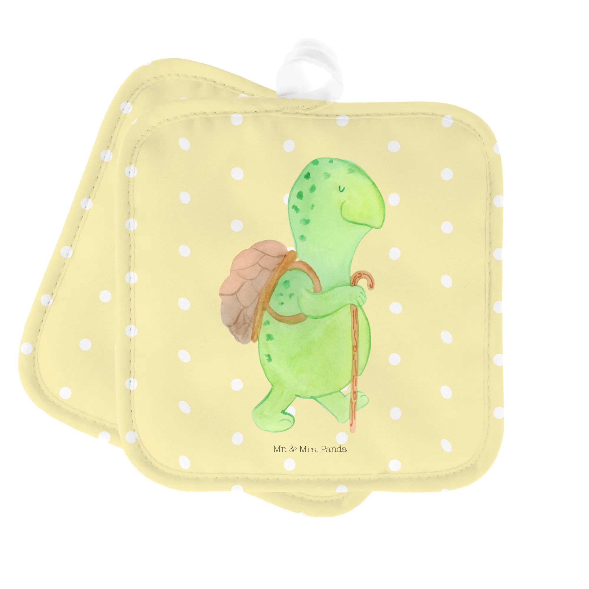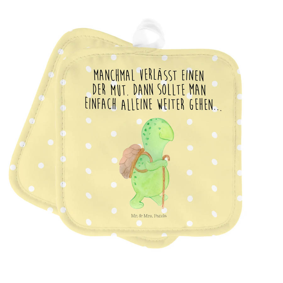 2er Set Topflappen Schildkröte Wanderer - mit Spruch - Gelb Pastell